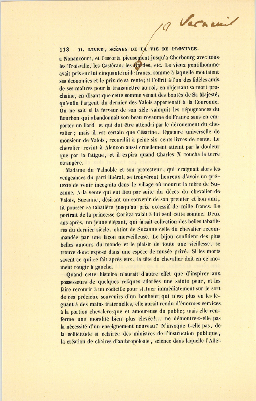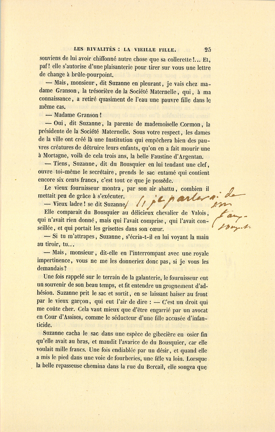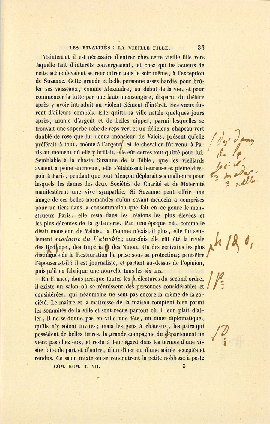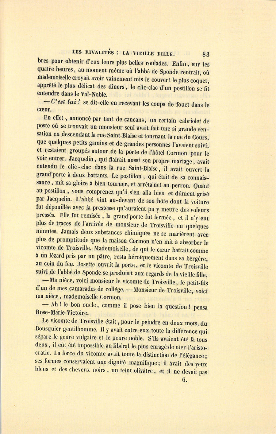 {p. 33} Maintenant il est nécessaire d’entrer chez cette vieille fille vers laquelle tant d’intérêts convergeaient, et chez qui les acteurs de cette scène devaient se rencontrer tous le soir même, à l’exception de Suzanne. Cette grande et belle personne assez hardie pour brûler ses vaisseaux, comme Alexandre, au début de la vie, et pour commencer la lutte par une faute mensongère, disparut du théâtre après y avoir introduit un violent élément d’intérêt. Ses vœux furent d’ailleurs comblés. Elle quitta sa ville natale quelques jours après, munie d’argent et de belles nippes, parmi lesquelles se trouvait une superbe robe de reps vert et un délicieux chapeau vert doublé de rose que lui donna monsieur de Valois, présent qu’elle préférait à tout, même à l’argent des dames de la Société Maternelle. Si le chevalier fût venu à Paris au moment où elle y brillait, elle eût certes tout quitté pour lui. Semblable à la chaste Suzanne de la Bible, que les vieillards avaient à peine entrevue, elle s’établissait heureuse et pleine d’espoir à Paris, pendant que tout Alençon déplorait ses malheurs pour lesquels les dames des deux Sociétés de Charité et de Maternité manifestèrent une vive sympathie. Si Suzanne peut offrir une image de ces belles normandes qu’un savant médecin a comprises pour un tiers dans la consommation que fait en ce genre le monstrueux Paris, elle resta dans les régions les plus élevées et les plus décentes de la galanterie. Par une époque où, comme le disait monsieur de Valois, la Femme n’existait plus, elle fut seulement madame du Valnoble ; autrefois elle eût été la rivale des Rhodope, des Impéria, des Ninon. Un des écrivains les plus distingués de la Restauration l’a prise sous sa protection ; peut-être l’épousera-t-il ? il est journaliste, et partant au-dessus de l’opinion, puisqu’il en fabrique une nouvelle tous les six ans.