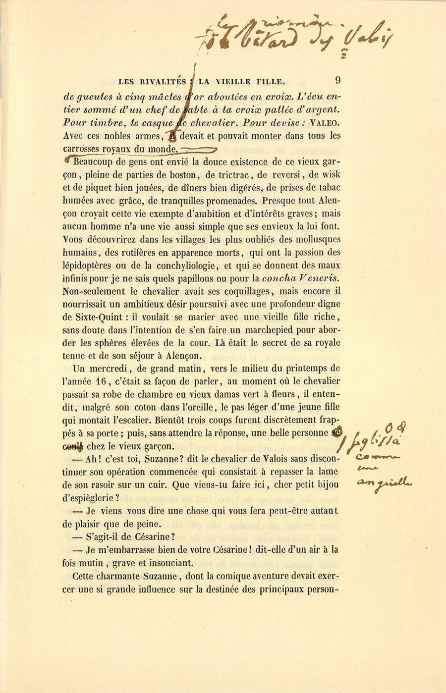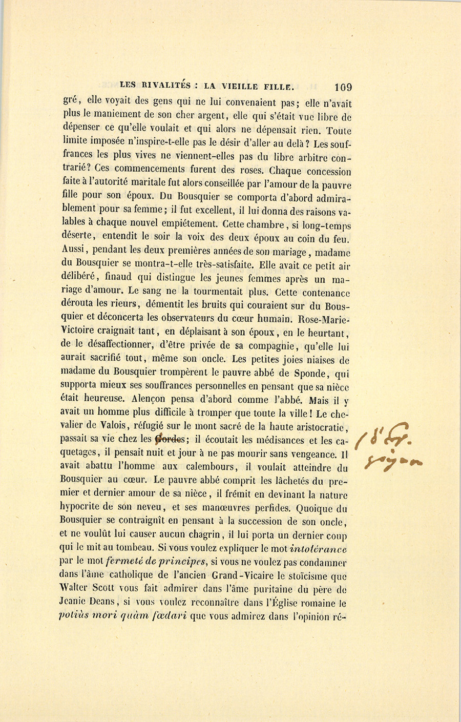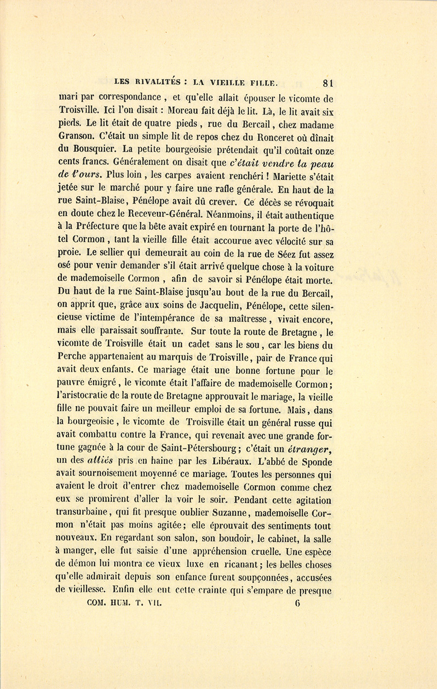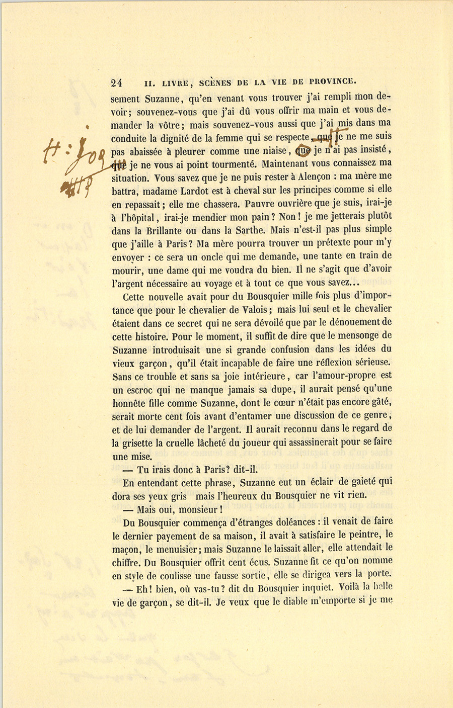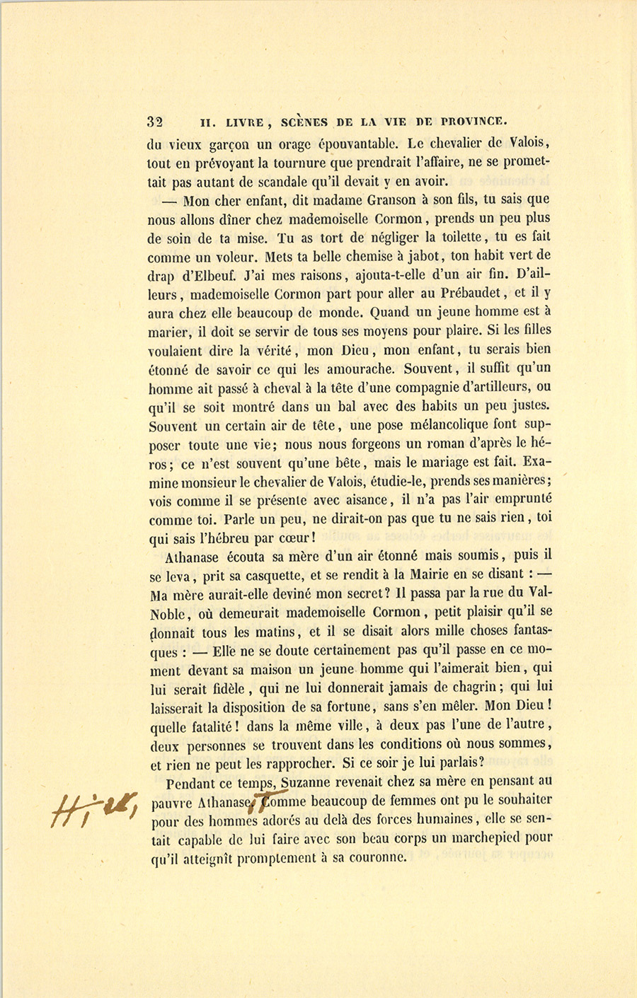 {p. 33} Maintenant il est nécessaire d’entrer chez cette vieille fille vers laquelle tant d’intérêts convergeaient, et chez qui les acteurs de cette scène devaient se rencontrer tous le soir même, à l’exception de Suzanne. Cette grande et belle personne assez hardie pour brûler ses vaisseaux, comme Alexandre, au début de la vie, et pour commencer la lutte par une faute mensongère, disparut du théâtre après y avoir introduit un violent élément d’intérêt. Ses vœux furent d’ailleurs comblés. Elle quitta sa ville natale quelques jours après, munie d’argent et de belles nippes, parmi lesquelles se trouvait une superbe robe de reps vert et un délicieux chapeau vert doublé de rose que lui donna monsieur de Valois, présent qu’elle préférait à tout, même à l’argent des dames de la Société Maternelle. Si le chevalier fût venu à Paris au moment où elle y brillait, elle eût certes tout quitté pour lui. Semblable à la chaste Suzanne de la Bible, que les vieillards avaient à peine entrevue, elle s’établissait heureuse et pleine d’espoir à Paris, pendant que tout Alençon déplorait ses malheurs pour lesquels les dames des deux Sociétés de Charité et de Maternité manifestèrent une vive sympathie. Si Suzanne peut offrir une image de ces belles normandes qu’un savant médecin a comprises pour un tiers dans la consommation que fait en ce genre le monstrueux Paris, elle resta dans les régions les plus élevées et les plus décentes de la galanterie. Par une époque où, comme le disait monsieur de Valois, la Femme n’existait plus, elle fut seulement madame du Valnoble ; autrefois elle eût été la rivale des Rhodope, des Impéria, des Ninon. Un des écrivains les plus distingués de la Restauration l’a prise sous sa protection ; peut-être l’épousera-t-il ? il est journaliste, et partant au-dessus de l’opinion, puisqu’il en fabrique une nouvelle tous les six ans.