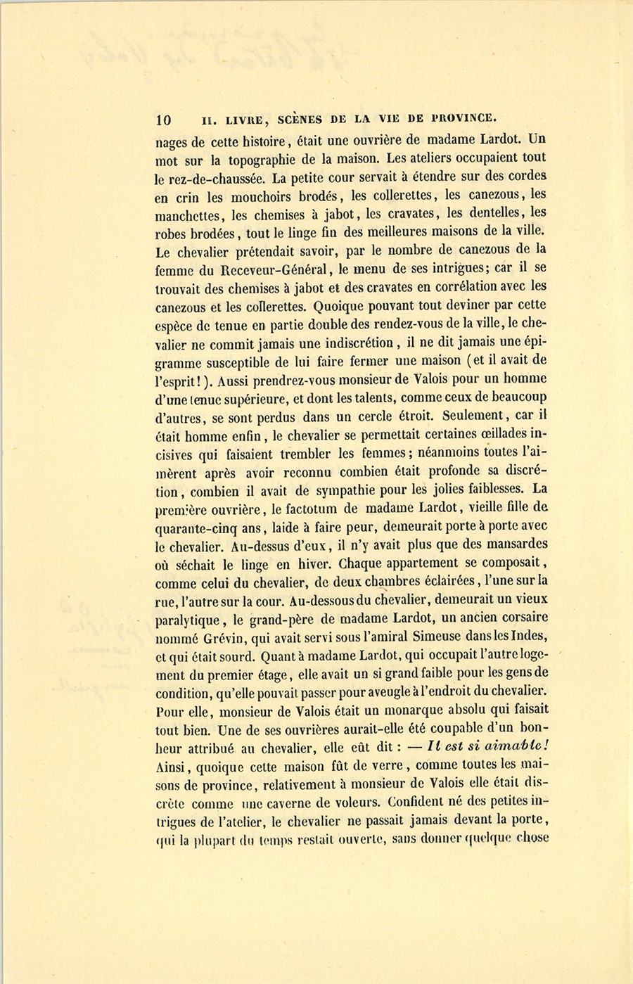Cette charmante Suzanne, dont la comique aventure devait exercer une si grande influence sur la destinée des principaux {p. 10} personnages de cette histoire, était une ouvrière de madame Lardot. Un mot sur la topographie de la maison. Les ateliers occupaient tout le rez-de-chaussée. La petite cour servait à étendre sur des cordes en crin les mouchoirs brodés, les collerettes, les canezous, les manchettes, les chemises à jabot, les cravates, les dentelles, les robes brodées, tout le linge fin des meilleures maisons de la ville. Le chevalier prétendait savoir, par le nombre de canezous de la femme du Receveur-Général, le menu de ses intrigues ; car il se trouvait des chemises à jabot et des cravates en corrélation avec les canezous et les collerettes. Quoique pouvant tout deviner par cette espèce de tenue en partie double des rendez-vous de la ville, le chevalier ne commit jamais une indiscrétion, il ne dit jamais une épigramme susceptible de lui faire fermer une maison (et il avait de l’esprit !). Aussi prendrez-vous monsieur de Valois pour un homme d’une tenue supérieure, et dont les talents, comme ceux de beaucoup d’autres, se sont perdus dans un cercle étroit. Seulement, car il était homme enfin, le chevalier se permettait certaines œillades incisives qui faisaient trembler les femmes ; néanmoins toutes l’aimèrent après avoir reconnu combien était profonde sa discrétion, combien il avait de sympathie pour les jolies faiblesses. La première ouvrière, le factotum de madame Lardot, vieille fille de quarante-cinq ans, laide à faire peur, demeurait porte à porte avec le chevalier. Au-dessus d’eux, il n’y avait plus que des mansardes où séchait le linge en hiver. Chaque appartement se composait, comme celui du chevalier, de deux chambres éclairées, l’une sur la rue, l’autre sur la cour. Au-dessous du chevalier, demeurait un vieux paralytique, le grand-père de madame Lardot, un ancien corsaire nommé Grévin, qui avait servi sous l’amiral Simeuse dans les Indes, et qui était sourd. Quant à madame Lardot, qui occupait l’autre logement du premier étage, elle avait un si grand faible pour les gens de condition, qu’elle pouvait passer pour aveugle à l’endroit du chevalier. Pour elle, monsieur de Valois était un monarque absolu qui faisait tout bien. Une de ses ouvrières aurait-elle été coupable d’un bonheur attribué au chevalier, elle eût dit : – Il est si aimable ! Ainsi, quoique cette maison fût de verre, comme toutes les maisons de province, relativement à monsieur de Valois elle était discrète comme une caverne de voleurs. Confident né des petites intrigues de l’atelier, le chevalier ne passait jamais devant la porte, qui la plupart du temps restait ouverte, sans donner quelque chose {p. 11} à ses petites chattes : du chocolat, des bonbons, des rubans, des dentelles, une croix d’or, toutes sortes de mièvreries dont raffolent les grisettes. Aussi le bon chevalier était-il adoré de ces petites filles. Les femmes ont un instinct qui leur fait deviner les hommes qui les aiment par cela seulement qu’elles portent une jupe, qui sont heureux d’être près d’elles, et qui ne pensent jamais à demander sottement l’intérêt de leur galanterie. Les femmes ont sous ce rapport le flair du chien, qui dans une compagnie va droit à l’homme pour qui les bêtes sont sacrées. Le pauvre chevalier de Valois conservait, de sa première vie, le besoin de protection galante qui distinguait autrefois le grand seigneur. Toujours fidèle au système de la petite maison, il aimait à enrichir les femmes, les seuls êtres qui sachent bien recevoir parce qu’ils peuvent toujours rendre. N’est-il pas extraordinaire que, par un temps où les écoliers cherchent, au sortir du collége, à dénicher un symbole ou à trier des mythes, personne n’ait encore expliqué les filles du dix-huitième siècle ? N’était-ce pas le tournoi du quinzième siècle ? En 1550, les chevaliers se battaient pour les dames ; en 1750, ils montraient leurs maîtresses à Longchamps ; aujourd’hui, ils font courir leurs chevaux ; à toutes les époques, le gentilhomme a tâché de se créer une façon de vivre qui ne fût qu’à lui. Les souliers à la poulaine du quatorzième siècle étaient les talons rouges du dix-huitième, et le luxe des maîtresses était en 1750 une ostentation semblable à celle des sentiments de la Chevalerie-Errante. Mais le chevalier ne pouvait plus se ruiner pour une maîtresse ! Au lieu de bonbons enveloppés de billets de caisse, il offrait galamment un sac de pures croquignoles. Disons-le à la gloire d’Alençon, ces croquignoles étaient acceptées plus joyeusement que la Duthé ne reçut jadis une toilette en vermeil ou quelque équipage du comte d’Artois. Toutes ces grisettes avaient compris la majesté déchue du chevalier de Valois, et lui gardaient un profond secret sur leurs familiarités intérieures. Les questionnait-on en ville dans quelques maisons sur le chevalier de Valois, elles parlaient gravement du gentilhomme, elles le vieillissaient ; il devenait un respectable monsieur de qui la vie était une fleur de sainteté ; mais, au logis, elles lui auraient monté sur les épaules comme des perroquets. Il aimait à savoir les secrets que découvrent les blanchisseuses au sein des ménages, elles venaient donc le matin lui raconter les cancans d’Alençon ; il les appelait ses gazettes en cotillon, ses feuilletons vivants : jamais {p. 12} monsieur de Sartines n’eut d’espions si intelligents, ni moins chers, et qui eussent conservé autant d’honneur en déployant autant de friponnerie dans l’esprit. Notez que, pendant son déjeuner, le chevalier s’amusait comme un bienheureux.