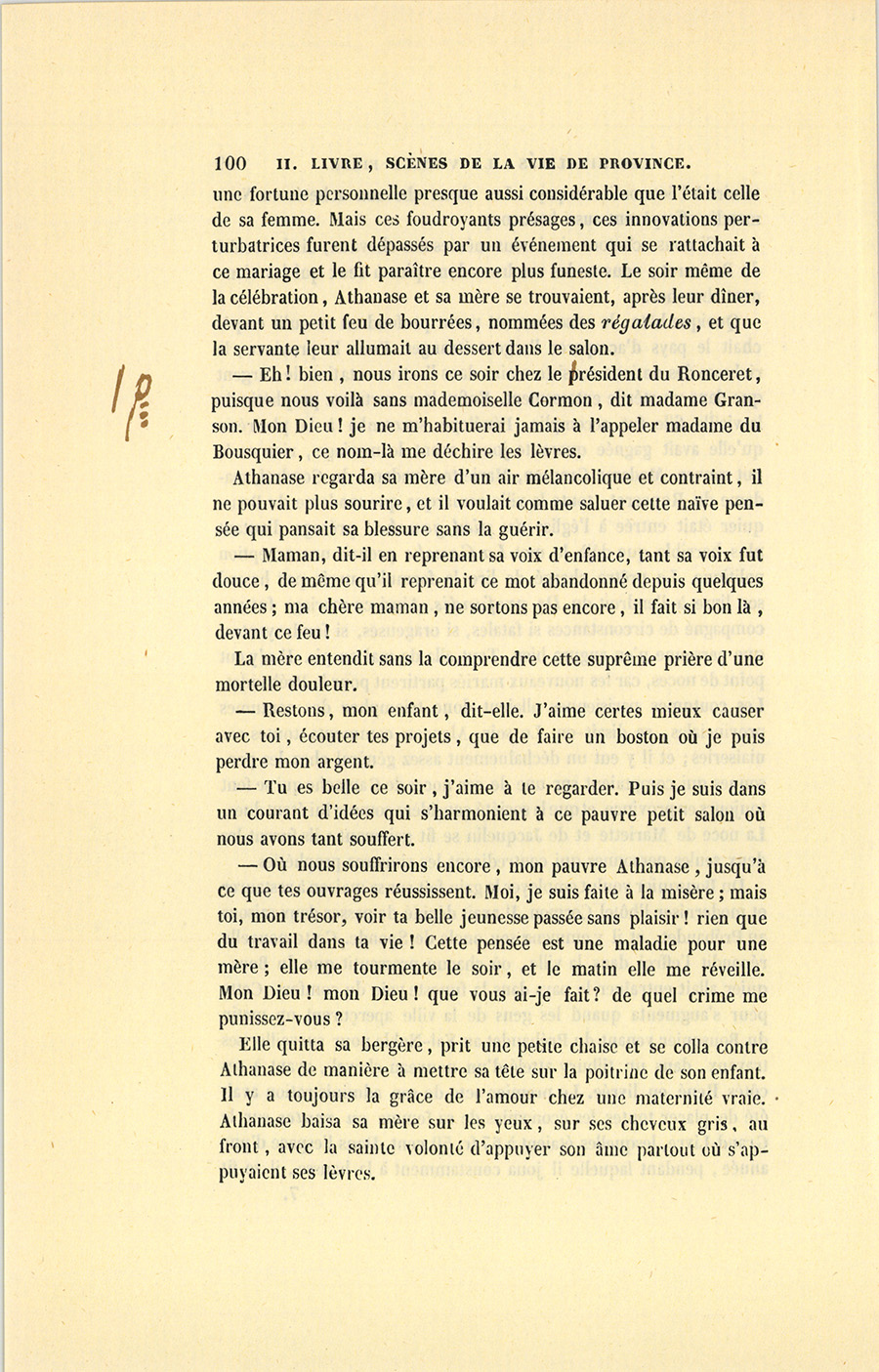 Du Bousquier voulut employer le gain fait sur sa maison à restaurer et moderniser l’hôtel Cormon. Il avait décidé de passer deux saisons au Prébaudet, et il y emmena son oncle de Sponde. Cette nouvelle répandit l’effroi dans la ville, où chacun pressentit que du Bousquier allait entraîner le pays dans la funeste voie du comfort. Cette peur s’augmenta quand les gens de la ville aperçurent un matin du Bousquier venant du Prébaudet au Val-Noble pour surveiller ses travaux, dans un tilbury attelé d’un nouveau cheval, ayant à ses côtés René en livrée. Le premier acte de son administration avait été de placer toutes les économies de sa femme en rentes sur le Grand-Livre, lesquelles étaient à 67 fr. 50 cent. Dans l’espace d’une année, pendant laquelle il joua constamment à la hausse, il se fit {p. 100} une fortune personnelle presque aussi considérable que l’était celle de sa femme. Mais ces foudroyants présages, ces innovations perturbatrices furent dépassés par un événement qui se rattachait à ce mariage et le fit paraître encore plus funeste. Le soir même de la célébration, Athanase et sa mère se trouvaient, après leur dîner, devant un petit feu de bourrées, nommées des régalades, et que la servante leur allumait au dessert dans le salon.