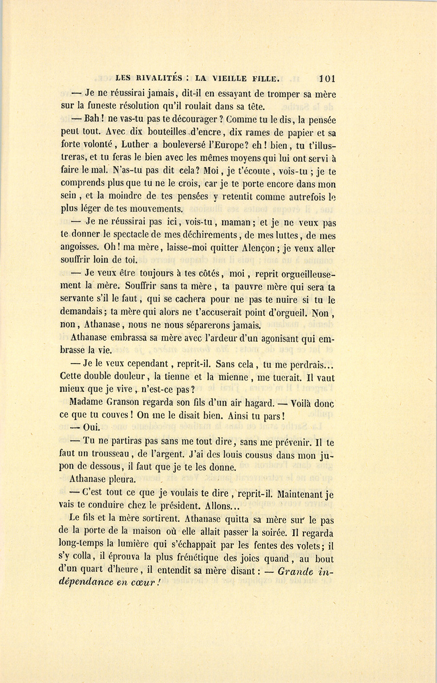 Le fils et la mère sortirent. Athanase quitta sa mère sur le pas de la porte de la maison où elle allait passer la soirée. Il regarda long-temps la lumière qui s’échappait par les fentes des volets ; il s’y colla, il éprouva la plus frénétique des joies quand, au bout d’un quart d’heure, il entendit sa mère disant : – Grande indépendance en cœur !