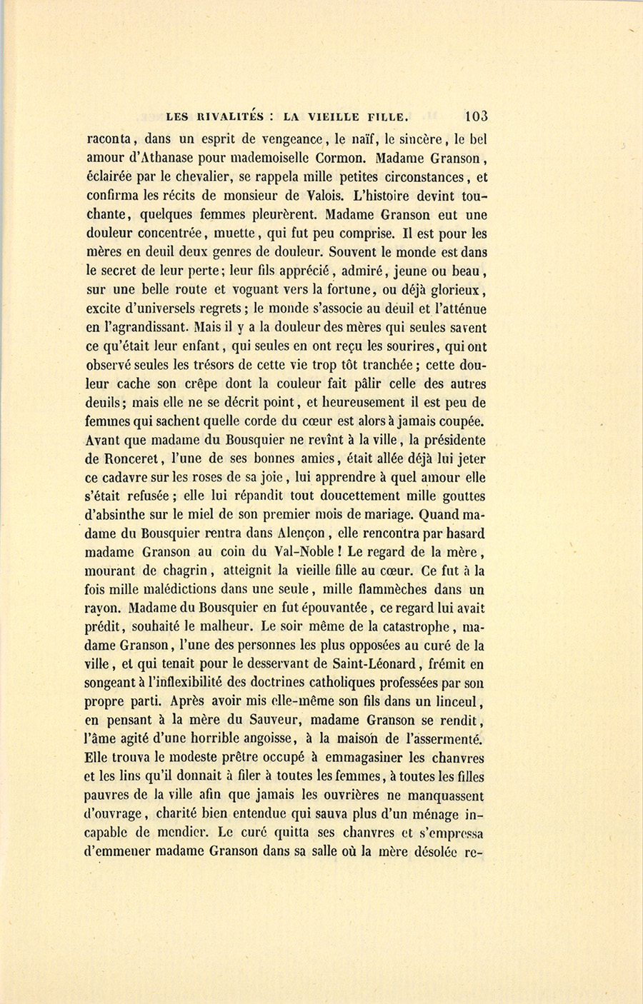 Mal jugée par le monde, qui commença par lui donner tort, la chrétienne trouva, dans son intérieur, une ample carrière à déployer ses vertus. Elle vécut dans les larmes et ne cessa d’offrir au monde un visage placide. Pour une âme pieuse, n’était-ce pas un crime que cette pensée qui lui becqueta toujours le cœur : J’aimais le chevalier de Valois, et je suis la femme de du Bousquier ! L’amour d’Athanase se dressait aussi sous la forme d’un remords et la poursuivait dans ses rêves. La mort de son oncle, dont les chagrins avaient éclaté, lui rendit son avenir encore plus douloureux, car elle pensa toujours aux souffrances que son oncle dut éprouver en voyant le {p. 114} changement des doctrines politiques et religieuses de la maison Cormon. Souvent le malheur tombe avec la rapidité de la foudre, comme chez madame Granson ; mais il s’étendit, chez la vieille fille, comme une goutte d’huile qui ne quitte l’étoffe qu’après l’avoir lentement imbibée.