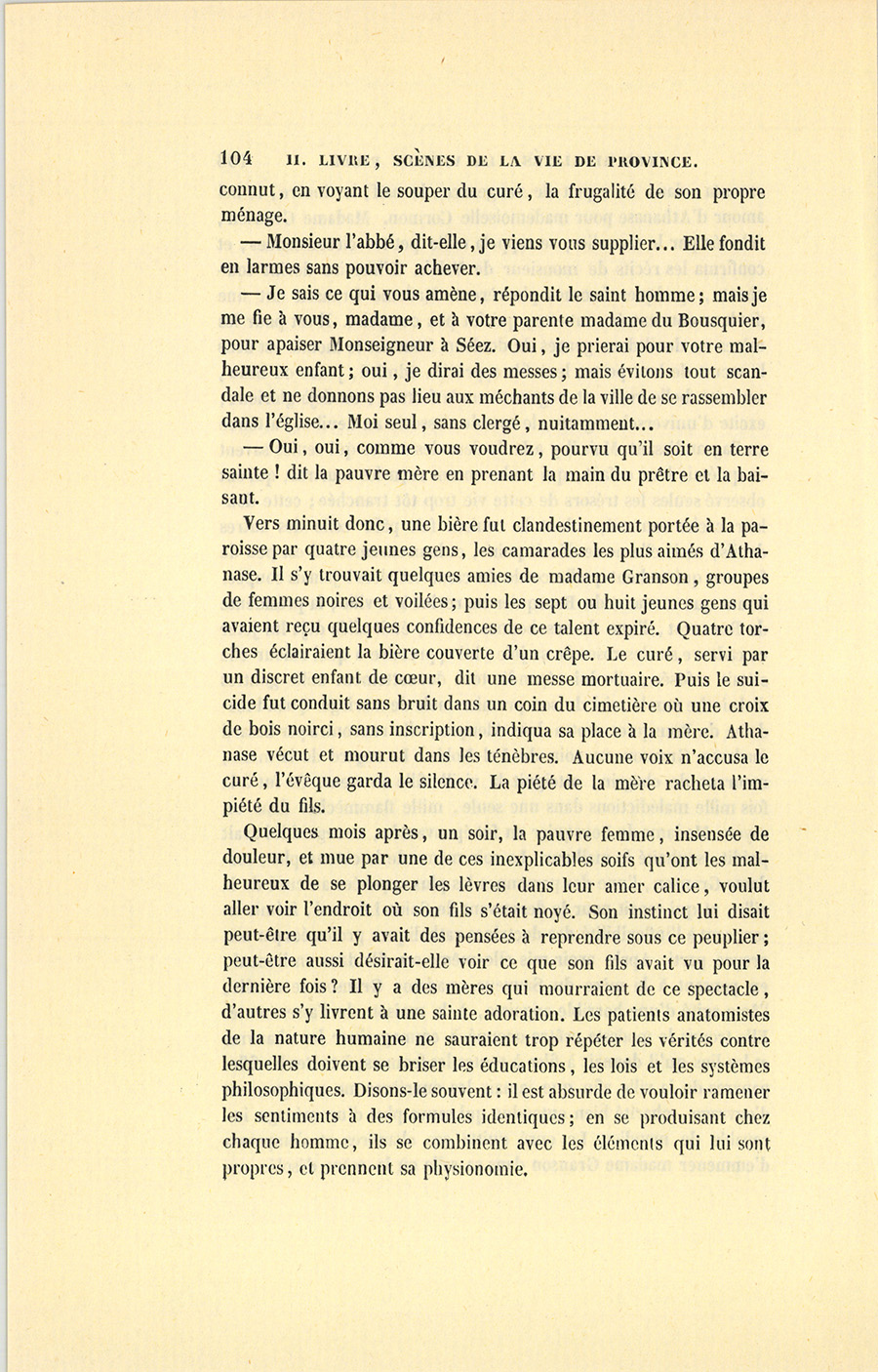 La Sarthe avait eu dans la matinée précédente une crue prévue par les pêcheurs. Ces crues d’eaux-troubles amènent des anguilles entraînées de leurs ruisseaux. Or, un pêcheur avait tendu ses engins dans l’endroit où s’était jeté le pauvre Athanase en croyant qu’on ne le retrouverait jamais. Vers six heures du matin, le pêcheur ramena ce jeune corps. Les deux ou trois amies qu’avait la pauvre veuve employèrent mille précautions pour la préparer à recevoir cette horrible dépouille. La nouvelle de ce suicide eut, comme on le pense bien, un grand retentissement dans Alençon. La veille, le pauvre homme de génie n’avait pas un seul protecteur ; le lendemain de sa mort, mille voix s’écrièrent : – « Je l’aurais si bien aidé, moi ! » Il est si commode de se poser charitable gratis. Ce suicide fut expliqué par le chevalier de Valois. Le gentilhomme {p. 103} raconta, dans un esprit de vengeance, le naïf, le sincère, le bel amour d’Athanase pour mademoiselle Cormon. Madame Granson, éclairée par le chevalier, se rappela mille petites circonstances, et confirma les récits de monsieur de Valois. L’histoire devint touchante, quelques femmes pleurèrent. Madame Granson eut une douleur concentrée, muette, qui fut peu comprise. Il est pour les mères en deuil deux genres de douleur. Souvent le monde est dans le secret de leur perte ; leur fils apprécié, admiré, jeune ou beau, sur une belle route et voguant vers la fortune, ou déjà glorieux, excite d’universels regrets ; le monde s’associe au deuil et l’atténue en l’agrandissant. Mais il y a la douleur des mères qui seules savent ce qu’était leur enfant, qui seules en ont reçu les sourires, qui ont observé seules les trésors de cette vie trop tôt tranchée ; cette douleur cache son crêpe dont la couleur fait pâlir celle des autres deuils ; mais elle ne se décrit point, et heureusement il est peu de femmes qui sachent quelle corde du cœur est alors à jamais coupée. Avant que madame du Bousquier ne revînt à la ville, la présidente du Ronceret20, l’une de ses bonnes amies, était allée déjà lui jeter ce cadavre sur les roses de sa joie, lui apprendre à quel amour elle s’était refusée ; elle lui répandit tout doucettement mille gouttes d’absinthe sur le miel de son premier mois de mariage. Quand madame du Bousquier rentra dans Alençon, elle rencontra par hasard madame Granson au coin du Val-Noble ! Le regard de la mère, mourant de chagrin, atteignit la vieille fille au cœur. Ce fut à la fois mille malédictions dans une seule, mille flammèches dans un rayon. Madame du Bousquier en fut épouvantée, ce regard lui avait prédit, souhaité le malheur. Le soir même de la catastrophe, madame Granson, l’une des personnes les plus opposées au curé de la ville, et qui tenait pour le desservant de Saint-Léonard, frémit en songeant à l’inflexibilité des doctrines catholiques professées par son propre parti. Après avoir mis elle-même son fils dans un linceul, en pensant à la mère du Sauveur, madame Granson se rendit, l’âme agitée21 d’une horrible angoisse, à la maison de l’assermenté. Elle trouva le modeste prêtre occupé à emmagasiner les chanvres et les lins qu’il donnait à filer à toutes les femmes, à toutes les filles pauvres de la ville afin que jamais les ouvrières ne manquassent d’ouvrage, charité bien entendue qui sauva plus d’un ménage incapable de mendier. Le curé quitta ses chanvres et s’empressa d’emmener madame Granson dans sa salle où la mère désolée {p. 104} reconnut, en voyant le souper du curé, la frugalité de son propre ménage.