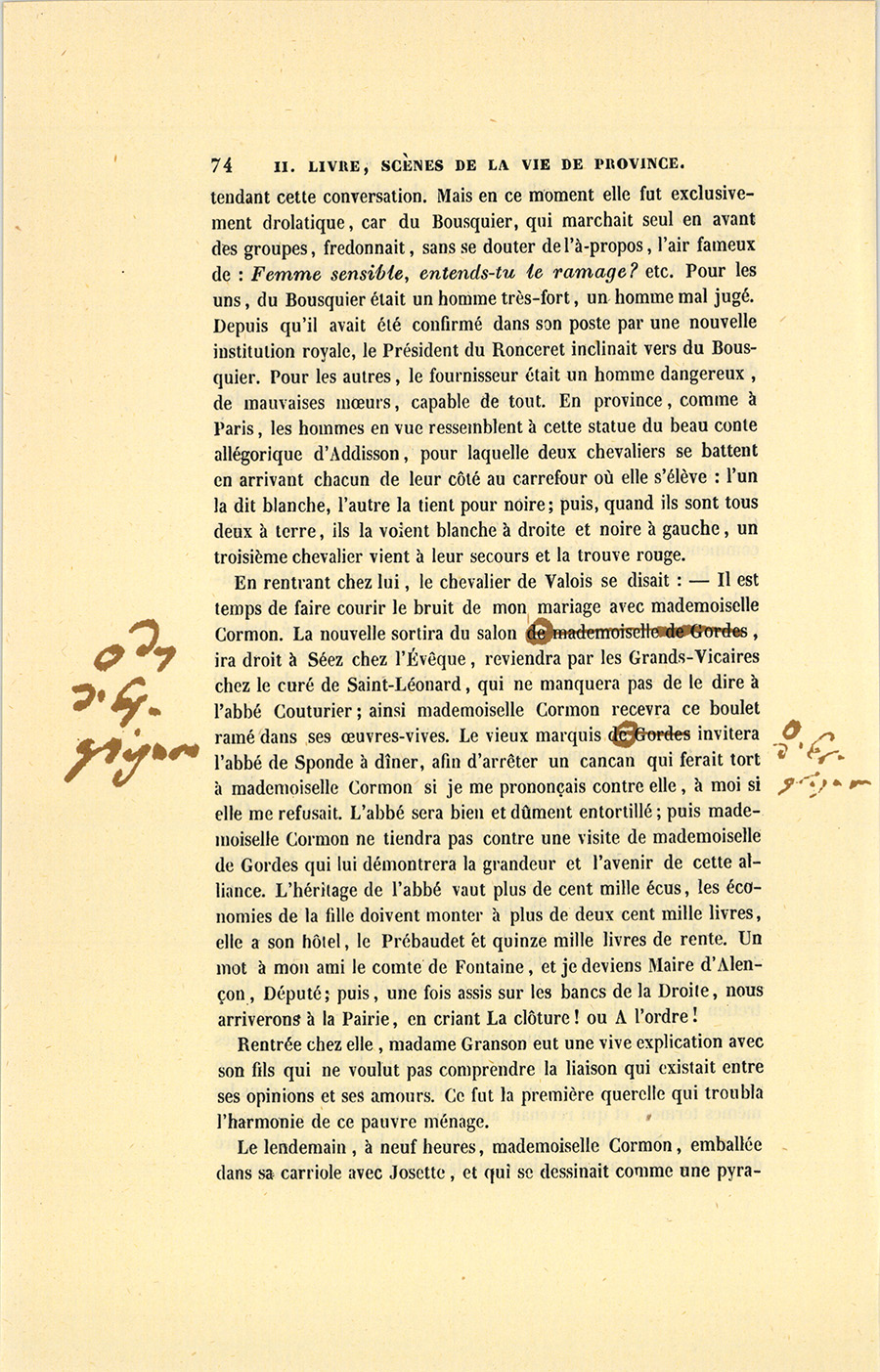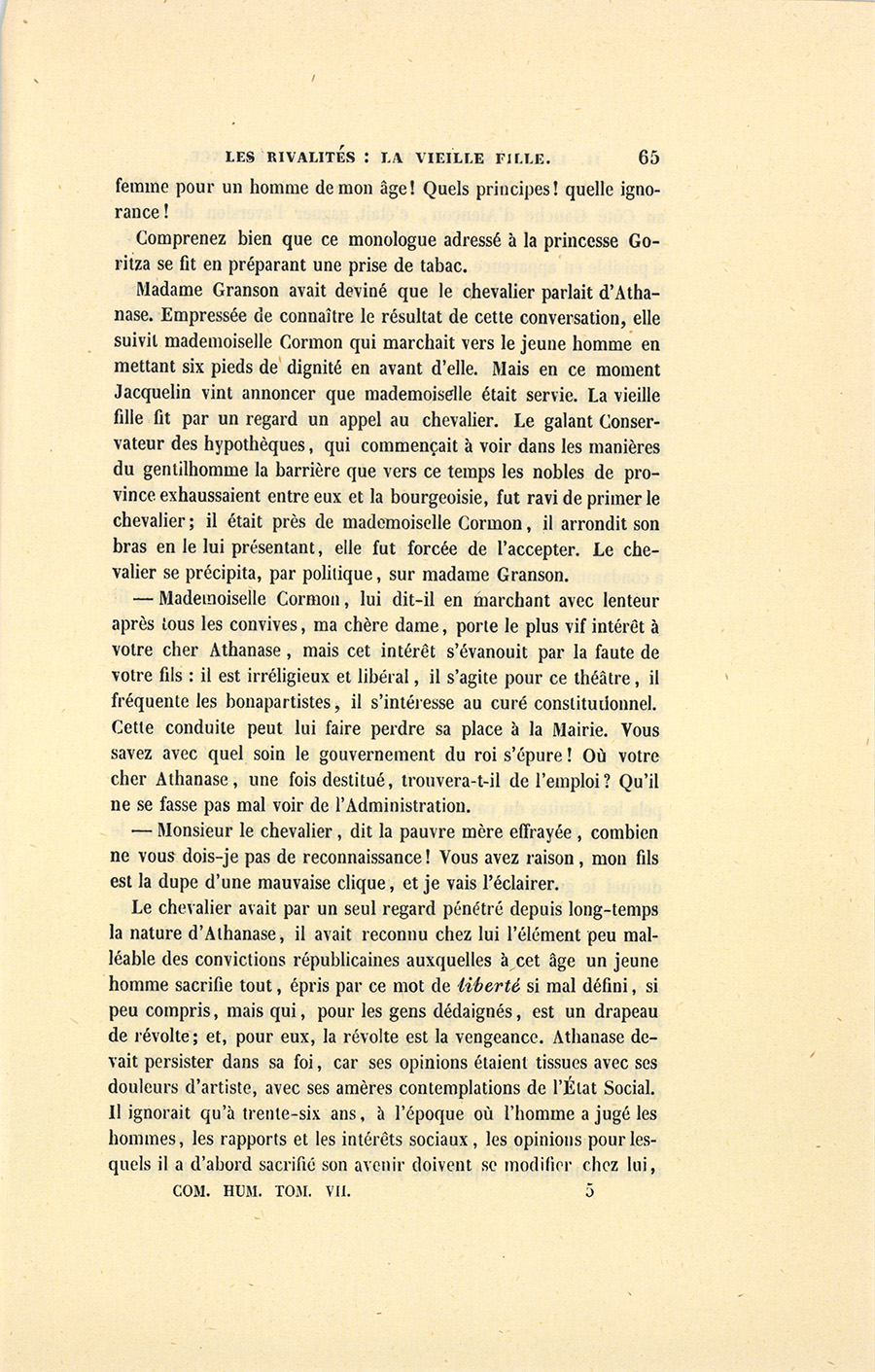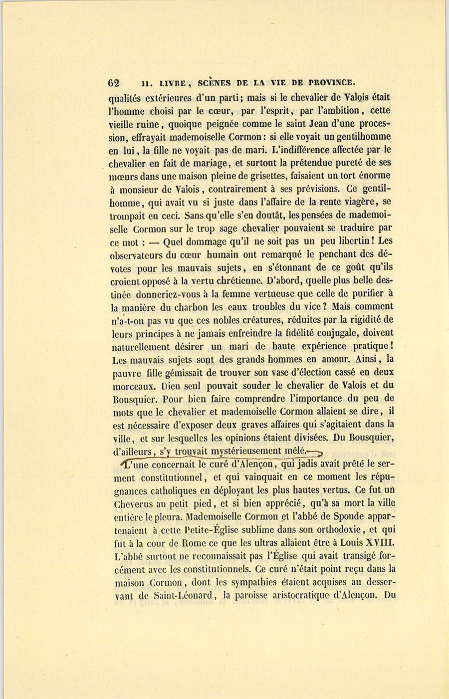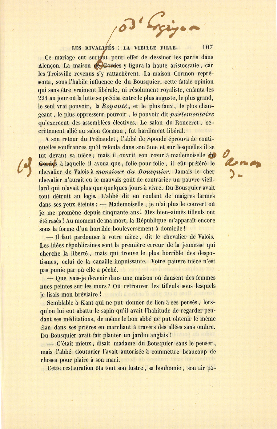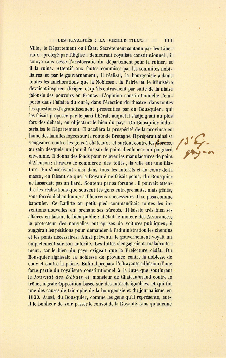 {p. 107} Ce mariage eut surtout pour effet de dessiner les partis dans Alençon. La maison d’Esgrignon y figura la haute aristocratie, car les Troisville revenus s’y rattachèrent. La maison Cormon représenta, sous l’habile influence de du Bousquier, cette fatale opinion qui sans être vraiment libérale, ni résolument royaliste, enfanta les 221 au jour où la lutte se précisa entre le plus auguste, le plus grand, le seul vrai pouvoir, la Royauté, et le plus faux, le plus changeant, le plus oppresseur pouvoir, le pouvoir dit parlementaire qu’exercent des assemblées électives. Le salon du Ronceret, secrètement allié au salon Cormon, fut hardiment libéral.