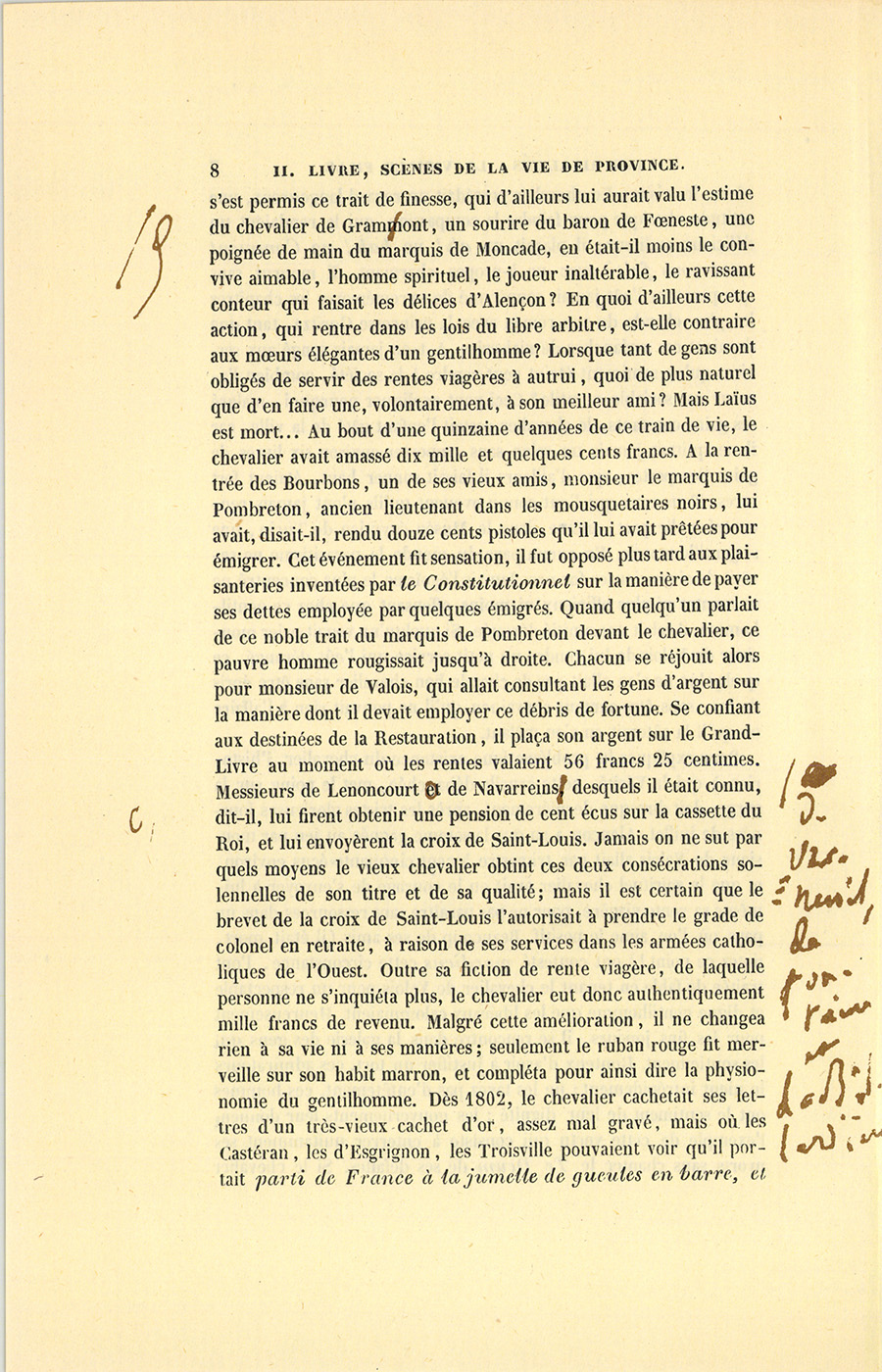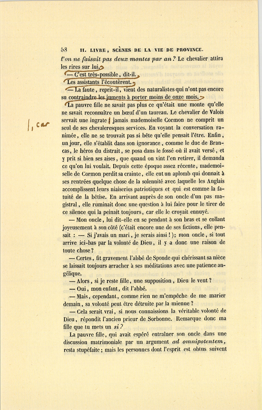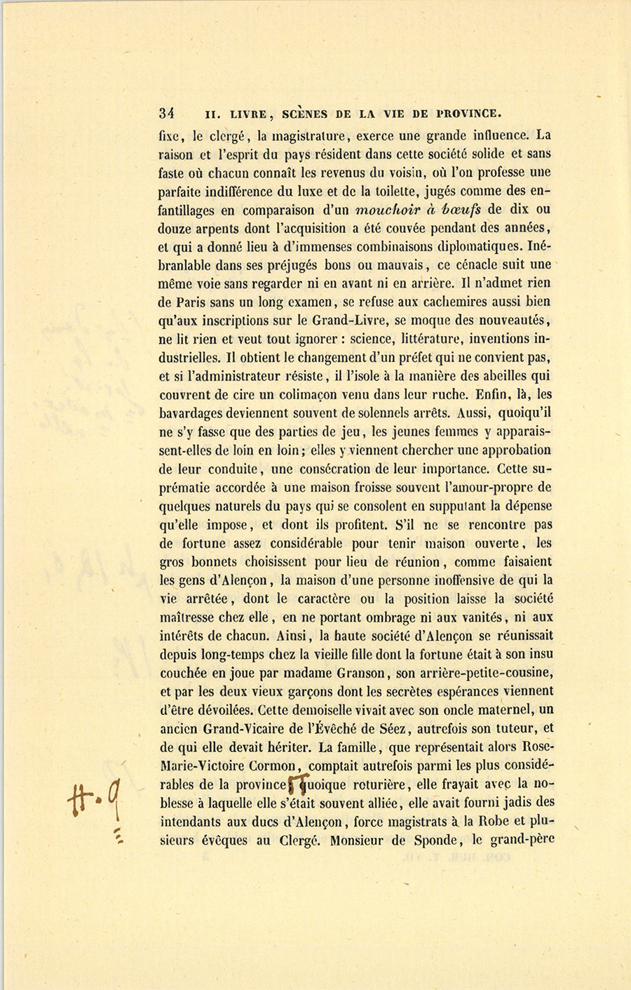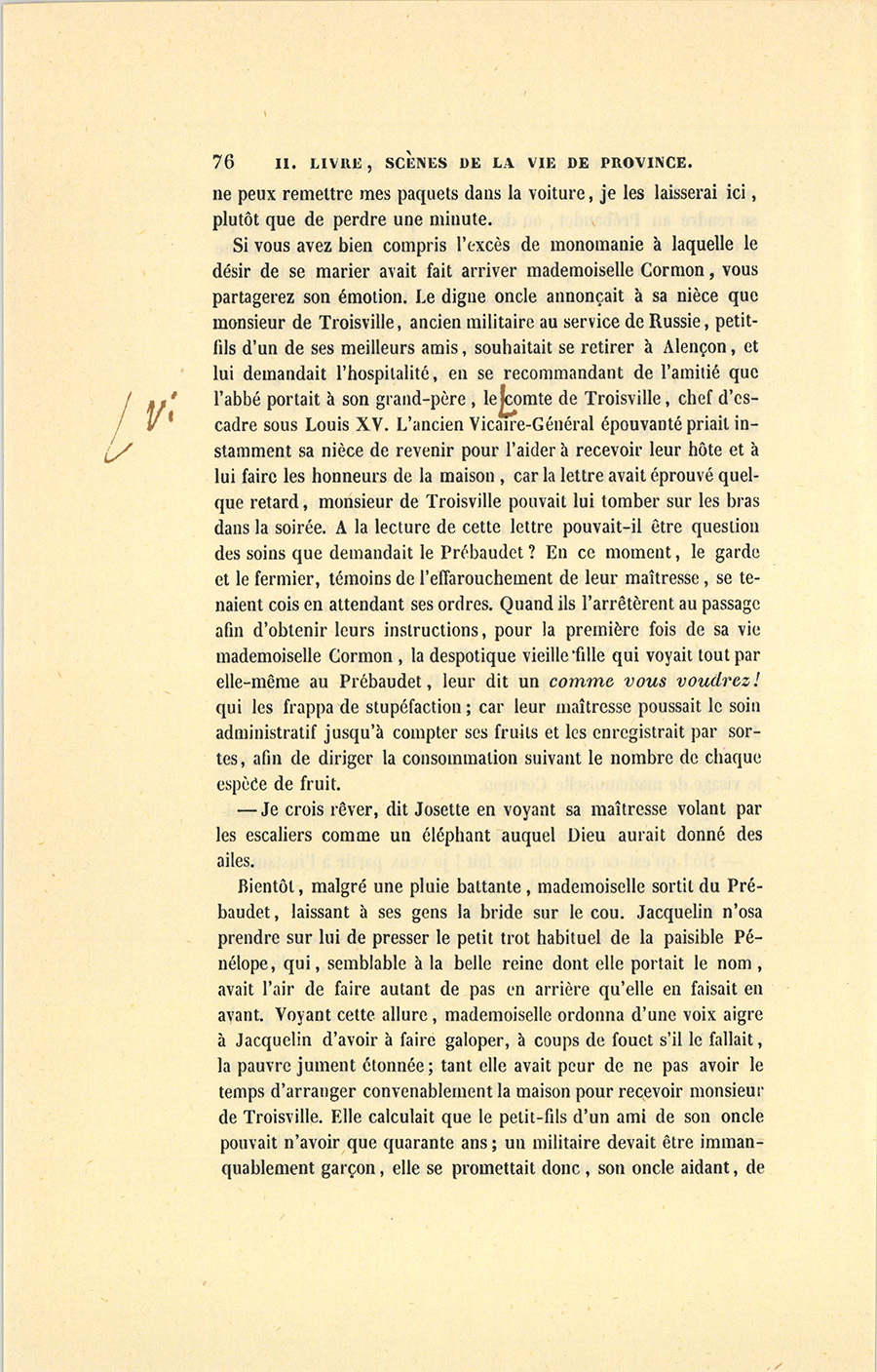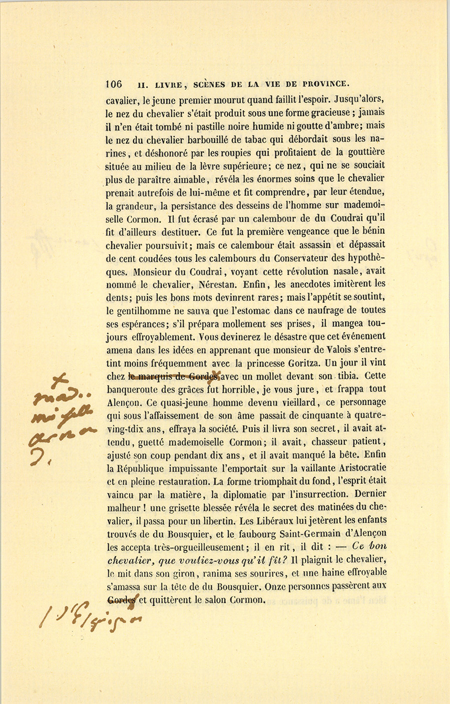 {p. 107} Ce mariage eut surtout pour effet de dessiner les partis dans Alençon. La maison d’Esgrignon y figura la haute aristocratie, car les Troisville revenus s’y rattachèrent. La maison Cormon représenta, sous l’habile influence de du Bousquier, cette fatale opinion qui sans être vraiment libérale, ni résolument royaliste, enfanta les 221 au jour où la lutte se précisa entre le plus auguste, le plus grand, le seul vrai pouvoir, la Royauté, et le plus faux, le plus changeant, le plus oppresseur pouvoir, le pouvoir dit parlementaire qu’exercent des assemblées électives. Le salon du Ronceret, secrètement allié au salon Cormon, fut hardiment libéral.