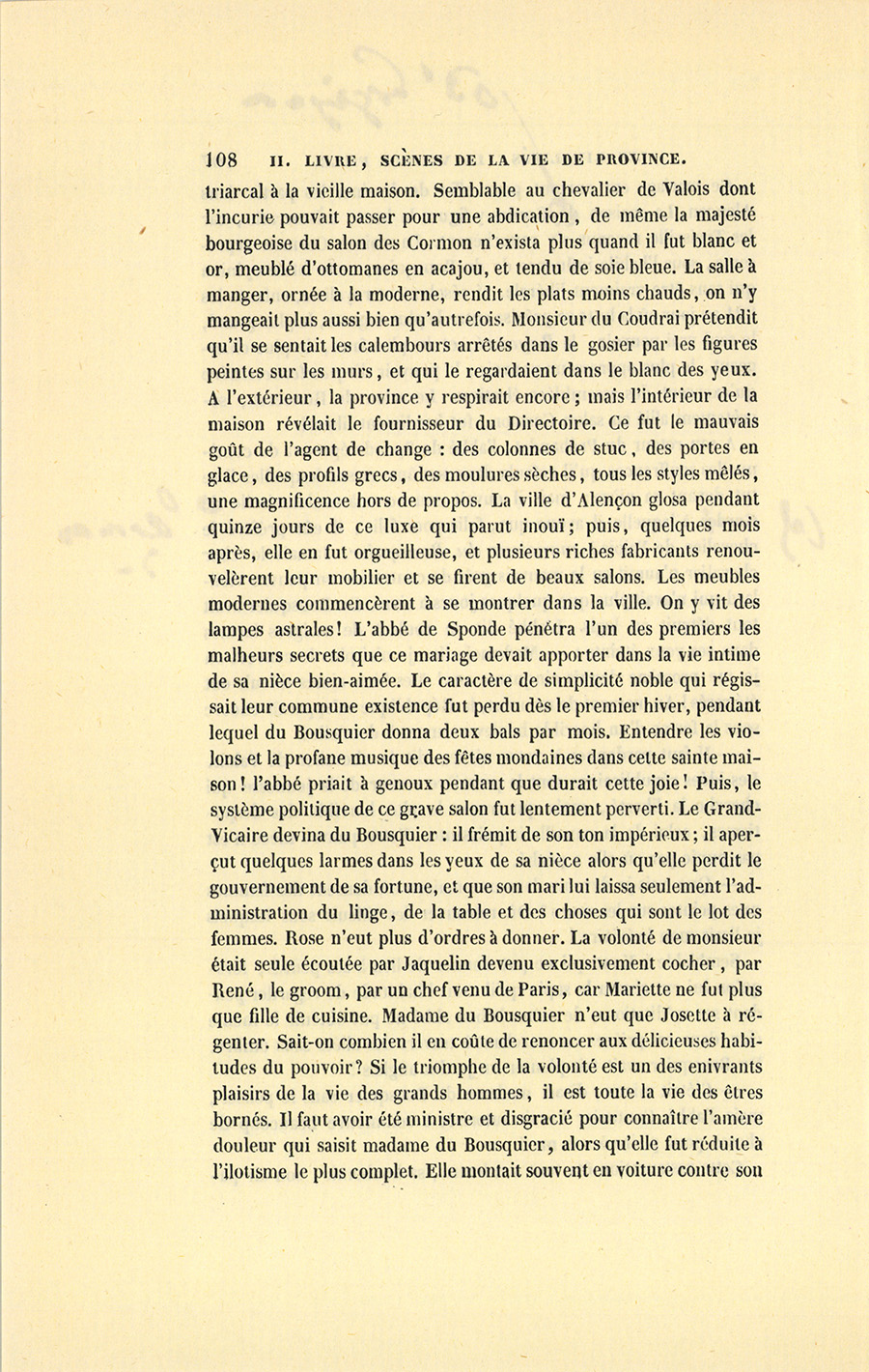 Cette restauration ôta tout son lustre, sa bonhomie, son air {p. 108} patriarcal à la vieille maison. Semblable au chevalier de Valois dont l’incurie pouvait passer pour une abdication, de même la majesté bourgeoise du salon des Cormon n’exista plus quand il fut blanc et or, meublé d’ottomanes en acajou, et tendu de soie bleue. La salle à manger, ornée à la moderne, rendit les plats moins chauds, on n’y mangeait plus aussi bien qu’autrefois. Monsieur du Coudrai prétendit qu’il se sentait les calembours arrêtés dans le gosier par les figures peintes sur les murs, et qui le regardaient dans le blanc des yeux. À l’extérieur, la province y respirait encore ; mais l’intérieur de la maison révélait le fournisseur du Directoire. Ce fut le mauvais goût de l’agent de change : des colonnes de stuc, des portes en glace, des profils grecs, des moulures sèches, tous les styles mêlés, une magnificence hors de propos. La ville d’Alençon glosa pendant quinze jours de ce luxe qui parut inouï ; puis, quelques mois après, elle en fut orgueilleuse, et plusieurs riches fabricants renouvelèrent leur mobilier et se firent de beaux salons. Les meubles modernes commencèrent à se montrer dans la ville. On y vit des lampes astrales ! L’abbé de Sponde pénétra l’un des premiers les malheurs secrets que ce mariage devait apporter dans la vie intime de sa nièce bien-aimée. Le caractère de simplicité noble qui régissait leur commune existence fut perdu dès le premier hiver, pendant lequel du Bousquier donna deux bals par mois. Entendre les violons et la profane musique des fêtes mondaines dans cette sainte maison ! l’abbé priait à genoux pendant que durait cette joie ! Puis, le système politique de ce grave salon fut lentement perverti. Le Grand-Vicaire devina du Bousquier : il frémit de son ton impérieux ; il aperçut quelques larmes dans les yeux de sa nièce alors qu’elle perdit le gouvernement de sa fortune, et que son mari lui laissa seulement l’administration du linge, de la table et des choses qui sont le lot des femmes. Rose n’eut plus d’ordres à donner. La volonté de monsieur était seule écoutée par Jacquelin24 devenu exclusivement cocher, par René, le groom, par un chef venu de Paris, car Mariette ne fut plus que fille de cuisine. Madame du Bousquier n’eut que Josette à régenter. Sait-on combien il en coûte de renoncer aux délicieuses habitudes du pouvoir ? Si le triomphe de la volonté est un des enivrants plaisirs de la vie des grands hommes, il est toute la vie des êtres bornés. Il faut avoir été ministre et disgracié pour connaître l’amère douleur qui saisit madame du Bousquier, alors qu’elle fut réduite à l’ilotisme le plus complet. Elle montait souvent en voiture contre son {p. 109} gré, elle voyait des gens qui ne lui convenaient pas ; elle n’avait plus le maniement de son cher argent, elle qui s’était vue libre de dépenser ce qu’elle voulait et qui alors ne dépensait rien. Toute limite imposée n’inspire-t-elle pas le désir d’aller au delà ? Les souffrances les plus vives ne viennent-elles pas du libre arbitre contrarié ? Ces commencements furent des roses. Chaque concession faite à l’autorité maritale fut alors conseillée par l’amour de la pauvre fille pour son époux. Du Bousquier se comporta d’abord admirablement pour sa femme ; il fut excellent, il lui donna des raisons valables à chaque nouvel empiétement. Cette chambre, si long-temps déserte, entendit le soir la voix des deux époux au coin du feu. Aussi, pendant les deux premières années de son mariage, madame du Bousquier se montra-t-elle très-satisfaite. Elle avait ce petit air délibéré, finaud qui distingue les jeunes femmes après un mariage d’amour. Le sang ne la tourmentait plus. Cette contenance dérouta les rieurs, démentit les bruits qui couraient sur du Bousquier et déconcerta les observateurs du cœur humain. Rose-Marie-Victoire craignait tant, en déplaisant à son époux, en le heurtant, de le désaffectionner, d’être privée de sa compagnie, qu’elle lui aurait sacrifié tout, même son oncle. Les petites joies niaises de madame du Bousquier trompèrent le pauvre abbé de Sponde, qui supporta mieux ses souffrances personnelles en pensant que sa nièce était heureuse. Alençon pensa d’abord comme l’abbé. Mais il y avait un homme plus difficile à tromper que toute la ville ! Le chevalier de Valois, réfugié sur le mont sacré de la haute aristocratie, passait sa vie chez les d’Esgrignon ; il écoutait les médisances et les caquetages, il pensait nuit et jour à ne pas mourir sans vengeance. Il avait abattu l’homme aux calembours, il voulait atteindre du Bousquier au cœur. Le pauvre abbé comprit les lâchetés du premier et dernier amour de sa nièce, il frémit en devinant la nature hypocrite de son neveu, et ses manœuvres perfides. Quoique du Bousquier se contraignît en pensant à la succession de son oncle, et ne voulût lui causer aucun chagrin, il lui porta un dernier coup qui le mit au tombeau. Si vous voulez expliquer le mot intolérance par le mot fermeté de principes, si vous ne voulez pas condamner dans l’âme catholique de l’ancien Grand-Vicaire le stoïcisme que Walter Scott vous fait admirer dans l’âme puritaine du père de Jeanie Deans, si vous voulez reconnaître dans l’Église romaine le potiùs mori quàm fœdari que vous admirez dans l’opinion {p. 110} républicaine, vous comprendrez la douleur qui saisit le grand abbé de Sponde alors qu’il vit dans le salon de son neveu le prêtre apostat, renégat, relaps, hérétique, l’ennemi de l’Église, le curé fauteur du serment constitutionnel. Du Bousquier, dont la secrète ambition était de régenter le pays, voulut, pour premier gage de son pouvoir, réconcilier le desservant de Saint-Léonard avec le curé de la paroisse, et il atteignit à son but. Sa femme crut accomplir une œuvre de pai