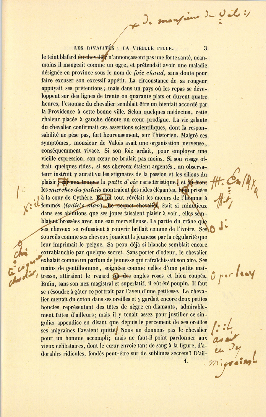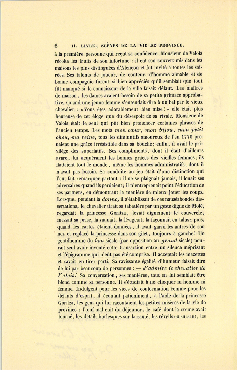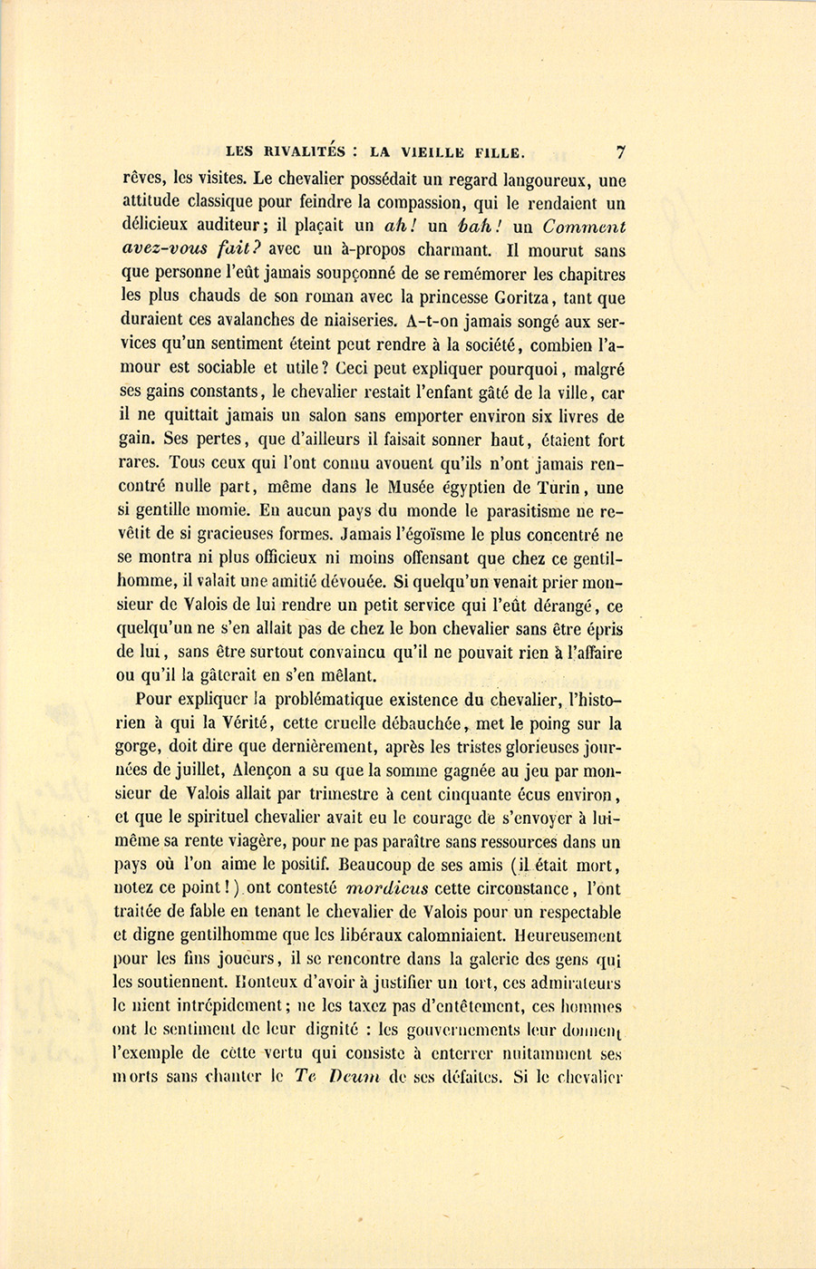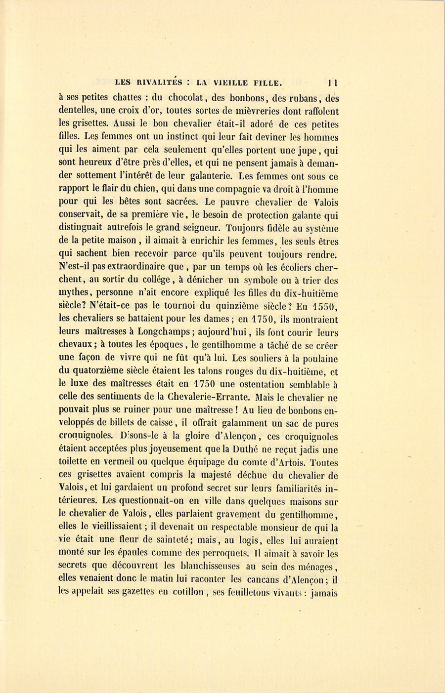 {p. 2} Chacun de ces chevaliers, si les renseignements sont exacts, fut, comme celui d’Alençon, un vieux gentilhomme, long, sec et sans fortune. Celui de Bourges avait émigré, celui de Touraine s’était caché, celui d’Alençon avait guerroyé dans la Vendée et quelque peu chouanné. La majeure partie de la jeunesse de ce dernier s’était passée à Paris, où la Révolution le surprit à trente ans au milieu de ses conquêtes. Accepté par la haute aristocratie de la province pour un vrai Valois, le chevalier de Valois d’Alençon se faisait distinguer, comme ses homonymes, par d’excellentes manières et paraissait homme de haute compagnie. Il dînait tous les jours en ville, et jouait tous les soirs. Il passait pour être un homme très-spirituel, grâce à l’un de ses défauts, qui consistait à raconter une foule d’anecdotes sur le règne de Louis XV et sur les commencements de la Révolution. Quand on entendait ces historiettes pour la première fois, on les trouvait assez bien narrées. Le chevalier de Valois avait d’ailleurs la vertu de ne pas répéter ses bons mots personnels et de ne jamais parler de ses amours ; mais ses grâces et ses sourires commettaient de délicieuses indiscrétions. Ce bonhomme usait du privilége qu’ont les vieux gentilshommes voltairiens de ne point aller à la messe, et l’on avait une excessive indulgence pour son irréligion, en faveur de son dévouement à la cause royale. Une de ses grâces les plus remarquées était sa manière, sans doute imitée de Molé, de prendre du tabac dans une vieille boîte d’or ornée du portrait d’une princesse Goritza, charmante Hongroise, célèbre par sa beauté sous la fin du règne de Louis XV. [ill.] Attaché pendant sa jeunesse à cette illustre étrangère, il en parlait toujours avec émotion, il s’était battu pour elle contre monsieur de Lauzun. Alors âgé d’environ cinquante-huit ans, il n’en avouait que cinquante, et pouvait se permettre cette innocente tromperie ; car, parmi les avantages dévolus aux gens secs et blonds, il conservait cette taille encore juvénile qui sauve aux hommes aussi bien qu’aux femmes les apparences de la vieillesse. Oui, sachez-le, toute la vie, ou toute l’élégance qui est l’expression de la vie, réside dans la taille. Au nombre des propriétés du chevalier, il faut compter le nez prodigieux dont l’avait doué la Nature. Ce nez partageait vigoureusement une figure pâle en deux sections qui semblaient ne pas se connaître, et dont une seule rougissait pendant le travail de la digestion. Ce fait est digne de remarque par un temps où la physiologie s’occupe tant du cœur humain. Cette incandescence se plaçait à gauche. Quoique les jambes hautes et fines, le corps grêle et {p. 3} le teint blafard de monsieur de Valois n’annonçassent pas une forte santé, néanmoins il mangeait comme un ogre, et prétendait avoir une maladie désignée en province sous le nom de foie chaud, sans doute pour faire excuser son excessif appétit. La circonstance de sa rougeur appuyait ses prétentions ; mais dans un pays où les repas se développent sur des lignes de trente ou quarante plats et durent quatre heures, l’estomac du chevalier semblait être un bienfait accordé par la Providence à cette bonne ville. Selon quelques médecins, cette chaleur placée à gauche dénote un cœur prodigue. La vie galante du chevalier confirmait ces assertions scientifiques, dont la responsabilité ne pèse pas, fort heureusement, sur l’historien. Malgré ces symptômes, monsieur de Valois avait une organisation nerveuse, conséquemment vivace. Si son foie ardait, pour employer une vieille expression, son cœur ne brûlait pas moins. Si son visage offrait quelques rides, si ses cheveux étaient argentés, un observateur instruit y aurait vu les stigmates de la passion et les sillons du plaisir. En effet, la patte d’oie caractéristique et les marches du palais montraient ces rides élégantes, si prisées à la cour de Cythère. Chez le coquet chevalier, tout révélait les mœurs de l’homme à femmes (ladie’s man) : il était si minutieux dans ses ablutions que ses joues faisaient plaisir à voir, elles semblaient brossées avec une eau merveilleuse. La partie du crâne que ses cheveux se refusaient à couvrir brillait comme de l’ivoire. Ses sourcils comme ses cheveux jouaient la jeunesse par la régularité que leur imprimait le peigne. Sa peau déjà si blanche semblait encore extrablanchie par quelque secret. Sans porter d’odeur, le chevalier exhalait comme un parfum de jeunesse qui rafraîchissait son aire. Ses mains de gentilhomme, soignées comme celles d’une petite maîtresse, attiraient le regard par leurs ongles roses et bien coupés. Enfin, sans son nez magistral et superlatif, il eût été poupin. Il faut se résoudre à gâter ce portrait par l’aveu d’une petitesse. Le chevalier mettait du coton dans ses oreilles et y gardait encore deux petites boucles représentant des têtes de nègre en diamants, admirablement faites d’ailleurs ; mais il y tenait assez pour justifier ce singulier appendice en disant que depuis le percement de ses oreilles ses migraines l’avaient quitté : il avait eu des migraines ! Nous ne donnons pas le chevalier pour un homme accompli ; mais ne faut-il point pardonner aux vieux célibataires, dont le cœur envoie tant de sang à la figure, d’adorables ridicules, fondés peut-être sur de sublimes secrets ? {p. 4} D’ailleurs, le chevalier de Valois rachetait ses têtes de nègre par tant d’autres grâces que la société devait se trouver suffisamment indemnisée. Il prenait vraiment beaucoup de peine pour cacher ses années et pour plaire à ses connaissances. Il faut signaler en première ligne le soin extrême qu’il apportait à son linge, la seule distinction que puissent avoir aujourd’hui dans le costume les gens comme il faut ; celui du chevalier était toujours d’une finesse et