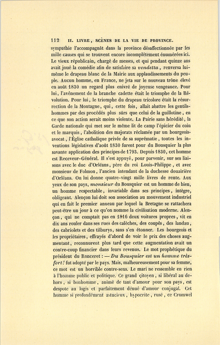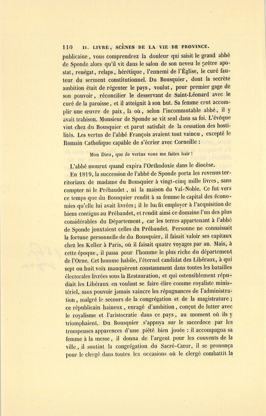 En 1819, la succession de l’abbé de Sponde porta les revenus territoriaux de madame du Bousquier à vingt-cinq mille livres, sans compter ni le Prébaudet, ni la maison du Val-Noble. Ce fut vers ce temps que du Bousquier rendit à sa femme le capital des économies qu’elle lui avait livrées ; il le lui fit employer à l’acquisition de biens contigus au Prébaudet, et rendit ainsi ce domaine l’un des plus considérables du Département, car les terres appartenant à l’abbé de Sponde jouxtaient celles du Prébaudet. Personne ne connaissait la fortune personnelle de du Bousquier, il faisait valoir ses capitaux chez les Keller à Paris, où il faisait quatre voyages par an. Mais, à cette époque, il passa pour l’homme le plus riche du département de l’Orne. Cet homme habile, l’éternel candidat des Libéraux, à qui sept ou huit voix manquèrent constamment dans toutes les batailles électorales livrées sous la Restauration, et qui ostensiblement répudiait les Libéraux en voulant se faire élire comme royaliste ministériel, sans pouvoir jamais vaincre les répugnances de l’administration, malgré le secours de la congrégation et de la magistrature ; ce républicain haineux, enragé d’ambition, conçut de lutter avec le royalisme et l’aristocratie dans ce pays, au moment où ils y triomphaient. Du Bousquier s’appuya sur le sacerdoce par les trompeuses apparences d’une piété bien jouée : il accompagna sa femme à la messe, il donna de l’argent pour les couvents de la ville, il soutint la congrégation du Sacré-Cœur, il se prononça pour le clergé dans toutes les occasions où le clergé combattit la {p. 111} Ville, le Département ou l’État. Secrètement soutenu par les Libéraux, protégé par l’Église, demeurant royaliste constitutionnel, il côtoya sans cesse l’aristocratie du département pour la ruiner, et il la ruina. Attentif aux fautes commises par les sommités nobiliaires et par le gouvernement, il réalisa, la bourgeoisie aidant, toutes les améliorations que la Noblesse, la Pairie et le Ministère devaient inspirer, diriger, et qu’ils entravaient par suite de la niaise jalousie des pouvoirs en France. L’opinion constitutionnelle l’emporta dans l’affaire du curé, dans l’érection du théâtre, dans toutes les questions d’agrandissement pressenties par du Bousquier, qui les faisait proposer par le parti libéral, auquel il s’adjoignait au plus fort des débats, en objectant le bien du pays. Du Bousquier industrialisa le Département. Il accéléra la prospérité de la province en haine des familles logées sur la route de Bretagne. Il préparait ainsi sa vengeance contre les gens à châteaux, et surtout contre les d’Esgrignon, au sein desquels un jour il fut sur le point d’enfoncer un poignard envenimé. Il donna des fonds pour relever les manufactures de point d’Alençon ; il raviva le commerce des toiles, la ville eut une filature. En s’inscrivant ainsi dans tous les intérêts et au cœur de la masse, en faisant ce que la Royauté ne faisait point, du Bousquier ne hasardait pas un liard. Soutenu par sa fortune, il pouvait attendre les réalisations que souvent les gens entreprenants, mais gênés, sont forcés d’abandonner à d’heureux successeurs. Il se posa comme banquier. Ce Laffitte au petit pied commanditait toutes les inventions nouvelles en prenant ses sûretés. Il faisait très bien ses affaires en faisant le bien public ; il était le moteur des Assurances, le protecteur des nouvelles entreprises de voitures publiques ; il suggérait les pétitions pour demander à l’administration les chemins et les ponts nécessaires. Ainsi prévenu, le gouvernement voyait un empiétement sur son autorité. Les luttes s’engageaient maladroitement, car le bien du pays exigeait que la Préfecture cédât. Du Bousquier aigrissait la noblesse de province contre la noblesse de cour et contre la pairie. Enfin il prépara l’effrayante adhésion d’une forte partie du royalisme constitutionnel à la lutte que soutinrent le Journal des Débats et monsieur de Chateaubriand contre le trône, ingrate opposition basée sur des intérêts ignobles, et qui fut une des causes de triomphe de la bourgeoisie et du journalisme en 1830. Aussi, du Bousquier, comme les gens qu’il représente, eut-il le bonheur de voir passer le convoi de la Royauté, sans qu’aucune {p. 112} sympathie l’accompagnât dans la province désaffectionnée par les mille causes qui se trouvent encore incomplétement énumérées ici. Le vieux républicain, chargé de messes, et qui pendant quinze ans avait joué la comédie afin de satisfaire sa vendetta, renversa lui-même le drapeau blanc de la Mairie aux applaudissements du peuple. Aucun homme, en France, ne jeta sur le nouveau trône élevé en août 1830 un regard plus enivré de joyeuse vengeance. Pour lui, l’avénement de la branche cadette était le triomphe de la Révolution. Pour lui, le triomphe du drapeau tricolore était la résurrection de la Montagne, qui, cette fois, allait abattre les gentilshommes par des procédés plus sûrs que celui de la guillotine, en ce que son action serait moins violente. La Pairie sans hérédité, la Garde nationale qui met sur le même lit de camp l’épicier du coin et le marquis, l’abolition des majorats réclamée par un bourgeois-avocat, l’Église catholique privée de sa suprématie, toutes les inventions législatives d’août 1830 furent pour du Bousquier la plus savante application des principes de 1793. Depuis 1830, cet homme est Receveur-Général. Il s’est appuyé, pour parvenir, sur ses liaisons avec le duc d’Orléans, père du roi Louis-Philippe, et avec monsieur de Folmon, l’ancien intendant de la duchesse douairière d’Orléans. On lui donne quatre-vingt mille livres de rente. Aux yeux de son pays, monsieur du Bousquier est un homme de bien, un homme respectable, invariable dans ses principes, intègre, obligeant.