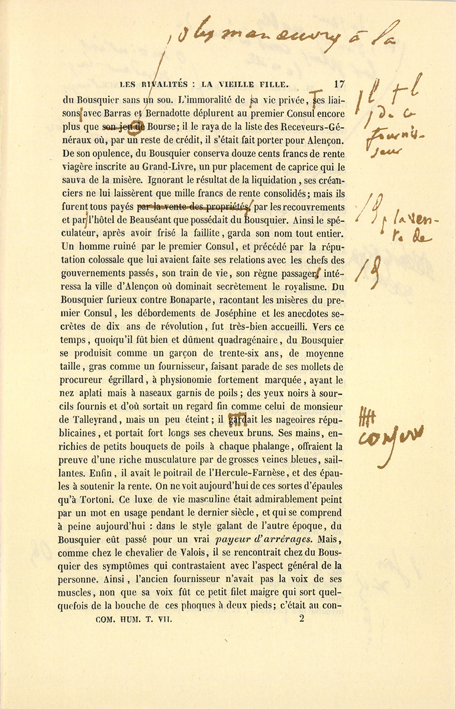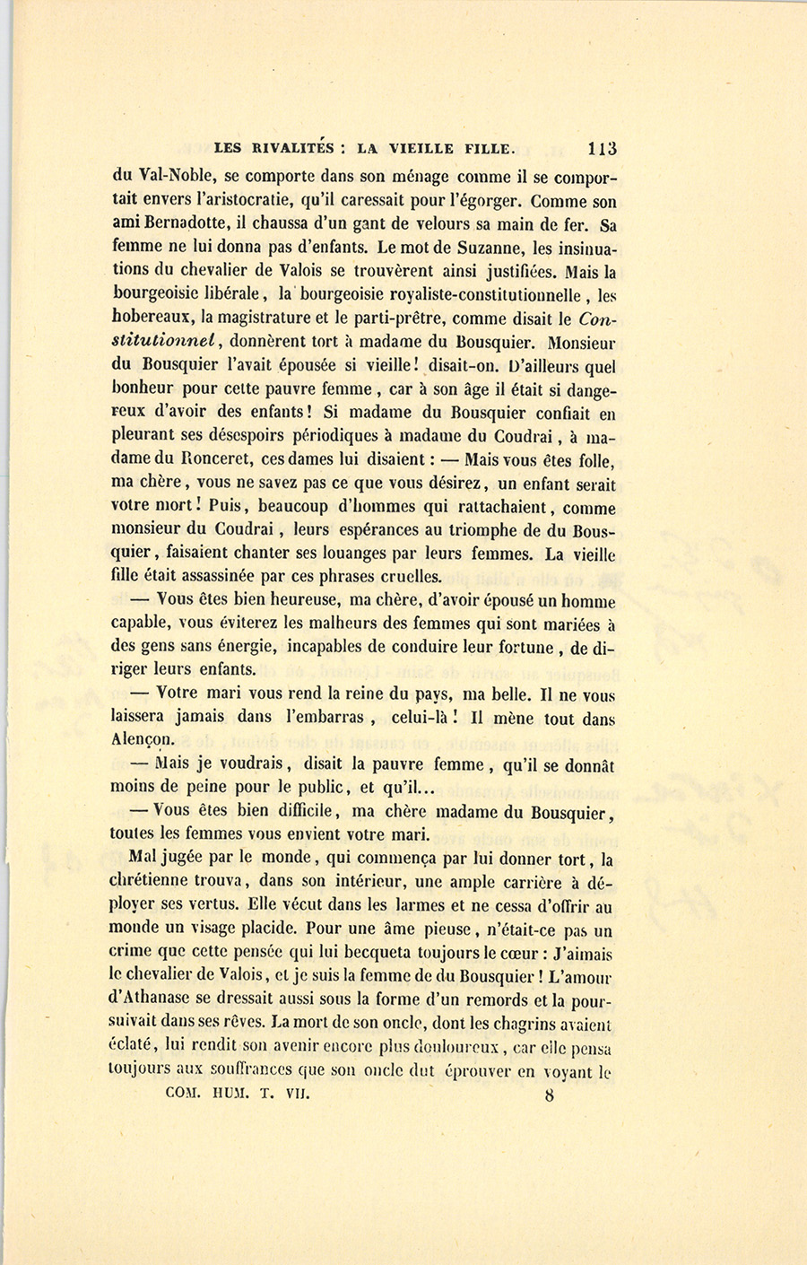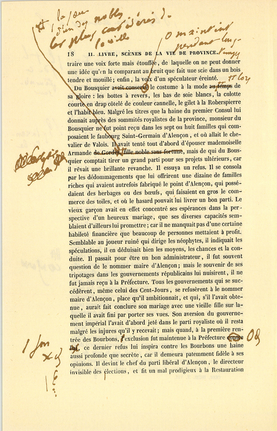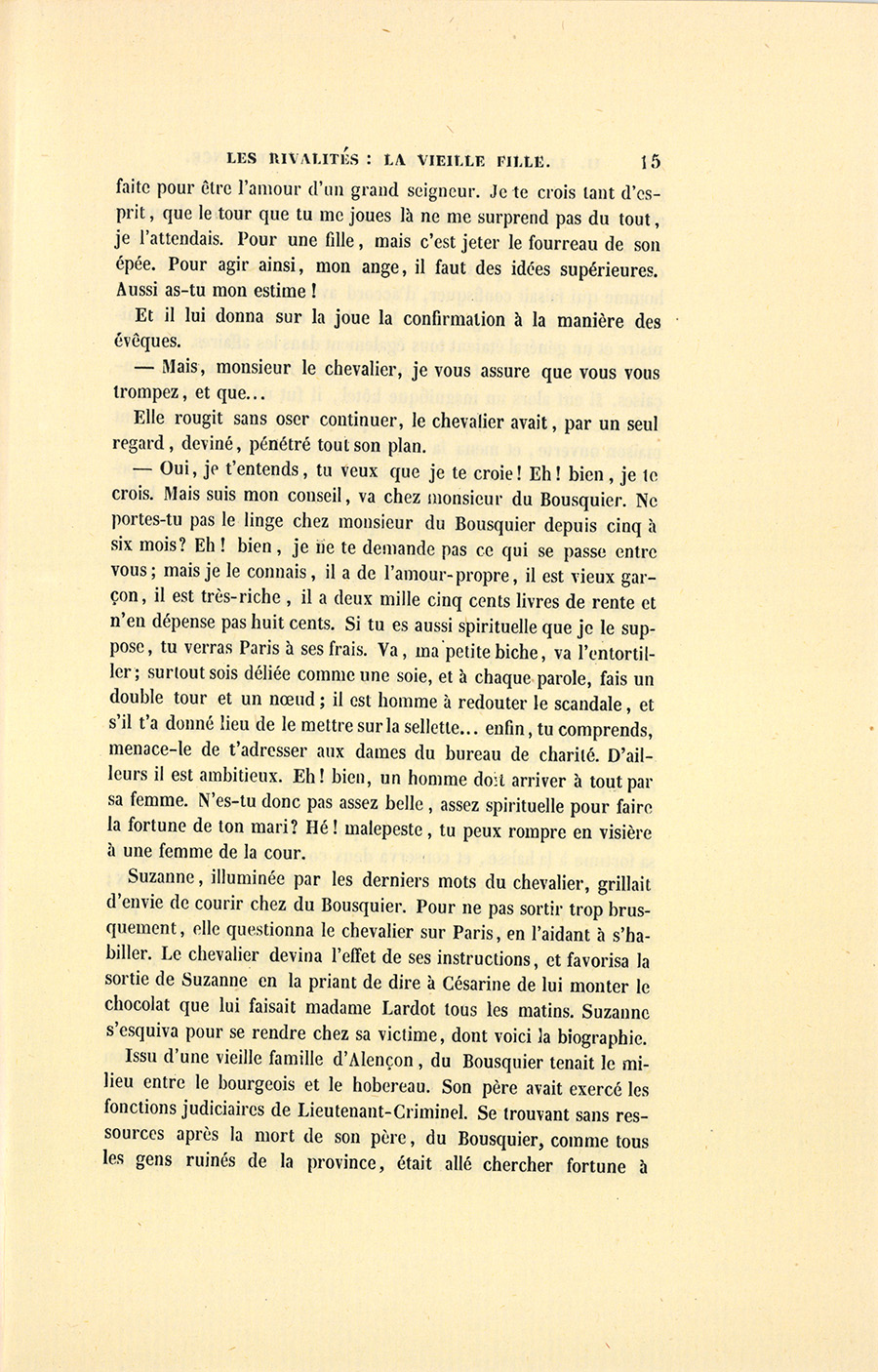 Du Bousquier maintint pendant long-temps le costume à la mode lors de sa gloire : les bottes à revers, les bas de soie blancs, la culotte courte en drap côtelé de couleur cannelle, le gilet à la Roberspierre et l’habit bleu. [ill.] Malgré les titres que la haine du premier Consul lui donnait auprès des sommités royalistes de la province, monsieur du Bousquier ne fut point reçu dans les sept ou huit familles qui composaient le faubourg Saint-Germain d’Alençon, et où allait le chevalier de Valois. Il avait tenté tout d’abord d’épouser mademoiselle Armande, la sœur d’un des nobles les plus considérés de la ville, mais de qui du Bousquier comptait tirer un grand parti pour ses projets ultérieurs, car il rêvait une brillante revanche. Il essuya un refus. Il se consola par les dédommagements que lui offrirent une dizaine de familles riches qui avaient autrefois fabriqué le point d’Alençon, qui possédaient des herbages ou des bœufs, qui faisaient en gros le commerce des toiles, et où le hasard pouvait lui livrer un bon parti. Le vieux garçon avait en effet concentré ses espérances dans la perspective d’un heureux mariage, que ses diverses capacités semblaient d’ailleurs lui promettre ; car il ne manquait pas d’une certaine habileté financière que beaucoup de personnes mettaient à profit. Semblable au joueur ruiné qui dirige les néophytes, il indiquait les spéculations, il en déduisait bien les moyens, les chances et la conduite. Il passait pour être un bon administrateur, il fut souvent question de le nommer maire d’Alençon ; mais le souvenir de ses tripotages dans les gouvernements républicains lui nuisirent, il ne fut jamais reçu à la Préfecture. Tous les gouvernements qui se succédèrent, même celui des Cent-Jours, se refusèrent à le nommer maire d’Alençon, place qu’il ambitionnait, et qui, s’il l’avait obtenue, aurait fait conclure son mariage avec une vieille fille sur laquelle il avait fini par porter ses vues. Son aversion du gouvernement impérial l’avait d’abord jeté dans le parti royaliste où il resta malgré les injures qu’il y recevait ; mais quand, à la première rentrée des Bourbons, son exclusion fut maintenue à la Préfecture, ce dernier refus lui inspira contre les Bourbons une haine aussi profonde que secrète, car il demeura patemment fidèle à ses opinions. Il devint le chef du parti libéral d’Alençon, le directeur invisible des Élections, et fit un mal prodigieux à la Restauration {p. 19} par l’habileté de ses manœuvres sourdes et par la perfidie de ses menées. Du Bousquier, comme tous ceux qui ne peuvent plus vivre que par la tête, portait dans ses sentiments haineux la tranquillité d’un ruisseau faible en apparence, mais intarissable. Sa haine était comme celle du nègre, si paisible, si patiente, qu’elle trompait l’ennemi. Sa vengeance, couvée pendant quinze années, ne fut rassasiée par aucune victoire, pas même par le triomphe des journées de juillet 1830.