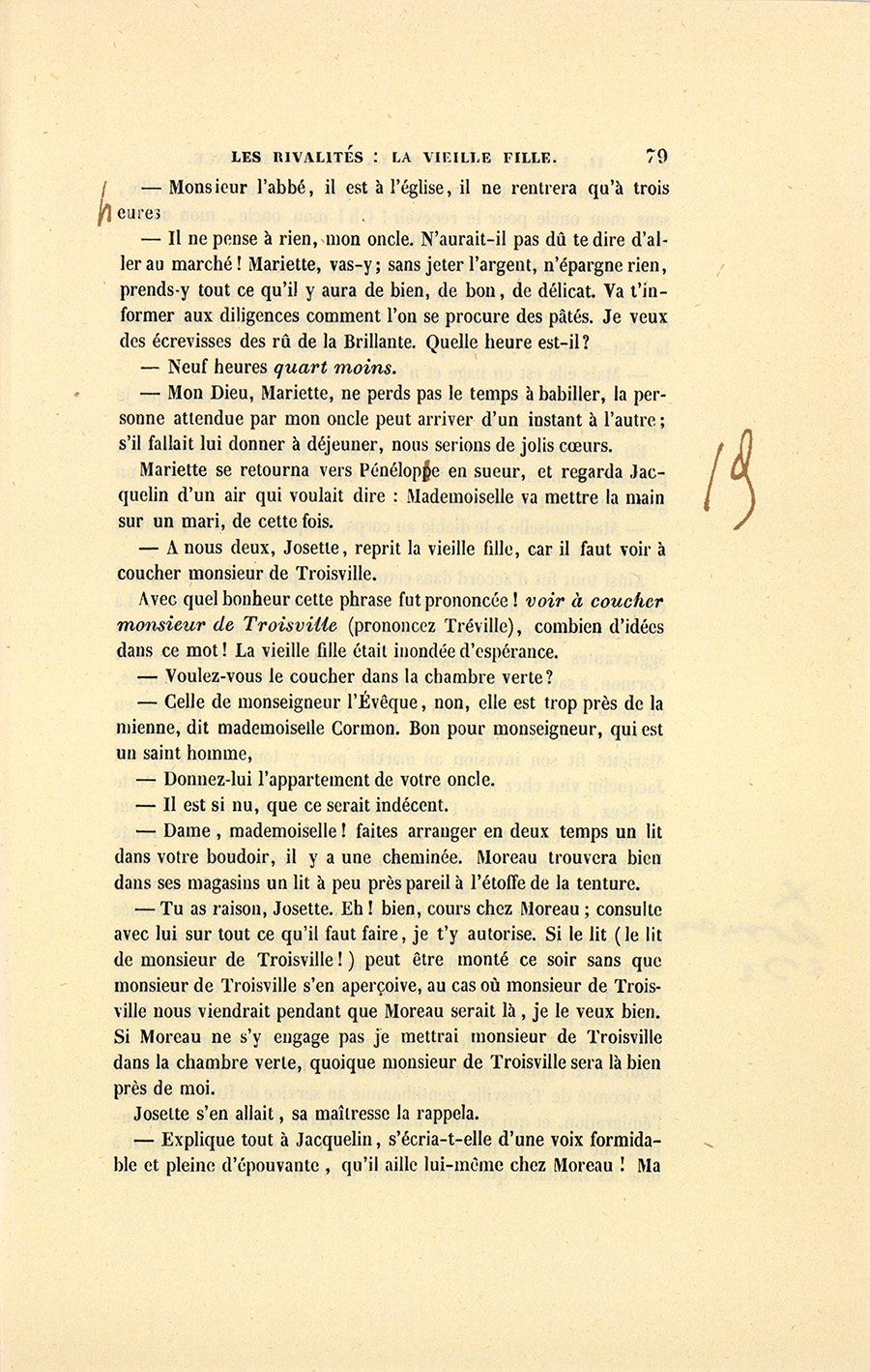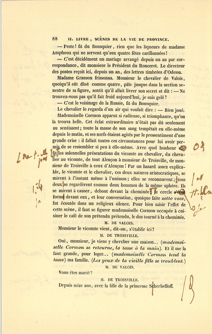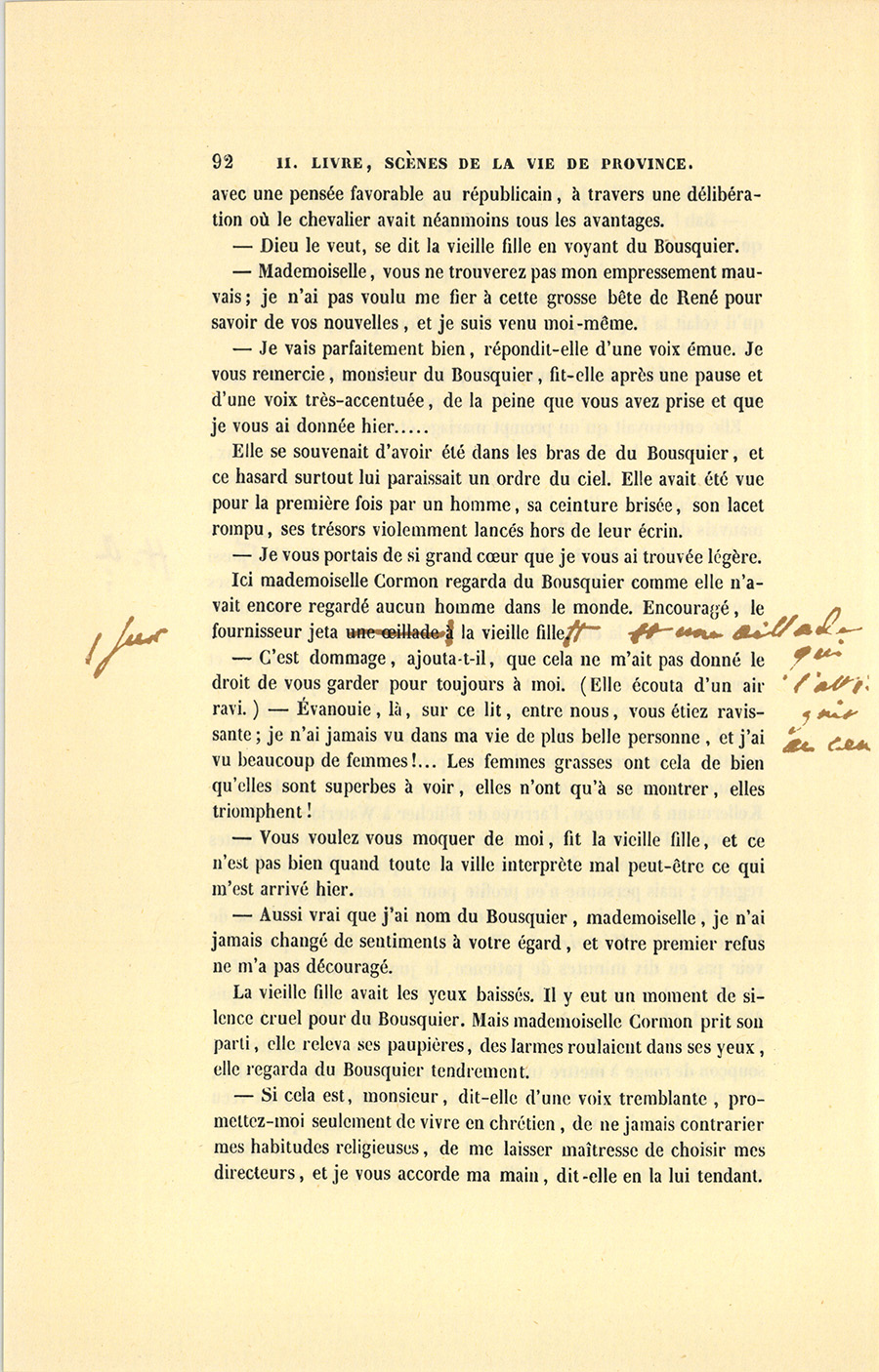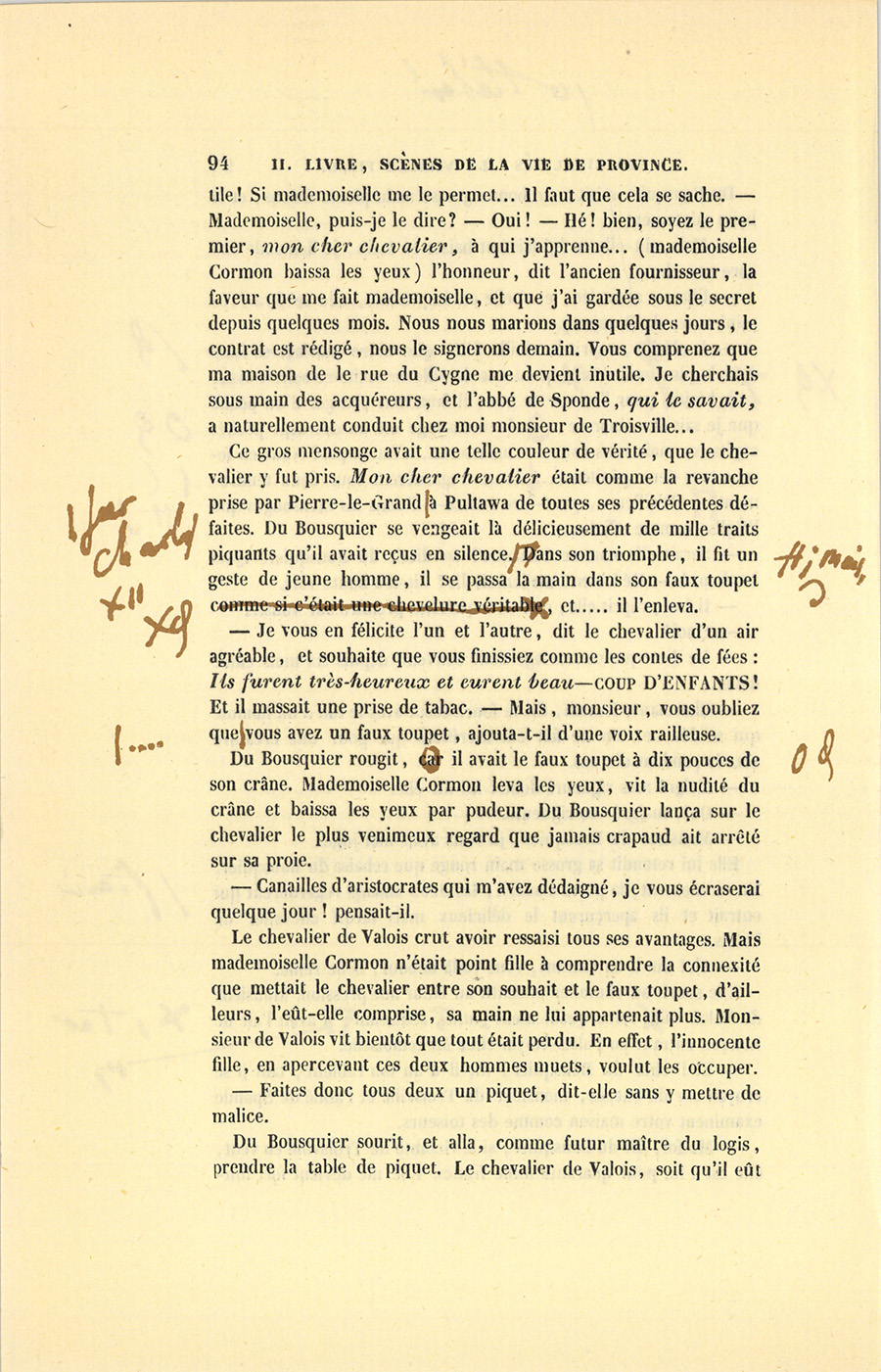 – Ma foi, dit du Bousquier, si le vicomte de Troisville en veut, elle est à lui pour quarante mille francs. Elle me devient fort {p. 94} inutile ! Si mademoiselle me le permet… Il faut que cela se sache. – Mademoiselle, puis-je le dire ? – Oui ! – Hé ! bien, soyez le premier, mon cher chevalier, à qui j’apprenne… (mademoiselle Cormon baissa les yeux) l’honneur, dit l’ancien fournisseur, la faveur que me fait mademoiselle, et que j’ai gardée sous le secret depuis quelques mois. Nous nous marions dans quelques jours, le contrat est rédigé, nous le signerons demain. Vous comprenez que ma maison de la19 rue du Cygne me devient inutile. Je cherchais sous main des acquéreurs, et l’abbé de Sponde, qui le savait, a naturellement conduit chez moi monsieur de Troisville…