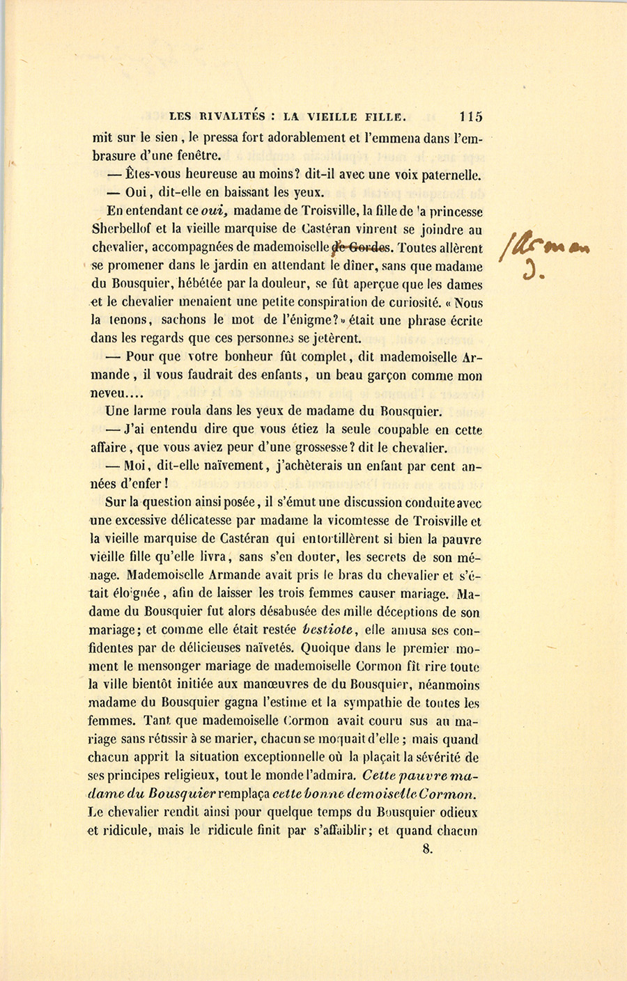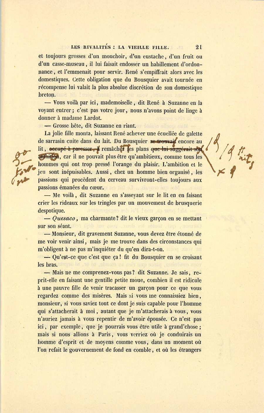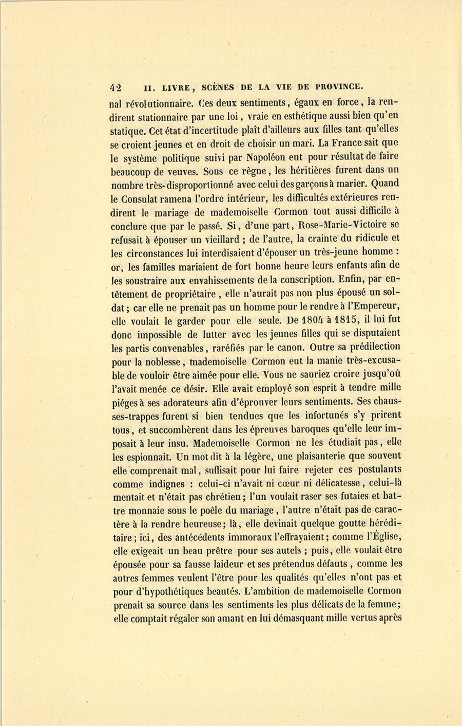 Du Bousquier était livré à mille sentiments contraires, à la joie, à la défiance, au calcul. Il avait résolu depuis long-temps d’épouser mademoiselle Cormon, car la Charte, sur laquelle il venait de ruminer, offrait à son ambition la magnifique voie politique de la {p. 23} Députation. Or, son mariage avec la vieille fille devait le poser si haut dans la ville qu’il y acquerrait une grande influence. Aussi l’orage soulevé par la malicieuse Suzanne le plongea-t-il dans un violent embarras. Sans cette secrète espérance, il aurait épousé Suzanne sans même y réfléchir. Il se serait placé franchement à la tête du parti libéral d’Alençon. Après un pareil mariage, il renonçait à la première société pour retomber dans la classe bourgeoise des négociants, des riches fabricants, des herbagers qui certainement le porteraient en triomphe comme leur candidat. Du Bousquier prévoyait déjà le Côté Gauche. Cette délibération solennelle, il ne la cachait pas, il se passait la main sur la tête en en laissant voir la nudité, car le bonnet était tombé. Comme toutes les personnes qui dépassent leur but et trouvent mieux que ce qu’elles espéraient, Suzanne restait ébahie. Pour cacher son étonnement, elle prit la pose mélancolique d’une fille abusée devant son séducteur ; mais elle riait intérieurement comme une grisette en partie fine.