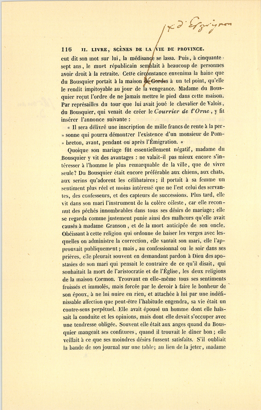 Sur la question ainsi posée, il s’émut une discussion conduite avec une excessive délicatesse par madame la vicomtesse de Troisville et la vieille marquise de Castéran qui entortillèrent si bien la pauvre vieille fille qu’elle livra, sans s’en douter, les secrets de son ménage. Mademoiselle Armande avait pris le bras du chevalier et s’était éloignée, afin de laisser les trois femmes causer mariage. Madame du Bousquier fut alors désabusée des mille déceptions de son mariage ; et comme elle était restée bestiote, elle amusa ses confidentes par de délicieuses naïvetés. Quoique dans le premier moment le mensonger mariage de mademoiselle Cormon fît rire toute la ville bientôt initiée aux manœuvres de du Bousquier, néanmoins madame du Bousquier gagna l’estime et la sympathie de toutes les femmes. Tant que mademoiselle Cormon avait couru sus au mariage sans réussir à se marier, chacun se moquait d’elle ; mais quand chacun apprit la situation exceptionnelle où la plaçait la sévérité de ses principes religieux, tout le monde l’admira. Cette pauvre madame du Bousquier remplaça cette bonne demoiselle Cormon. Le chevalier rendit ainsi pour quelque temps du Bousquier odieux et ridicule, mais le ridicule finit par s’affaiblir ; et quand chacun {p. 116} eut dit son mot sur lui, la médisance se lassa. Puis, à cinquante-sept ans, le muet républicain semblait à beaucoup de personnes avoir droit à la retraite. Cette circonstance envenima la haine que du Bousquier portait à la maison d’Esgrignon à un tel point, qu’elle le rendit impitoyable au jour de la vengeance. Madame du Bousquier reçut l’ordre de ne jamais mettre le pied dans cette maison. Par représailles du tour que lui avait joué le chevalier de Valois, du Bousquier, qui venait de créer le Courrier de l’Orne, y fit insérer l’annonce suivante :