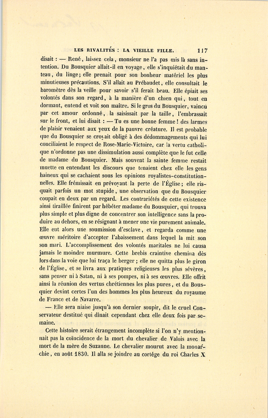 Cette histoire serait étrangement incomplète si l’on n’y mentionnait pas la coïncidence de la mort du chevalier de Valois avec la mort de la mère de Suzanne. Le chevalier mourut avec la monarchie, en août 1830. Il alla se joindre au cortége du roi Charles X {p. 118} à Nonancourt, et l’escorta pieusement jusqu’à Cherbourg avec tous les Troisville, les Castéran, les Verneuil, etc. Le vieux gentilhomme avait pris sur lui cinquante mille francs, somme à laquelle montaient ses économies et le prix de sa rente ; il l’offrit à l’un des fidèles amis de ses maîtres pour la transmettre au roi, en objectant sa mort prochaine, en disant que cette somme venait des bontés de Sa Majesté, qu’enfin l’argent du dernier des Valois appartenait à la Couronne. On ne sait si la ferveur de son zèle vainquit les répugnances du Bourbon qui abandonnait son beau royaume de France sans en emporter un liard, et qui dut être attendri par le dévouement du chevalier ; mais il est certain que Césarine, légataire universelle de monsieur de Valois, recueillit à peine six cents livres de rente. Le chevalier revint à Alençon aussi cruellement atteint par la douleur que par la fatigue, et il expira quand Charles X toucha la terre étrangère.
