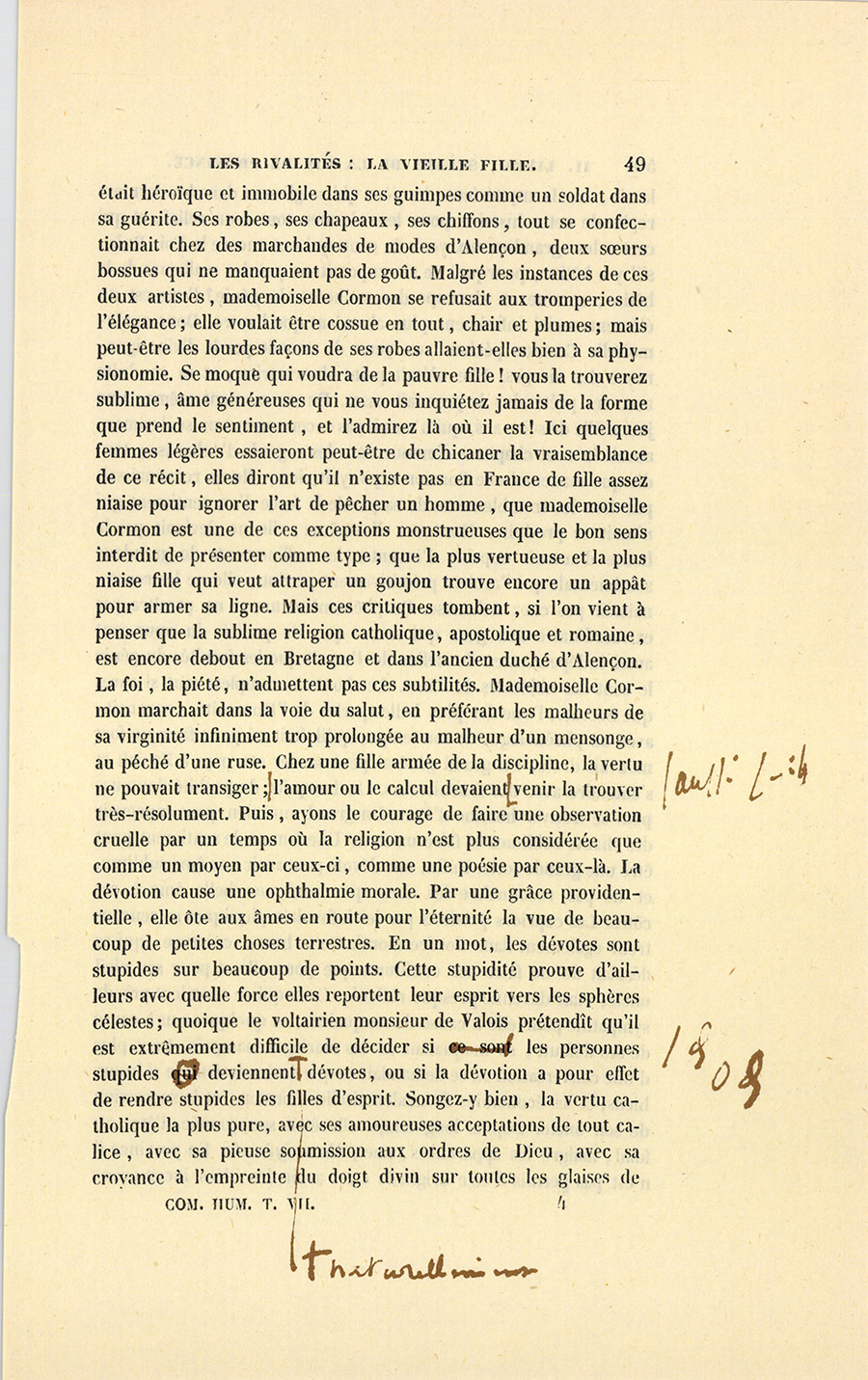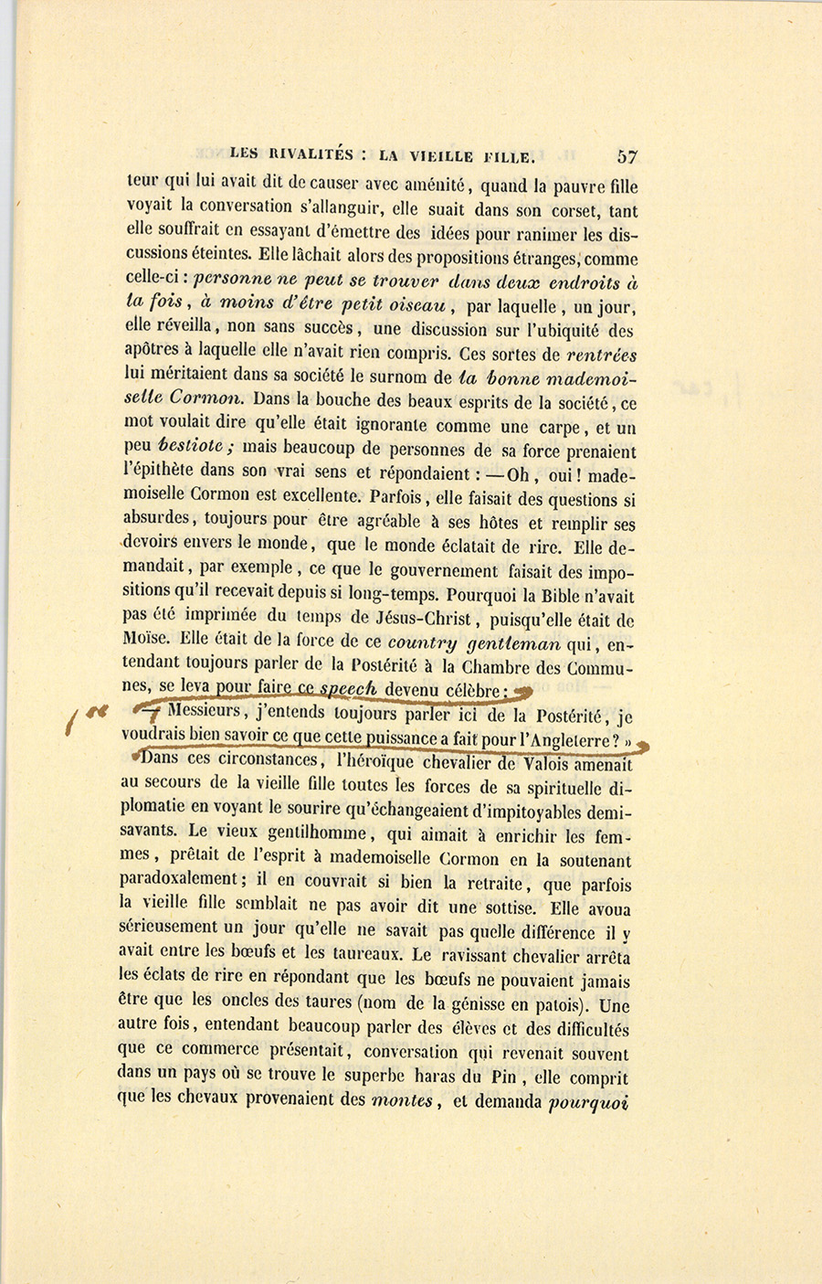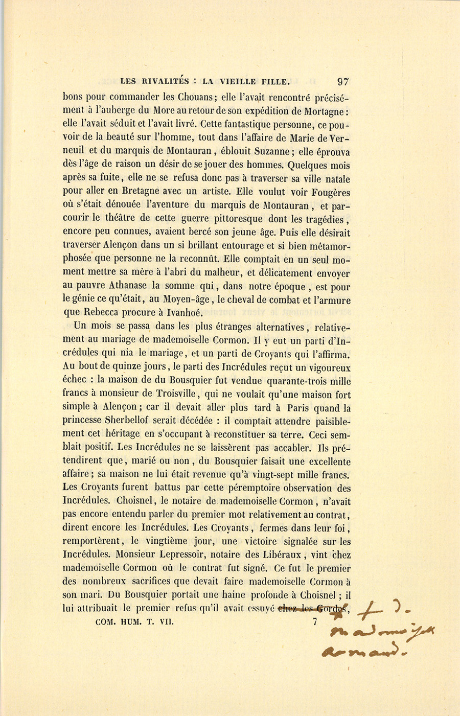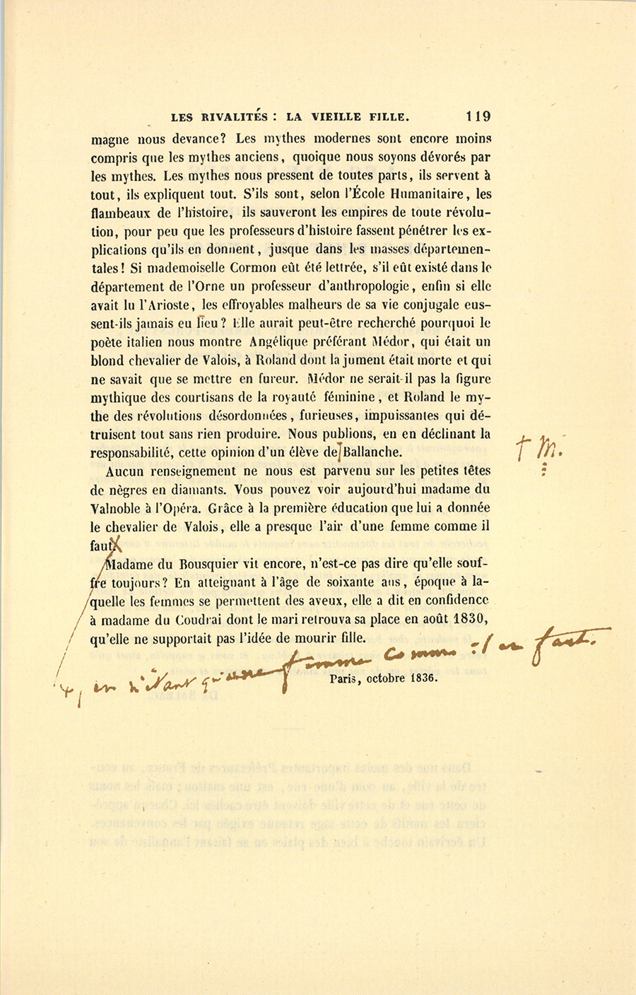 Quand cette histoire n’aurait d’autre effet que d’inspirer aux possesseurs de quelques reliques adorées une sainte peur, et les faire recourir à un codicille pour statuer immédiatement sur le sort de ces précieux souvenirs d’un bonheur qui n’est plus en les léguant à des mains fraternelles, elle aurait rendu d’énormes services à la portion chevaleresque et amoureuse du public ; mais elle renferme une moralité bien plus élevée !… ne démontre-t-elle pas la nécessité d’un enseignement nouveau ? N’invoque-t-elle pas, de la sollicitude si éclairée des ministres de l’instruction publique, la création de chaires d’anthropologie, science dans laquelle {p. 119} l’Allemagne nous devance ? Les mythes modernes sont encore moins compris que les mythes anciens, quoique nous soyons dévorés par les mythes. Les mythes nous pressent de toutes parts, ils servent à tout, ils expliquent tout. S’ils sont, selon l’École Humanitaire, les flambeaux de l’histoire, ils sauveront les empires de toute révolution, pour peu que les professeurs d’histoire fassent pénétrer les explications qu’ils en donnent, jusque dans les masses départementales ! Si mademoiselle Cormon eût été lettrée, s’il eût existé dans le département de l’Orne un professeur d’anthropologie, enfin si elle avait lu l’Arioste, les effroyables malheurs de sa vie conjugale eussent-ils jamais eu lieu ? Elle aurait peut-être recherché pourquoi le poète italien nous montre Angélique préférant Médor, qui était un blond chevalier de Valois, à Roland dont la jument était morte et qui ne savait que se mettre en fureur. Médor ne serait-il pas la figure mythique des courtisans de la royauté féminine, et Roland le mythe des révolutions désordonnées, furieuses, impuissantes qui détruisent tout sans rien produire. Nous publions, en en déclinant la responsabilité, cette opinion d’un élève de monsieur27 Ballanche.