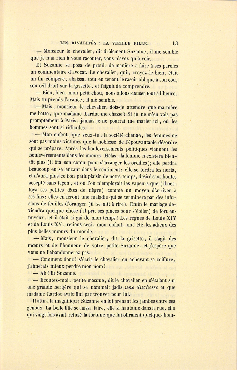 {p. 13} – Monsieur le chevalier, dit drôlement Suzanne, il me semble que je n’ai rien à vous raconter, vous n’avez qu’à voir.