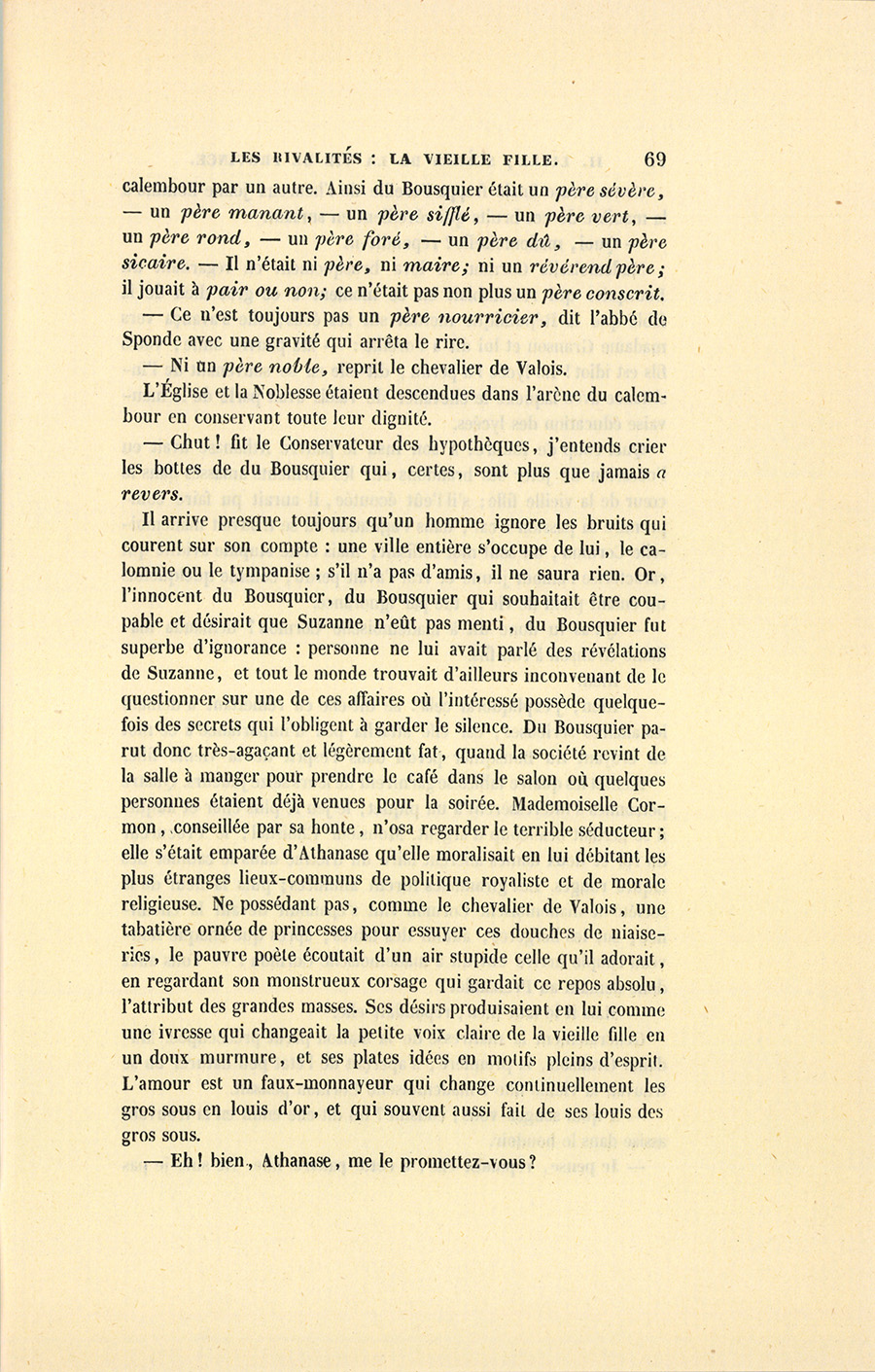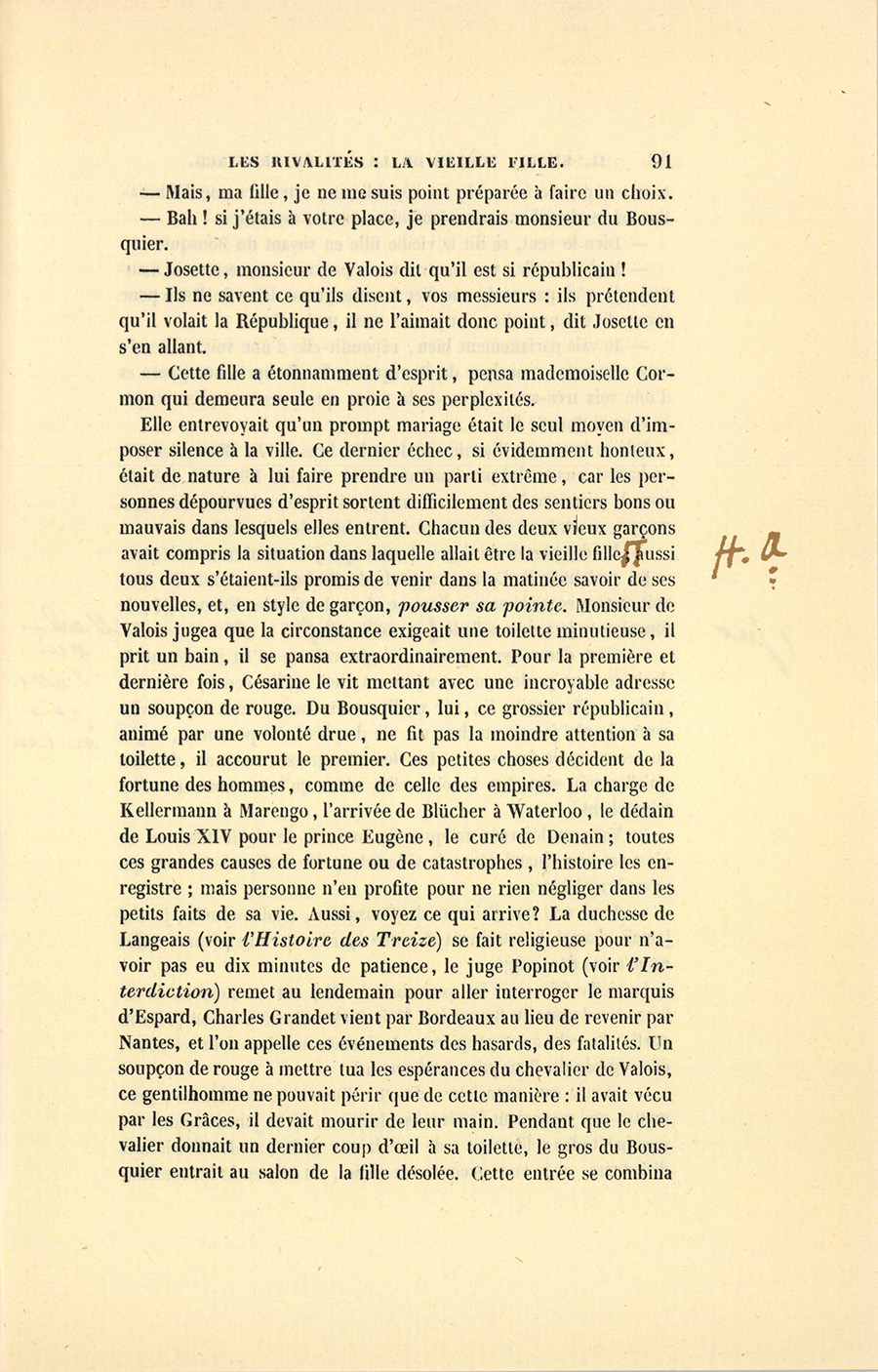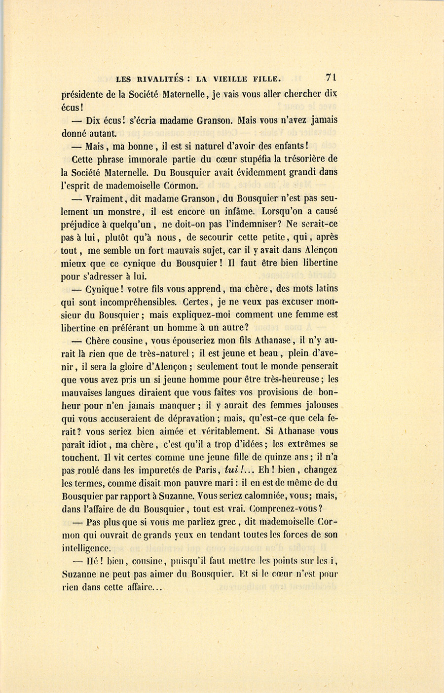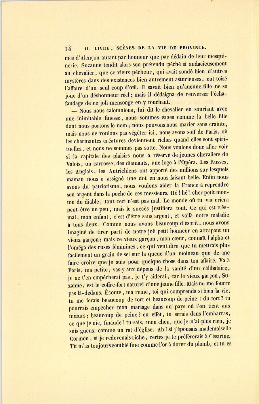 – Eh ! bien, où vas-tu ? dit du Bousquier inquiet. Voilà la belle vie de garçon, se dit-il. Je veux que le diable m’emporte si je me {p. 25} souviens de lui avoir chiffonné autre chose que sa collerette !… Et, paf ! elle s’autorise d’une plaisanterie pour tirer sur vous une lettre de change à brûle-pourpoint.