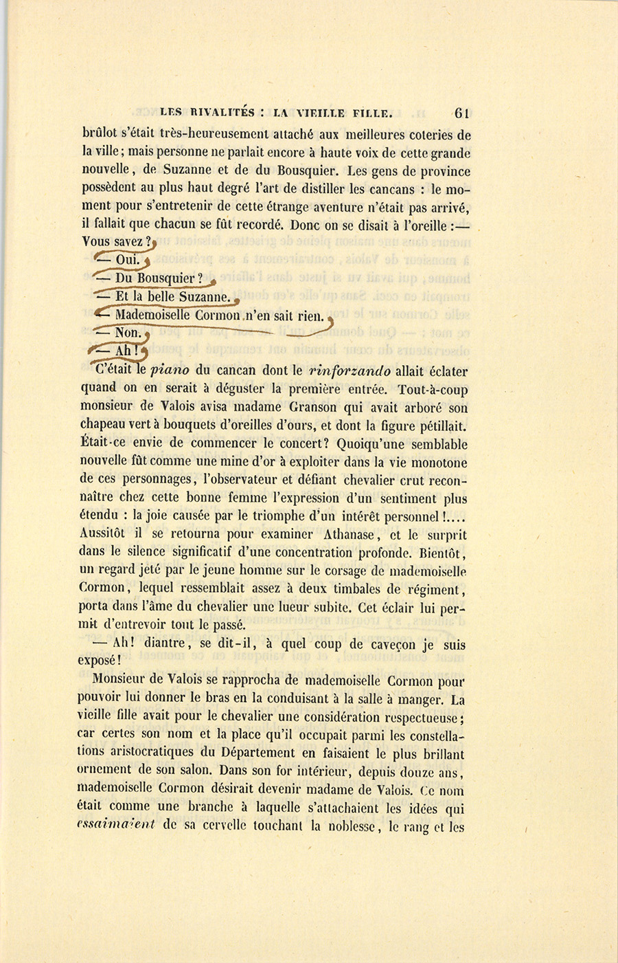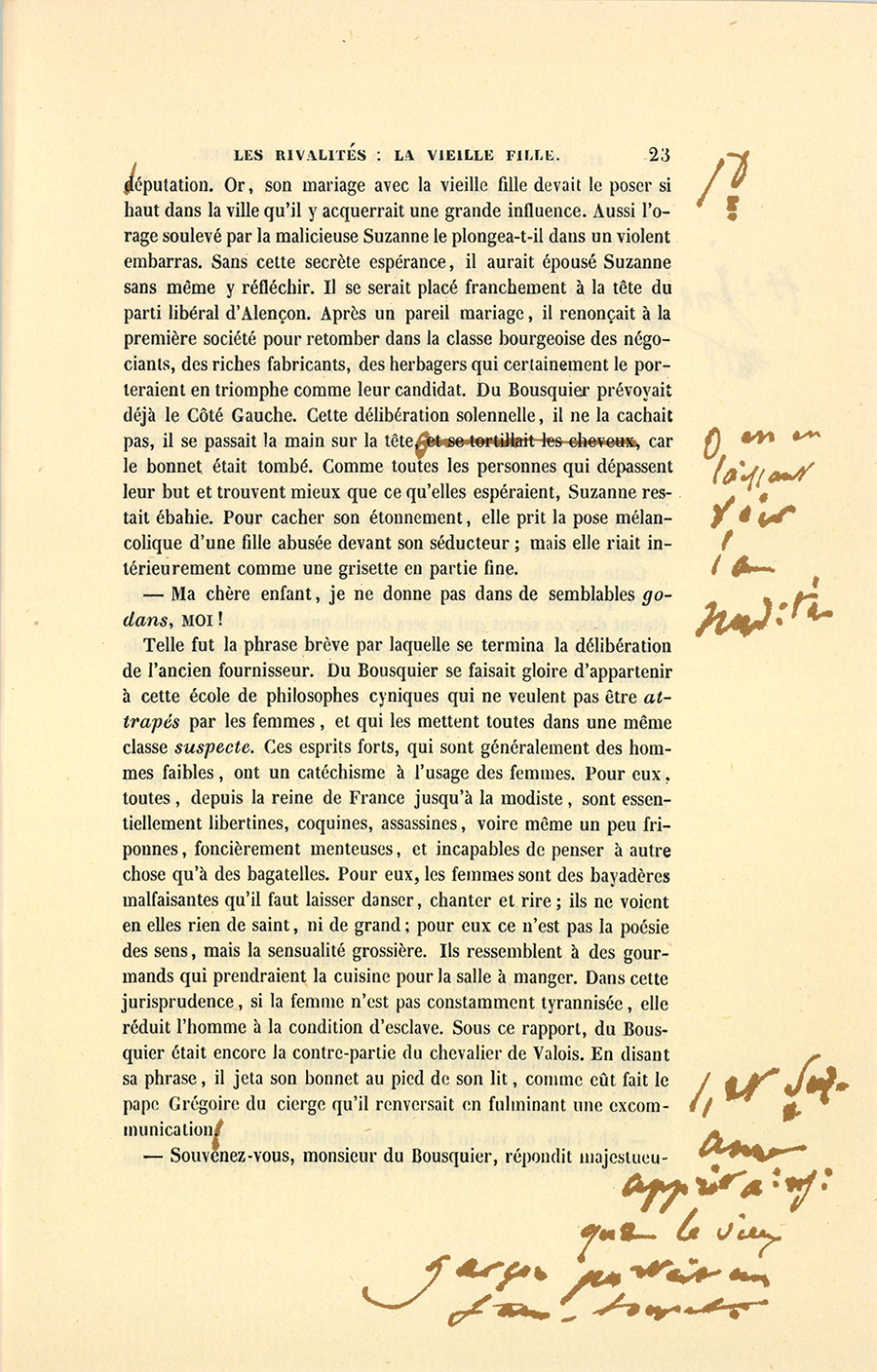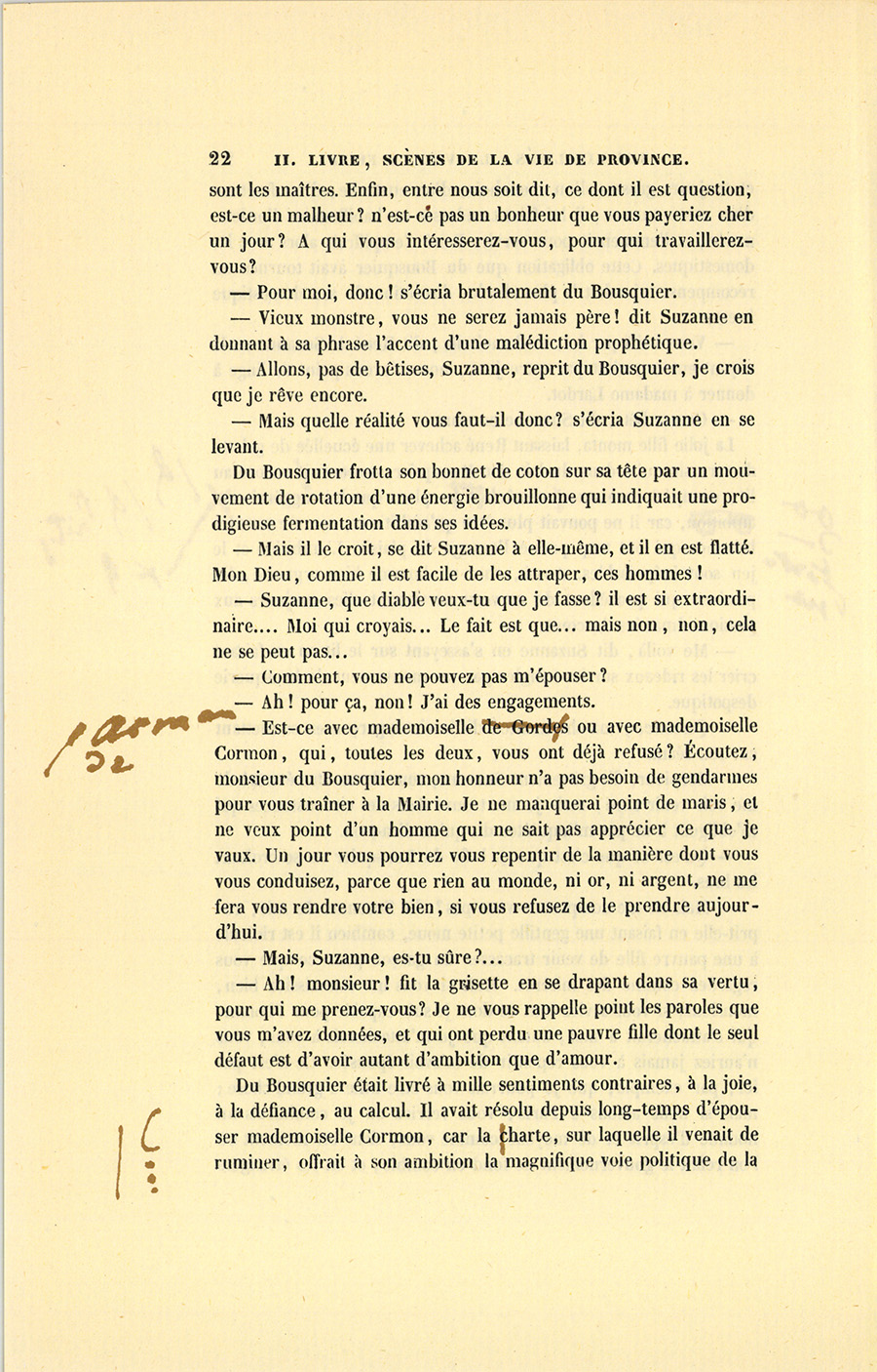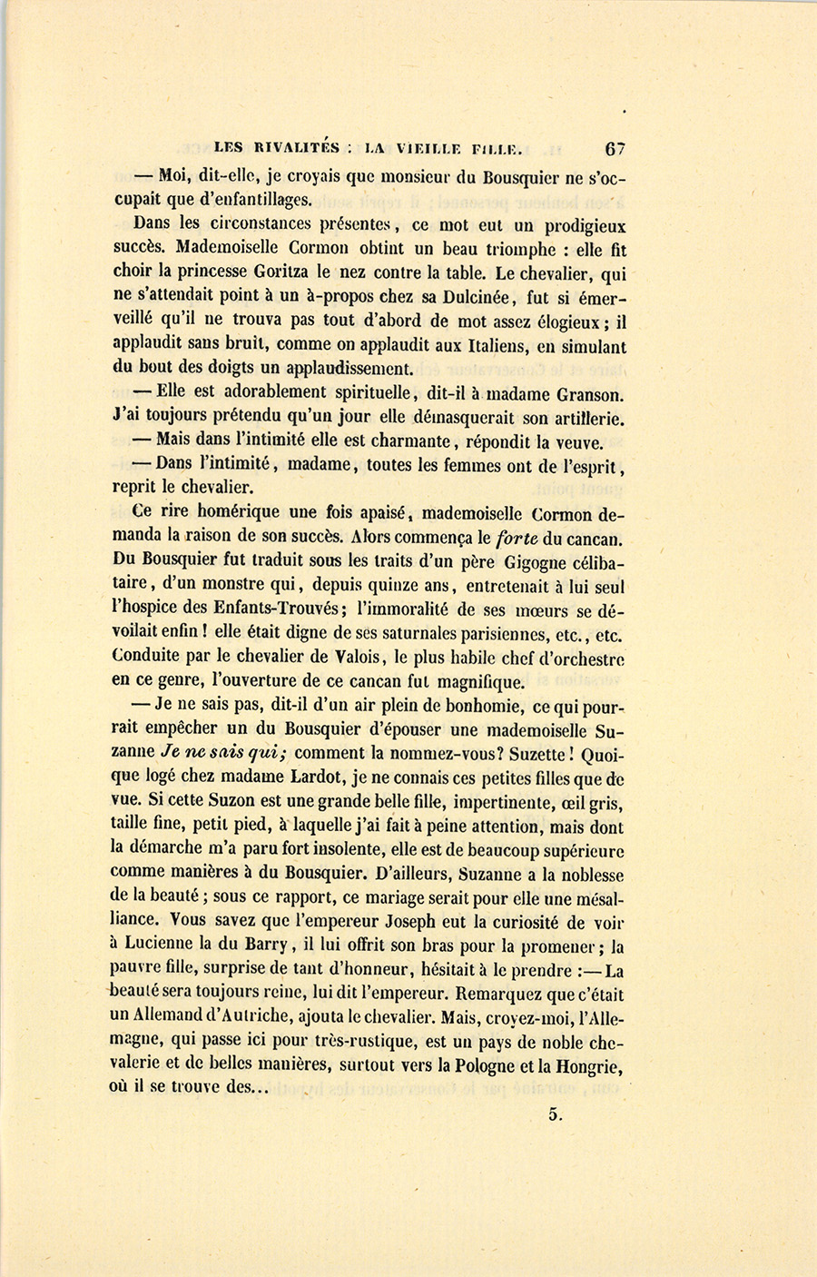 – Eh ! bien, où vas-tu ? dit du Bousquier inquiet. Voilà la belle vie de garçon, se dit-il. Je veux que le diable m’emporte si je me {p. 25} souviens de lui avoir chiffonné autre chose que sa collerette !… Et, paf ! elle s’autorise d’une plaisanterie pour tirer sur vous une lettre de change à brûle-pourpoint.