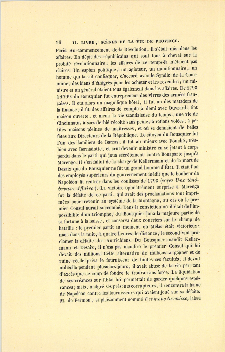 Issu d’une vieille famille d’Alençon, du Bousquier tenait le milieu entre le bourgeois et le hobereau. Son père avait exercé les fonctions judiciaires de Lieutenant-Criminel. Se trouvant sans ressources après la mort de son père, du Bousquier, comme tous les gens ruinés de la province, était allé chercher fortune à {p. 16} Paris. Au commencement de la Révolution, il s’était mis dans les affaires. En dépit des républicains qui sont tous à cheval sur la probité révolutionnaire, les affaires de ce temps-là n’étaient pas claires. Un espion politique, un agioteur, un munitionnaire, un homme qui faisait confisquer, d’accord avec le Syndic de la Commune, des biens d’émigrés pour les acheter et les revendre ; un ministre et un général étaient tous également dans les affaires. De 1793 à 1799, du Bousquier fut entrepreneur des vivres des armées françaises. Il eut alors un magnifique hôtel, il fut un des matadors de la finance, il fit des affaires de compte à demi avec Ouvrard, tint maison ouverte, et mena la vie scandaleuse du temps, une vie de Cincinnatus à sacs de blé récolté sans peine, à rations volées, à petites maisons pleines de maîtresses, et où se donnaient de belles fêtes aux Directeurs de la République. Le citoyen du Bousquier fut l’un des familiers de Barras, il fut au mieux avec Fouché, très bien avec Bernadotte, et crut devenir ministre en se jetant à corps perdu dans le parti qui joua secrètement contre Bonaparte jusqu’à Marengo. Il s’en fallut de la charge de Kellermann et de la mort de Desaix que du Bousquier ne fût un grand homme d’État. Il était l’un des employés supérieurs du gouvernement inédit que le bonheur de Napoléon fit rentrer dans les coulisses de 1793 (voyez Une ténébreuse Affaire). La victoire opiniâtrement surprise à Marengo fut la défaite de ce parti, qui avait des proclamations tout imprimées pour revenir au système de la Montagne, au cas où le premier Consul aurait succombé. Dans la conviction où il était de l’impossibilité d’un triomphe, du Bousquier joua la majeure partie de sa fortune à la baisse, et conserva deux courriers sur le champ de bataille : le premier partit au moment où Mélas était victorieux ; mais dans la nuit, à quatre heures de distance, le second vint proclamer la défaite des Autrichiens. Du Bousquier maudit Kellermann et Desaix, il n’osa pas maudire le premier Consul qui lui devait des millions. Cette alternative de millions à gagner et de ruine réelle priva le fournisseur de toutes ses facultés, il devint imbécile pendant plusieurs jours, il avait abusé de la vie par tant d’excès que ce coup de foudre le trouva sans force. La liquidation de ses créances sur l’État lui permettait de garder quelques espérances ; mais, malgré ses présents corrupteurs, il rencontra la haine de Napoléon contre les fournisseurs qui avaient joué sur sa défaite. Monsieur de Fermon, si plaisamment nommé Fermons la caisse, laissa {p. 17} du Bousquier sans un sou. L’immoralité de la vie privée, les liaisons de ce fournisseur avec Barras et Bernadotte déplurent au premier Consul encore plus que les manœuvres à la Bourse ; il le raya de la liste des Receveurs-Généraux où, par un reste de crédit, il s’était fait porter pour Alençon. De son opulence, du Bousquier conserva douze cents francs de rente viagère inscrite au Grand-Livre, un pur placement de caprice qui le sauva de la misère. Ignorant le résultat de la liquidation, ses créanciers ne lui laissèrent que mille francs de rente consolidés ; mais ils furent tous payés par les recouvrements et par la vente de l’hôtel de Beauséant que possédait du Bousquier. Ainsi le spéculateur, après avoir frisé la faillite, garda son nom tout entier. Un homme ruiné par le premier Consul, et précédé par la réputation colossale que lui avaient faite ses relations avec les chefs des gouvernements passés, son train de vie, son règne passager intéressa la ville d’Alençon où dominait secrètement le royalisme. Du Bousquier furieux contre Bonaparte, racontant les misères du premier Consul, les débordements de Joséphine et les anecdotes secrètes de dix ans de révolution, fut très-bien accueilli. Vers ce temps, quoiqu’il fût bien et dûment quadragénaire, du Bousquier se produisit comme un garçon de trente-six ans, de moyenne taille, gras comme un fournisseur, faisant parade de ses mollets de procureur égrillard, à physionomie fortement marquée, ayant le nez aplati mais à naseaux garnis de poils ; des yeux noirs à sourcils fournis et d’où sortait un regard fin comme celui de monsieur de Talleyrand, mais un peu éteint ; il conservait les nageoires républicaines, et portait fort longs ses cheveux bruns. Ses mains, enrichies de petits bouquets de poils à chaque phalange, offraient la preuve d’une riche musculature par de grosses veines bleues, saillantes. Enfin, il avait le poitrail de l’Hercule-Farnèse, et des épaules à soutenir la rente. On ne voit aujourd’hui de ces sortes d’épaules qu’à Tortoni. Ce luxe de vie masculine était admirablement peint par un mot en usage pendant le dernier siècle, et qui se comprend à peine aujourd’hui : dans le style galant de l’autre époque, du Bousquier eût passé pour un vrai payeur d’arrérages. Mais, comme chez le chevalier de Valois, il se rencontrait chez du Bousquier des symptômes qui contrastaient avec l’aspect général de la personne. Ainsi, l’ancien fournisseur n’avait pas la voix de ses muscles, non que sa voix fût ce petit filet maigre qui sort quelquefois de la bouche de ces phoques à deux pieds ; c’était au {p. 18} contraire une voix forte mais étouffée, de laquelle on ne peut donner une idée qu’en la comparant au bruit que fait une scie dans un bois tendre et mouillé ; enfin, la voix d’un spéculateur éreinté.