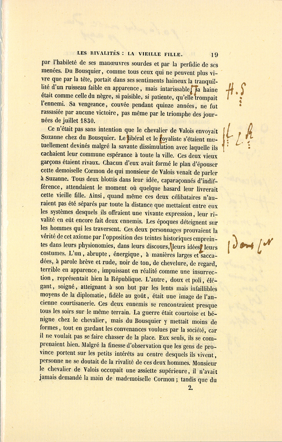 Ce n’était pas sans intention que le chevalier de Valois envoyait Suzanne chez du Bousquier. Le Libéral et le Royaliste s’étaient mutuellement devinés malgré la savante dissimulation avec laquelle ils cachaient leur commune espérance à toute la ville. Ces deux vieux garçons étaient rivaux. Chacun d’eux avait formé le plan d’épouser cette demoiselle Cormon de qui monsieur de Valois venait de parler à Suzanne. Tous deux blottis dans leur idée, caparaçonnés d’indifférence, attendaient le moment où quelque hasard leur livrerait cette vieille fille. Ainsi, quand même ces deux célibataires n’auraient pas été séparés par toute la distance que mettaient entre eux les systèmes desquels ils offraient une vivante expression, leur rivalité en eût encore fait deux ennemis. Les époques déteignent sur les hommes qui les traversent. Ces deux personnages prouvaient la vérité de cet axiome par l’opposition des teintes historiques empreintes dans leurs physionomies, dans leurs discours, dans leurs idées et leurs costumes. L’un, abrupt5, énergique, à manières larges et saccadées, à parole brève et rude, noir de ton, de chevelure, de regard, terrible en apparence, impuissant en réalité comme une insurrection, représentait bien la République. L’autre, doux et poli, élégant, soigné, atteignant à son but par les lents mais infaillibles moyens de la diplomatie, fidèle au goût, était une image de l’ancienne courtisanerie. Ces deux ennemis se rencontraient presque tous les soirs sur le même terrain. La guerre était courtoise et bénigne chez le chevalier, mais du Bousquier y mettait moins de formes, tout en gardant les convenances voulues par la société, car il ne voulait pas se faire chasser de la place. Eux seuls, ils se comprenaient bien. Malgré la finesse d’observation que les gens de province portent sur les petits intérêts au centre desquels ils vivent, personne ne se doutait de la rivalité de ces deux hommes. Monsieur le chevalier de Valois occupait une assiette supérieure, il n’avait jamais demandé la main de mademoiselle Cormon ; tandis que du {p. 20} Bousquier, qui s’était mis sur les rangs après son échec dans la maison la plus noble du pays, avait été refusé. Mais le chevalier supposait encore de grandes chances à son rival pour lui porter un coup de Jarnac si profondément enfoncé avec une lame trempée et préparée comme l’était Suzanne. Le chevalier avait jeté la sonde dans les eaux de du Bousquier ; et, comme on va le voir, il ne s’était trompé dans aucune de ses conjectures.