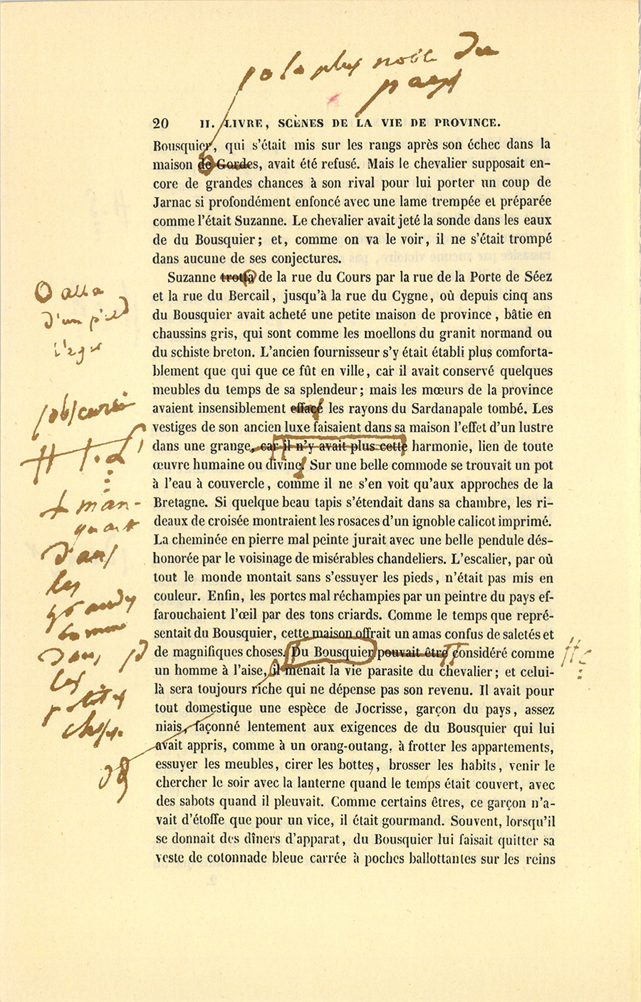 Suzanne alla d’un pied léger de la rue du Cours par la rue de la Porte de Séez et la rue du Bercail, jusqu’à la rue du Cygne, où depuis cinq ans du Bousquier avait acheté une petite maison de province, bâtie en chaussins gris, qui sont comme les moellons du granit normand ou du schiste breton. L’ancien fournisseur s’y était établi plus comfortablement que qui que ce fût en ville, car il avait conservé quelques meubles du temps de sa splendeur ; mais les mœurs de la province avaient insensiblement obscurci les rayons du Sardanapale tombé. Les vestiges de son ancien luxe faisaient dans sa maison l’effet d’un lustre dans une grange. L’harmonie, lien de toute œuvre humaine ou divine, manquait dans les grandes comme dans les petites choses. Sur une belle commode se trouvait un pot à l’eau à couvercle, comme il ne s’en voit qu’aux approches de la Bretagne. Si quelque beau tapis s’étendait dans sa chambre, les rideaux de croisée montraient les rosaces d’un ignoble calicot imprimé. La cheminée en pierre mal peinte jurait avec une belle pendule déshonorée par le voisinage de misérables chandeliers. L’escalier, par où tout le monde montait sans s’essuyer les pieds, n’était pas mis en couleur. Enfin, les portes mal réchampies par un peintre du pays effarouchaient l’œil par des tons criards. Comme le temps que représentait du Bousquier, cette maison offrait un amas confus de saletés et de magnifiques choses. Considéré comme un homme à l’aise, du Bousquier menait la vie parasite du chevalier ; et celui-là sera toujours riche qui ne dépense pas son revenu. Il avait pour tout domestique une espèce de Jocrisse, garçon du pays, assez niais, façonné lentement aux exigences de du Bousquier qui lui avait appris, comme à un orang-outang, à frotter les appartements, essuyer les meubles, cirer les bottes, brosser les habits, venir le chercher le soir avec la lanterne quand le temps était couvert, avec des sabots quand il pleuvait. Comme certains êtres, ce garçon n’avait d’étoffe que pour un vice, il était gourmand. Souvent, lorsqu’il se donnait des dîners d’apparat, du Bousquier lui faisait quitter sa veste de cotonnade bleue carrée à poches ballottantes sur les reins {p. 21} et toujours grosses d’un mouchoir, d’un eustache, d’un fruit ou d’un casse-museau, il lui faisait endosser un habillement d’ordonnance, et l’emmenait pour servir. René s’empiffrait alors avec les domestiques. Cette obligation que du Bousquier avait tournée en récompense lui valait la plus absolue discrétion de son domestique breton.