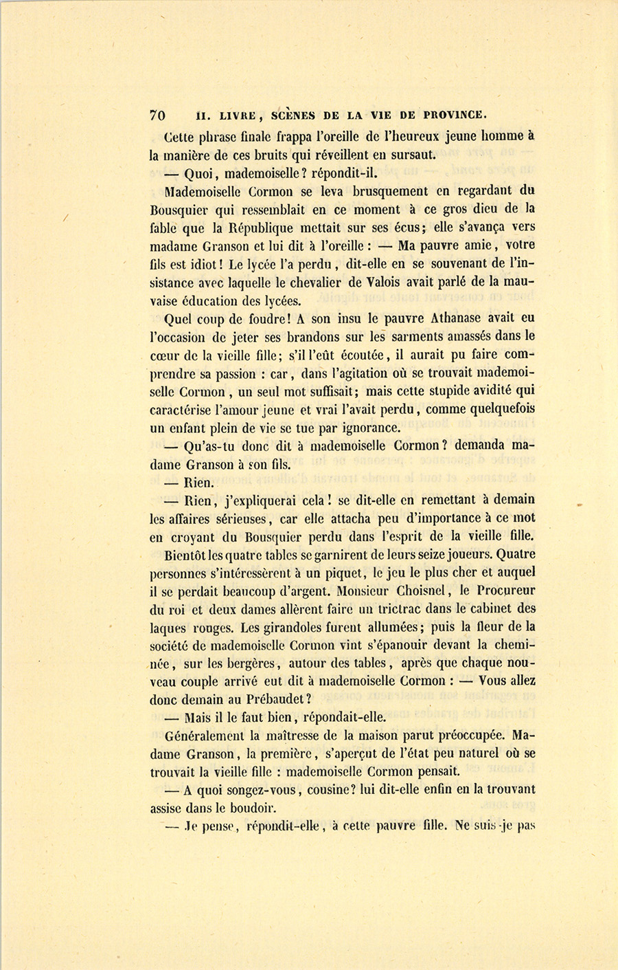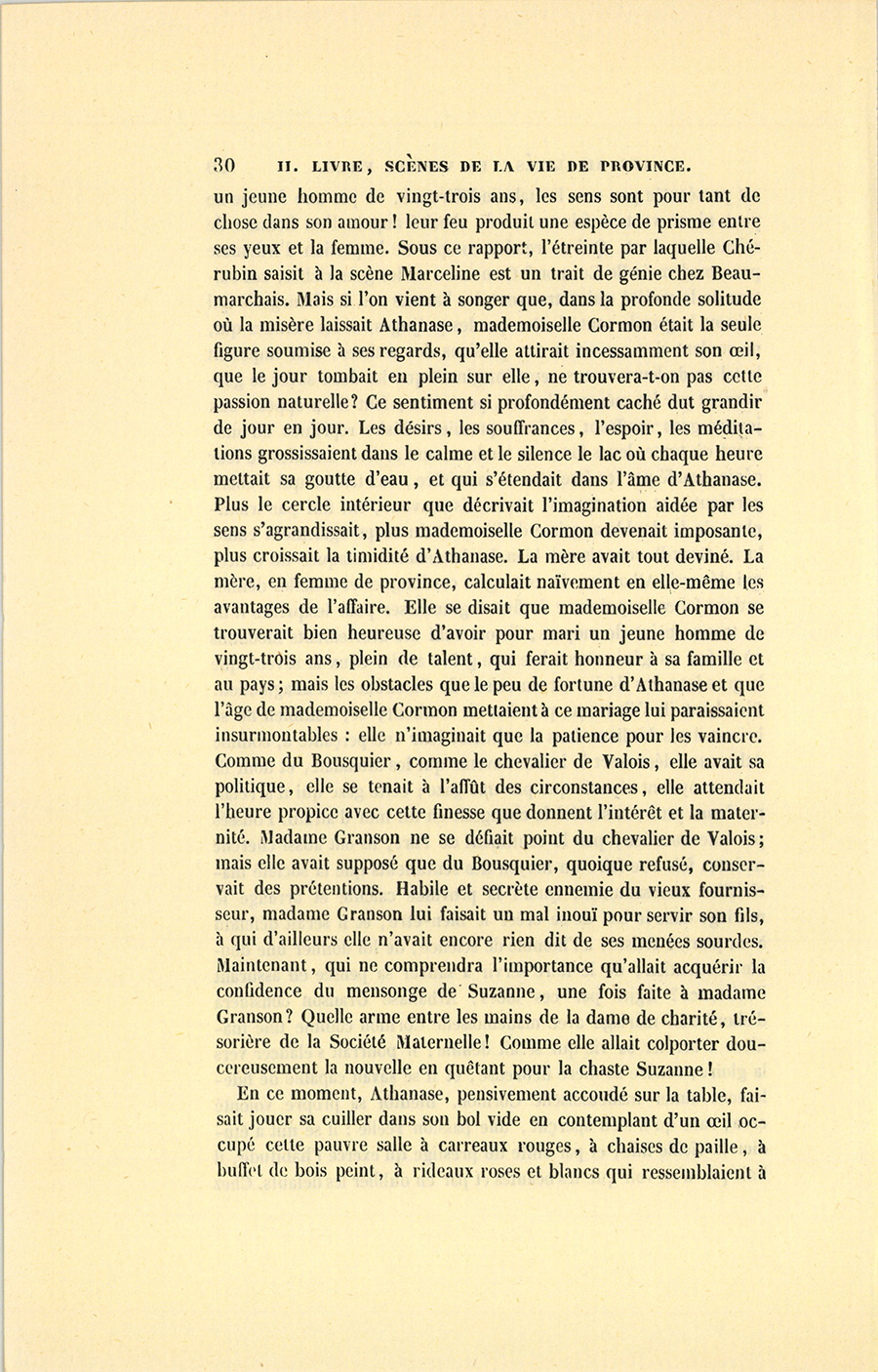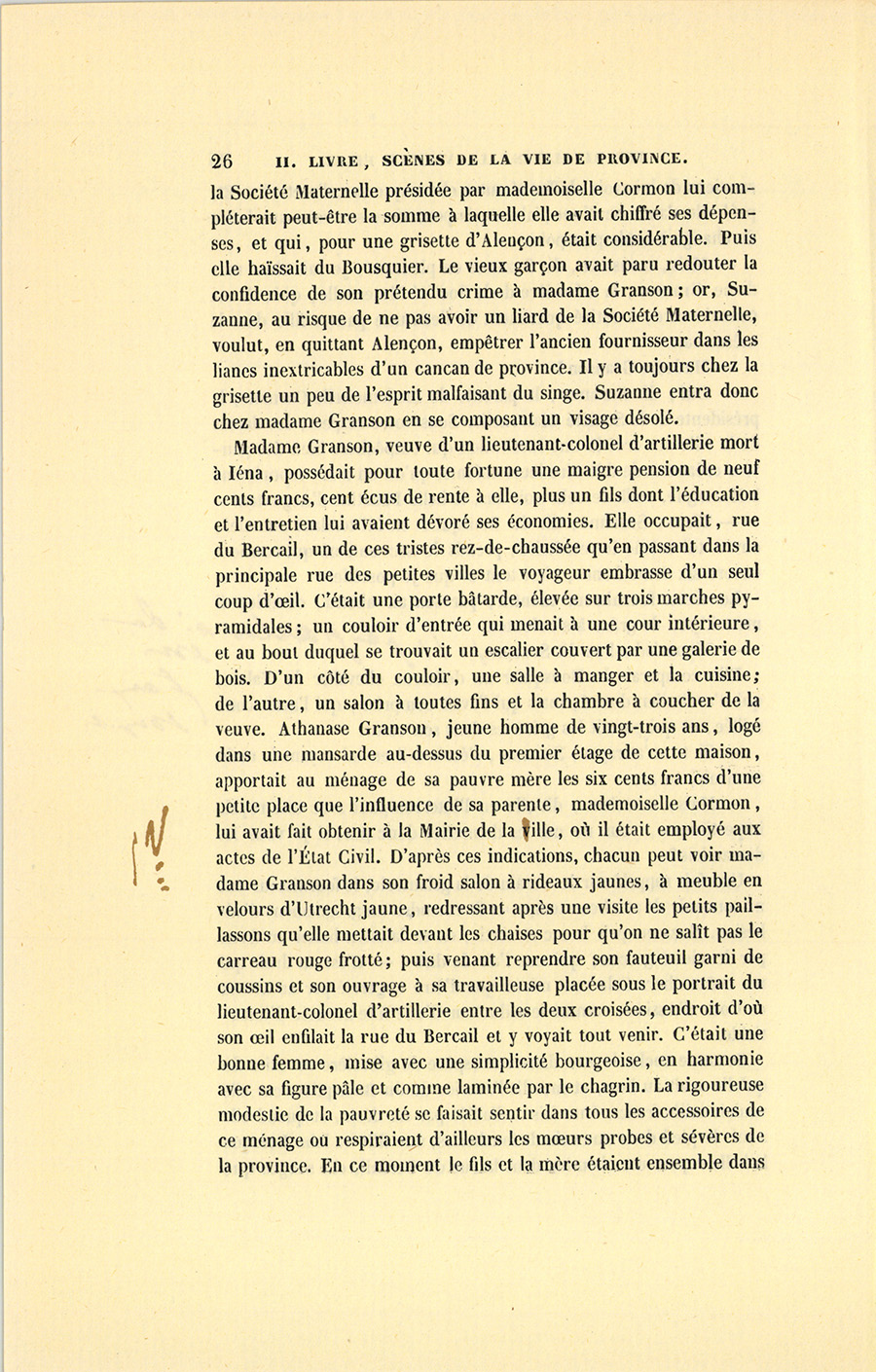 Madame Granson, veuve d’un lieutenant-colonel d’artillerie mort à Iéna, possédait pour toute fortune une maigre pension de neuf cents francs, cent écus de rente à elle, plus un fils dont l’éducation et l’entretien lui avaient dévoré ses économies. Elle occupait, rue du Bercail, un de ces tristes rez-de-chaussée qu’en passant dans la principale rue des petites villes le voyageur embrasse d’un seul coup d’œil. C’était une porte bâtarde, élevée sur trois marches pyramidales ; un couloir d’entrée qui menait à une cour intérieure, et au bout duquel se trouvait un escalier couvert par une galerie de bois. D’un côté du couloir, une salle à manger et la cuisine ; de l’autre, un salon à toutes fins et la chambre à coucher de la veuve. Athanase Granson, jeune homme de vingt-trois ans, logé dans une mansarde au-dessus du premier étage de cette maison, apportait au ménage de sa pauvre mère les six cents francs d’une petite place que l’influence de sa parente, mademoiselle Cormon, lui avait fait obtenir à la Mairie de la Ville, où il était employé aux actes de l’État Civil. D’après ces indications, chacun peut voir madame Granson dans son froid salon à rideaux jaunes, à meuble en velours d’Utrecht jaune, redressant après une visite les petits paillassons qu’elle mettait devant les chaises pour qu’on ne salît pas le carreau rouge frotté ; puis venant reprendre son fauteuil garni de coussins et son ouvrage à sa travailleuse placée sous le portrait du lieutenant-colonel d’artillerie entre les deux croisées, endroit d’où son œil enfilait la rue du Bercail et y voyait tout venir. C’était une bonne femme, mise avec une simplicité bourgeoise, en harmonie avec sa figure pâle et comme laminée par le chagrin. La rigoureuse modestie de la pauvreté se faisait sentir dans tous les accessoires de ce ménage où respiraient d’ailleurs les mœurs probes et sévères de la province. En ce moment le fils et la mère étaient ensemble dans {p. 27} la salle à manger, où ils déjeunaient d’une tasse de café accompagnée de beurre et de radis. Pour faire comprendre le plaisir que la visite de Suzanne allait causer à madame Granson, il faut expliquer les secrets intérêts de la mère et du fils.