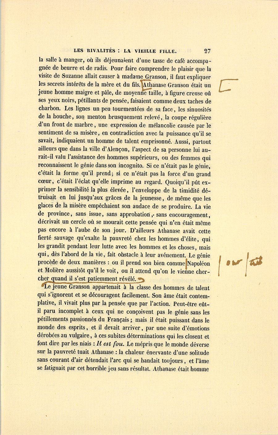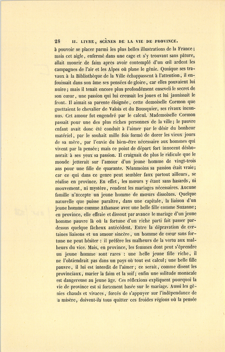 Athanase Granson était un jeune homme maigre et pâle, de moyenne taille, à figure creuse où ses yeux noirs, pétillants de pensée, faisaient comme deux taches de charbon. Les lignes un peu tourmentées de sa face, les sinuosités de la bouche, son menton brusquement relevé, la coupe régulière d’un front de marbre, une expression de mélancolie causée par le sentiment de sa misère, en contradiction avec la puissance qu’il se savait, indiquaient un homme de talent emprisonné. Aussi, partout ailleurs que dans la ville d’Alençon, l’aspect de sa personne lui aurait-il valu l’assistance des hommes supérieurs, ou des femmes qui reconnaissent le génie dans son incognito. Si ce n’était pas le génie, c’était la forme qu’il prend ; si ce n’était pas la force d’un grand cœur, c’était l’éclat qu’elle imprime au regard. Quoiqu’il pût exprimer la sensibilité la plus élevée, l’enveloppe de la timidité détruisait en lui jusqu’aux grâces de la jeunesse, de même que les glaces de la misère empêchaient son audace de se produire. La vie de province, sans issue, sans approbation, sans encouragement, décrivait un cercle où se mourait cette pensée qui n’en était même pas encore à l’aube de son jour. D’ailleurs Athanase avait cette fierté sauvage qu’exalte la pauvreté chez les hommes d’élite, qui les grandit pendant leur lutte avec les hommes et les choses, mais qui, dès l’abord de la vie, fait obstacle à leur avénement. Le génie procède de deux manières : ou il prend son bien comme ont fait Napoléon et Molière aussitôt qu’il le voit, ou il attend qu’on le vienne chercher quand il s’est patiemment révélé. Le jeune Granson appartenait à la classe des hommes de talent qui s’ignorent et se découragent facilement. Son âme était contemplative, il vivait plus par la pensée que par l’action. Peut-être eût-il paru incomplet à ceux qui ne conçoivent pas le génie sans les pétillements passionnés du Français ; mais il était puissant dans le monde des esprits, et il devait arriver, par une suite d’émotions dérobées au vulgaire, à ces subites déterminations qui les closent et font dire par les niais : Il est fou. Le mépris que le monde déverse sur la pauvreté tuait Athanase : la chaleur énervante d’une solitude sans courant d’air détendait l’arc qui se bandait toujours, et l’âme se fatiguait par cet horrible jeu sans résultat. Athanase était homme {p. 28} à pouvoir se placer parmi les plus belles illustrations de la France ; mais cet aigle, enfermé dans une cage et s’y trouvant sans pâture, allait mourir de faim après avoir contemplé d’un œil ardent les campagnes de l’air et les Alpes où plane le génie. Quoique ses travaux à la Bibliothèque de la Ville échappassent à l’attention, il enfouissait dans son âme ses pensées de gloire, car elles pouvaient lui nuire ; mais il tenait encore plus profondément enseveli le secret de son cœur, une passion qui lui creusait les joues et lui jaunissait le front. Il aimait sa parente éloignée, cette demoiselle Cormon que guettaient le chevalier de Valois et du Bousquier, ses rivaux inconnus. Cet amour fut engendré par le calcul. Mademoiselle Cormon passait pour une des plus riches personnes de la ville ; le pauvre enfant avait donc été conduit à l’aimer par le désir du bonheur matériel, par le souhait mille fois formé de dorer les vieux jours de sa mère, par l’envie du bien-être nécessaire aux hommes qui vivent par la pensée ; mais ce point de départ fort innocent déshonorait à ses yeux sa passion. Il craignait de plus le ridicule que le monde jetterait sur l’amour d’un jeune homme de vingt-trois ans pour une fille de quarante. Néanmoins sa passion était vraie ; car ce qui dans ce genre peut sembler faux partout ailleurs, se réalise en province. En effet, les mœurs y étant sans hasards, ni mouvement, ni mystère, rendent les mariages nécessaires. Aucune famille n’accepte un jeune homme de mœurs dissolues. Quelque naturelle que puisse paraître, dans une capitale, la liaison d’un jeune homme comme Athanase avec une belle fille comme Suzanne ; en province, elle effraie et dissout par avance le mariage d’un jeune homme pauvre là où la fortune d’un riche parti fait passer par-dessus quelque fâcheux antécédent. Entre la dépravation de certaines liaisons et un amour sincère, un homme de cœur sans fortune ne peut hésiter : il préfère les malheurs de la vertu aux malheurs du vice. Mais, en province, les femmes dont peut s’éprendre un jeune homme sont rares : une belle jeune fille riche, il ne l’obtiendrait pas dans un pays où tout est calcul ; une belle fille pauvre, il lui est interdit de l’aimer ; ce serait, comme disent les provinciaux, marier la faim et la soif ; enfin une solitude monacale est dangereuse au jeune âge. Ces réflexions expliquent pourquoi la vie de province est si fortement basée sur le mariage. Aussi les génies chauds et vivaces, forcés de s’appuyer sur l’indépendance de la misère, doivent-ils tous quitter ces froides régions où la pensée {p. 29} est persécutée par une brutale indifférence, où pas une femme ne peut ni ne veut se faire sœur de charité auprès d’un homme de science ou d’art. Qui se rendra compte de la passion d’Athanase pour mademoiselle Cormon ? Ce ne sera ni les gens riches, ces sultans de la société qui y trouvent des harems, ni les bourgeois qui suivent la grande route battue par les préjugés, ni les femmes qui, ne voulant rien concevoir aux passions des artistes, leur imposent le talion de leurs vertus, en s’imaginant que les deux sexes se gouvernent par les mêmes lois. Ici, peut-être, faut-il en appeler aux jeunes gens souffrant de leurs premiers désirs réprimés au moment où toutes leurs forces se tendent, aux artistes malades de leur génie étouffé par les étreintes de la misère, aux talents qui