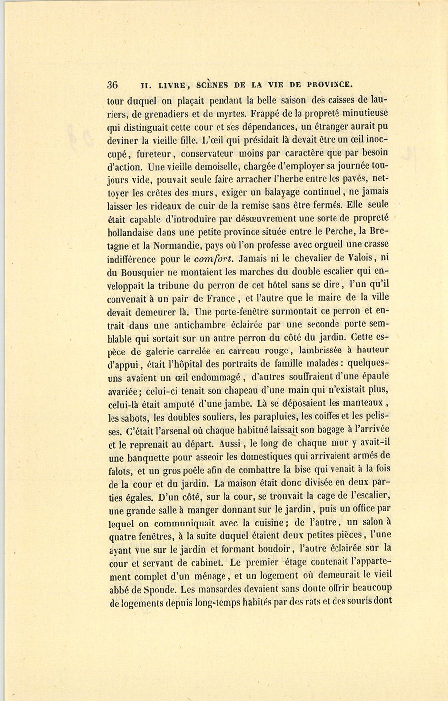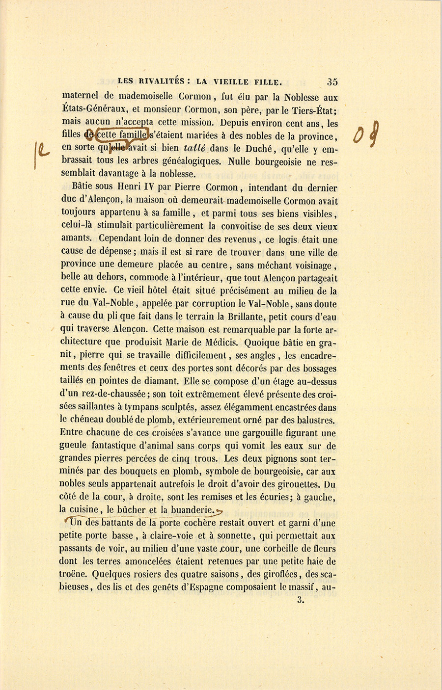 Bâtie sous Henri IV par Pierre Cormon, intendant du dernier duc d’Alençon, la maison où demeurait mademoiselle Cormon avait toujours appartenu à sa famille, et parmi tous ses biens visibles, celui-là stimulait particulièrement la convoitise de ses deux vieux amants. Cependant loin de donner des revenus, ce logis était une cause de dépense ; mais il est si rare de trouver dans une ville de province une demeure placée au centre, sans méchant voisinage, belle au dehors, commode à l’intérieur, que tout Alençon partageait cette envie. Ce vieil hôtel était situé précisément au milieu de la rue du Val-Noble, appelée par corruption le Val-Noble, sans doute à cause du pli que fait dans le terrain la Brillante, petit cours d’eau qui traverse Alençon. Cette maison est remarquable par la forte architecture que produisit Marie de Médicis. Quoique bâtie en granit, pierre qui se travaille difficilement, ses angles, les encadrements des fenêtres et ceux des portes sont décorés par des bossages taillés en pointes de diamant. Elle se compose d’un étage au-dessus d’un rez-de-chaussée ; son toit extrêmement élevé présente des croisées saillantes à tympans sculptés, assez élégamment encastrées dans le chéneau doublé de plomb, extérieurement orné par des balustres. Entre chacune de ces croisées s’avance une gargouille figurant une gueule fantastique d’animal sans corps qui vomit les eaux sur de grandes pierres percées de cinq trous. Les deux pignons sont terminés par des bouquets en plomb, symbole de bourgeoisie, car aux nobles seuls appartenait autrefois le droit d’avoir des girouettes. Du côté de la cour, à droite, sont les remises et les écuries ; à gauche, la cuisine, le bûcher et la buanderie. Un des battants de la porte cochère restait ouvert et garni d’une petite porte basse, à claire-voie et à sonnette, qui permettait aux passants de voir, au milieu d’une vaste cour, une corbeille de fleurs dont les terres amoncelées étaient retenues par une petite haie de troëne. Quelques rosiers des quatre saisons, des giroflées, des scabieuses, des lis et des genêts d’Espagne composaient le massif, {p. 36} autour duquel on plaçait pendant la belle saison des caisses de lauriers, de grenadiers et de myrtes. Frappé de la propreté minutieuse qui distinguait cette cour et ses dépendances, un étranger aurait pu deviner la vieille fille. L’œil qui présidait là devait être un œil inoccupé, fureteur, conservateur moins par caractère que par besoin d’action. Une vieille demoiselle, chargée d’employer sa journée toujours vide, pouvait seule faire arracher l’herbe entre les pavés, nettoyer les crêtes des murs, exiger un balayage continuel, ne jamais laisser les rideaux de cuir de la remise sans être fermés. Elle seule était capable d’introduire par désœuvrement une sorte de propreté hollandaise dans une petite province située entre le Perche, la Bretagne et la Normandie, pays où l’on professe avec orgueil une crasse indifférence pour le comfort. Jamais ni le chevalier de Valois, ni du Bousquier ne montaient les marches du double escalier qui enveloppait la tribune du perron de cet hôtel sans se dire, l’un qu’il convenait à un pair de France, et l’autre que le maire de la ville devait demeurer là. Une porte-fenêtre surmontait ce perron et entrait dans une antichambre éclairée par une seconde porte semblable qui sortait sur un autre perron du côté du jardin. Cette espèce de galerie carrelée en carreau rouge, lambrissée à hauteur d’appui, était l’hôpital des portraits de famille malades : quelques-uns avaient un œil endommagé, d’autres souffraient d’une épaule avariée ; celui-ci tenait son chapeau d’une main qui n’existait plus, celui-là était amputé d’une jambe. Là se déposaient les manteaux, les sabots, les doubles souliers, les parapluies, les coiffes et les pelisses. C’était l’arsenal où chaque habitué laissait son bagage à l’arrivée et le reprenait au départ. Aussi, le long de chaque mur y avait-il une banquette pour asseoir les domestiques qui arrivaient armés de falots, et un gros poêle afin de combattre la bise qui venait à la fois de la cour et du jardin. La maison était donc divisée en deux parties égales. D’un côté, sur la cour, se trouvait la cage de l’escalier, une grande salle à manger donnant sur le jardin, puis un office par lequel on communiquait avec la cuisine ; de l’autre, un salon à quatre fenêtres, à la suite duquel étaient deux petites pièces, l’une ayant vue sur le jardin et formant boudoir, l’autre éclairée sur la cour et servant de cabinet. Le premier étage contenait l’appartement complet d’un ménage, et un logement où demeurait le vieil abbé de Sponde. Les mansardes devaient sans doute offrir beaucoup de logements depuis long-temps habités par des rats et des souris dont {p. 37} les hauts-faits nocturnes étaient redits par mademoiselle Cormon au chevalier de Valois, en s’étonnant de l’inutilité des moyens employés contre eux. Le jardin, d’environ un demi-arpent, est margé par la Brillante, ainsi nommée à cause des parcelles de mica qui paillettent son lit ; mais partout ailleurs que dans le Val-Noble où ses eaux maigres sont chargées de teintures et des débris qu’y jettent les industries de la ville. La rive opposée au jardin de mademoiselle Cormon est encombrée, comme dans toutes les villes de province où passe un cours d’eau, de maisons où s’exercent des professions altérées ; mais par bonheur elle n’avait alors en face d’elle que des gens tranquilles, des bourgeois, un boulanger, un dégraisseur, des ébénistes. Ce jardin, plein de fleurs communes, est terminé naturellement par une terrasse formant un quai, au bas de laquelle se trouvent quelques marches pour descendre à la Brillante. Sur la balustrade de la terrasse imaginez de grands vases en faïence bleue 