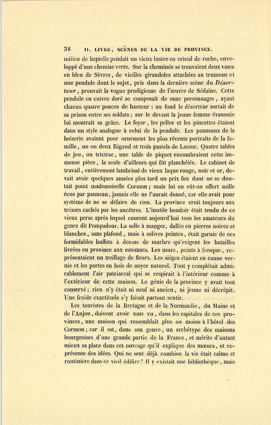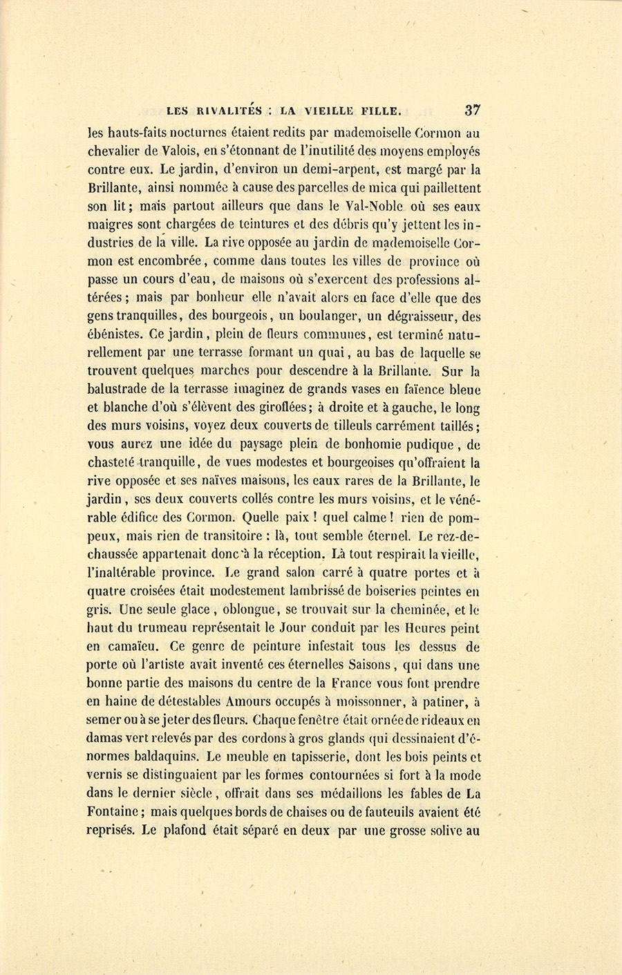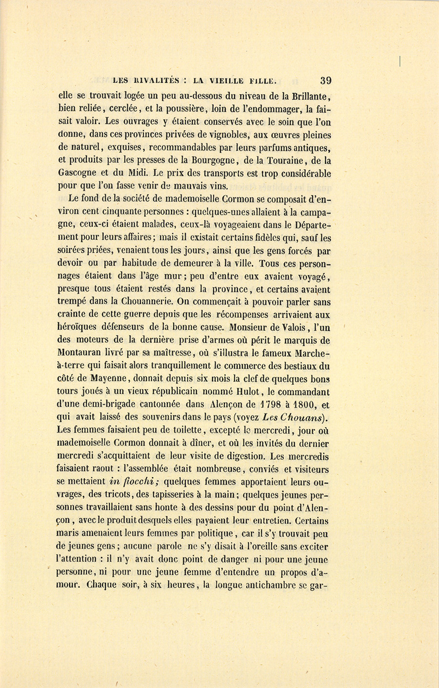 Les touristes de la Bretagne et de la Normandie, du Maine et de l’Anjou, doivent avoir tous vu, dans les capitales de ces provinces, une maison qui ressemblait plus ou moins à l’hôtel des Cormon ; car il est, dans son genre, un archétype des maisons bourgeoises d’une grande partie de la France, et mérite d’autant mieux sa place dans cet ouvrage qu’il explique des mœurs, et représente des idées. Qui ne sent déjà combien la vie était calme et routinière dans ce vieil édifice ? Il y existait une bibliothèque, mais {p. 39} elle se trouvait logée un peu au-dessous du niveau de la Brillante, bien reliée, cerclée, et la poussière, loin de l’endommager, la faisait valoir. Les ouvrages y étaient conservés avec le soin que l’on donne, dans ces provinces privées de vignobles, aux œuvres pleines de naturel, exquises, recommandables par leurs parfums antiques, et produits par les presses de la Bourgogne, de la Touraine, de la Gascogne et du Midi. Le prix des transports est trop considérable pour que l’on fasse venir de mauvais vins.