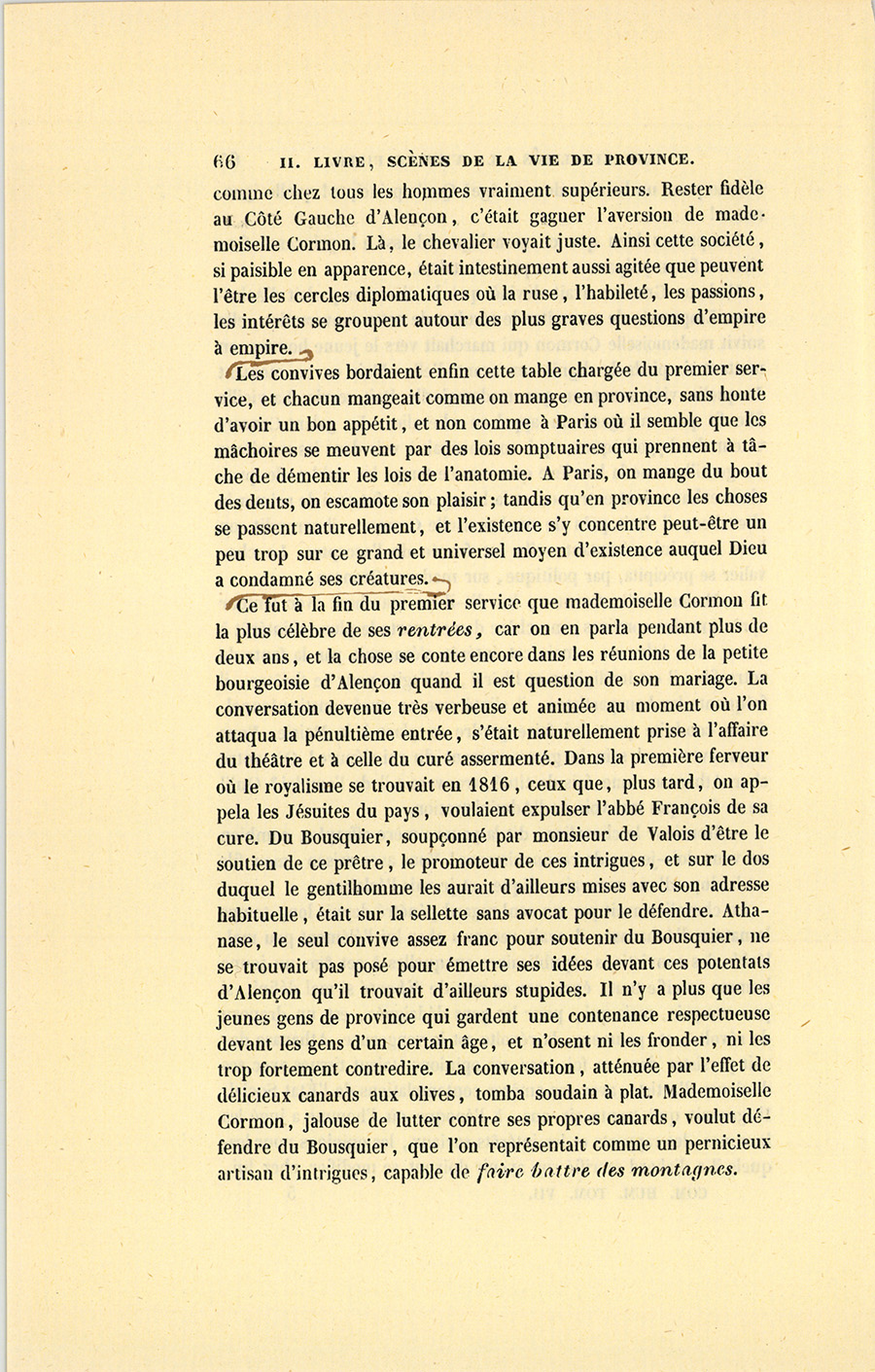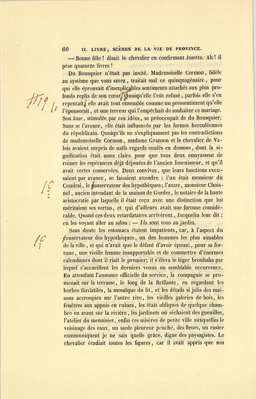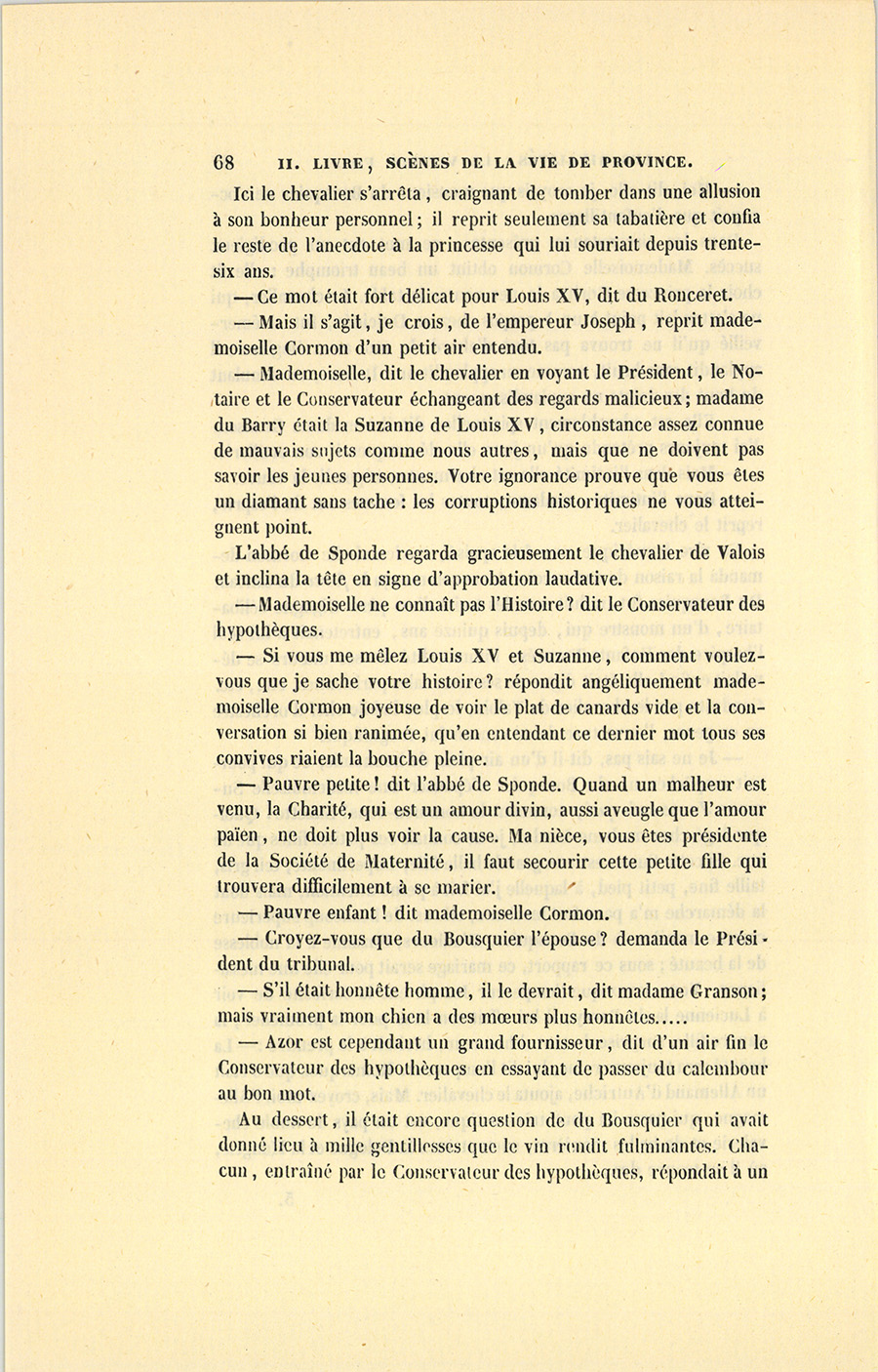 Les touristes de la Bretagne et de la Normandie, du Maine et de l’Anjou, doivent avoir tous vu, dans les capitales de ces provinces, une maison qui ressemblait plus ou moins à l’hôtel des Cormon ; car il est, dans son genre, un archétype des maisons bourgeoises d’une grande partie de la France, et mérite d’autant mieux sa place dans cet ouvrage qu’il explique des mœurs, et représente des idées. Qui ne sent déjà combien la vie était calme et routinière dans ce vieil édifice ? Il y existait une bibliothèque, mais {p. 39} elle se trouvait logée un peu au-dessous du niveau de la Brillante, bien reliée, cerclée, et la poussière, loin de l’endommager, la faisait valoir. Les ouvrages y étaient conservés avec le soin que l’on donne, dans ces provinces privées de vignobles, aux œuvres pleines de naturel, exquises, recommandables par leurs parfums antiques, et produits par les presses de la Bourgogne, de la Touraine, de la Gascogne et du Midi. Le prix des transports est trop considérable pour que l’on fasse venir de mauvais vins.