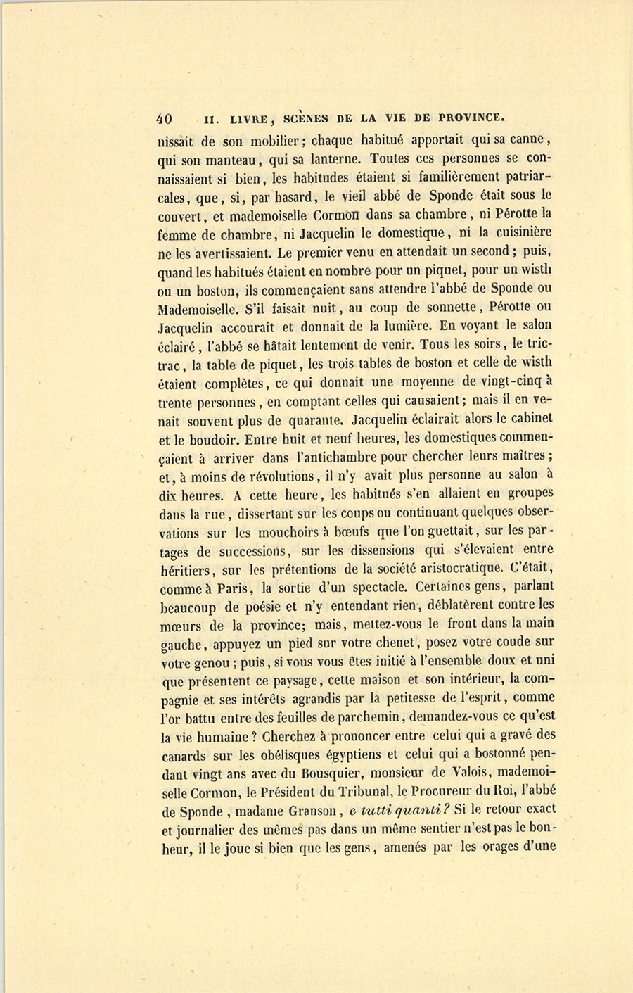 Le fond de la société de mademoiselle Cormon se composait d’environ cent cinquante personnes : quelques-unes allaient à la campagne, ceux-ci étaient malades, ceux-là voyageaient dans le Département pour leurs affaires ; mais il existait certains fidèles qui, sauf les soirées priées, venaient tous les jours, ainsi que les gens forcés par devoir ou par habitude de demeurer à la ville. Tous ces personnages étaient dans l’âge mûr8 ; peu d’entre eux avaient voyagé, presque tous étaient restés dans la province, et certains avaient trempé dans la Chouannerie. On commençait à pouvoir parler sans crainte de cette guerre depuis que les récompenses arrivaient aux héroïques défenseurs de la bonne cause. Monsieur de Valois, l’un des moteurs de la dernière prise d’armes où périt le marquis de Montauran livré par sa maîtresse, où s’illustra le fameux Marche-à-terre qui faisait alors tranquillement le commerce des bestiaux du côté de Mayenne, donnait depuis six mois la clef de quelques bons tours joués à un vieux républicain nommé Hulot, le commandant d’une demi-brigade cantonnée dans Alençon de 1798 à 1800, et qui avait laissé des souvenirs dans le pays (voyez Les Chouans). Les femmes faisaient peu de toilette, excepté le mercredi, jour où mademoiselle Cormon donnait à dîner, et où les invités du dernier mercredi s’acquittaient de leur visite de digestion. Les mercredis faisaient raout : l’assemblée était nombreuse, conviés et visiteurs se mettaient in fiocchi ; quelques femmes apportaient leurs ouvrages, des tricots, des tapisseries à la main ; quelques jeunes personnes travaillaient sans honte à des dessins pour du point d’Alençon, avec le produit desquels elles payaient leur entretien. Certains maris amenaient leurs femmes par politique, car il s’y trouvait peu de jeunes gens ; aucune parole ne s’y disait à l’oreille sans exciter l’attention : il n’y avait donc point de danger ni pour une jeune personne, ni pour une jeune femme d’entendre un propos d’amour. Chaque soir, à six heures, la longue antichambre se {p. 40} garnissait de son mobilier ; chaque habitué apportait qui sa canne, qui son manteau, qui sa lanterne. Toutes ces personnes se connaissaient si bien, les habitudes étaient si familièrement patriarcales, que, si, par hasard, le vieil abbé de Sponde était sous le couvert, et mademoiselle Cormon dans sa chambre, ni Pérotte la femme de chambre, ni Jacquelin le domestique, ni la cuisinière ne les avertissaient. Le premier venu en attendait un second ; puis, quand les habitués étaient en nombre pour un piquet, pour un wisth ou un boston, ils commençaient sans attendre l’abbé de Sponde ou Mademoiselle. S’il faisait nuit, au coup de sonnette, Pérotte ou Jacquelin accourait et donnait de la lumière. En voyant le salon éclairé, l’abbé se hâtait lentement de venir. Tous les soirs, le trictrac, la table de piquet, les trois tables de boston et celle de wisth étaient complètes, ce qui donnait une moyenne de vingt-cinq à trente personnes, en comptant celles qui causaient ; mais il en venait souvent plus de quarante. Jacquelin éclairait alors le cabinet et le boudoir. Entre huit et neuf heures, les domestiques commençaient à arriver dans l’antichambre pour chercher leurs maîtres ; et, à moins de révolutions, il n’y avait plus personne au salon à dix heures. À cette heure, les habitués s’en allaient en groupes dans la rue, dissertant sur les coups ou continuant quelques observations sur les mouchoirs à bœufs que l’on guettait, sur les partages de successions, sur les dissensions qui s’élevaient entre héritiers, sur les prétentions de la société aristocratique. C’était, comme à Paris, la sortie d’un spectacle. Certaines gens, parlant beaucoup de poésie et n’y entendant rien, déblatèrent contre les mœurs de la province ; mais, mettez-vous le front dans la main gauche, appuyez un pied sur votre chenet, posez votre coude sur votre genou ; puis, si vous vous êtes initié à l’ensemble doux et uni que présentent ce paysage, cette maison et son intérieur, la compagnie et ses intérêts agrandis par la petitesse de l’esprit, comme l’or battu entre des feuilles de parchemin, demandez-vous ce qu’est la vie humaine ? Cherchez à prononcer entre celui qui a gravé des canards sur les obélisques égyptiens et celui qui a bostonné pendant vingt ans avec du Bousquier, monsieur de Valois, mademoiselle Cormon, le Président du Tribunal, le Procureur du Roi, l’abbé de Sponde, madame Granson, e tutti quanti ? Si le retour exact et journalier des mêmes pas dans un même sentier n’est pas le bonheur, il le joue si bien que les gens, amenés par les orages d’une {p. 41} vie agitée à réfléchir sur les bienfaits du calme, diront que là était le bonheur. Pour chiffrer l’importance du salon de mademoiselle Cormon, il suffira de dire que, statisticien né de la société, du Bousquier avait calculé que les personnes qui le hantaient possédaient cent trente et une voix au Collége électoral et réunissaient dix-huit cent mille livres de rente en fonds de terre dans la province. La ville d’Alençon n’était cependant pas entièrement représentée par ce salon, la haute compagnie aristocratique avait le sien, puis le salon du Receveur-Général était comme une auberge administrative due par le gouvernement où toute la société dansait, intriguait, papillonnait, aimait et soupait. Ces deux autres salons communiquaient au moyen de quelques personnes mixtes avec la maison Cormon, et vice versâ ; mais le salon Cormon jugeait sévèrement ce qui se passait dans ces deux autres camps : on y critiquait le luxe des dîners, on y ruminait les glaces des bals, on discutait la conduite des femmes, les toilettes, les inventions nouvelles qui s’y produisaient.