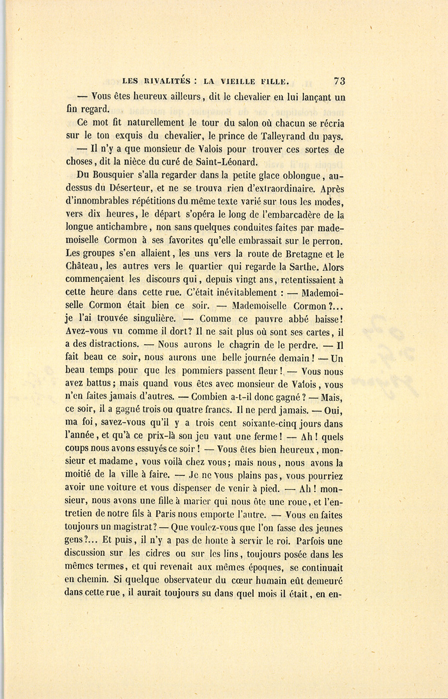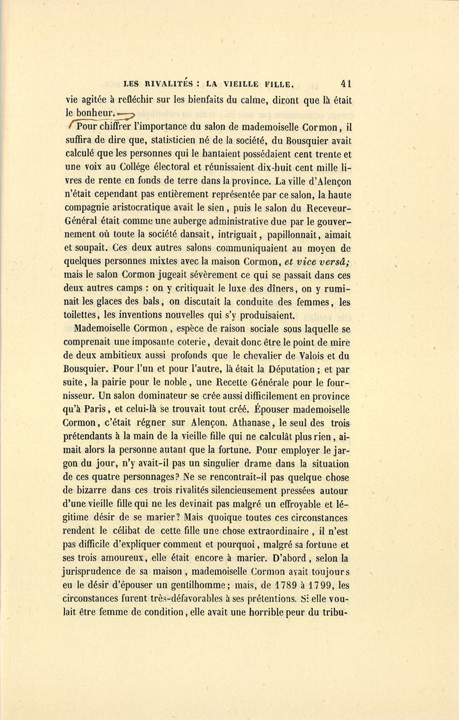 En France, dans presque toutes les Préfectures du second ordre, il existe un salon où se réunissent des personnes considérables et considérées, qui néanmoins ne sont pas encore la crème de la société. Le maître et la maîtresse de la maison comptent bien parmi les sommités de la ville et sont reçus partout où il leur plaît d’aller, il ne se donne pas en ville une fête, un dîner diplomatique, qu’ils n’y soient invités ; mais les gens à châteaux, les pairs qui possèdent de belles terres, la grande compagnie du Département ne vient pas chez eux, et reste à leur égard dans les termes d’une visite faite de part et d’autre, d’un dîner ou d’une soirée acceptés et rendus. Ce salon mixte où se rencontrent la petite noblesse à poste {p. 34} fixe, le clergé, la magistrature, exerce une grande influence. La raison et l’esprit du pays résident dans cette société solide et sans faste où chacun connaît les revenus du voisin, où l’on professe une parfaite indifférence du luxe et de la toilette, jugés comme des enfantillages en comparaison d’un mouchoir à bœufs de dix ou douze arpents dont l’acquisition a été couvée pendant des années, et qui a donné lieu à d’immenses combinaisons diplomatiques. Inébranlable dans ses préjugés bons ou mauvais, ce cénacle suit une même voie sans regarder ni en avant ni en arrière. Il n’admet rien de Paris sans un long examen, se refuse aux cachemires aussi bien qu’aux inscriptions sur le Grand-Livre, se moque des nouveautés, ne lit rien et veut tout ignorer : science, littérature, inventions industrielles. Il obtient le changement d’un préfet qui ne convient pas, et si l’administrateur résiste, il l’isole à la manière des abeilles qui couvrent de cire un colimaçon venu dans leur ruche. Enfin, là, les bavardages deviennent souvent de solennels arrêts. Aussi, quoiqu’il ne s’y fasse que des parties de jeu, les jeunes femmes y apparaissent-elles de loin en loin ; elles y viennent chercher une approbation de leur conduite, une consécration de leur importance. Cette suprématie accordée à une maison froisse souvent l’amour-propre de quelques naturels du pays qui se consolent en supputant la dépense qu’elle impose, et dont ils profitent. S’il ne se rencontre pas de fortune assez considérable pour tenir maison ouverte, les gros bonnets choisissent pour lieu de réunion, comme faisaient les gens d’Alençon, la maison d’une personne inoffensive de qui la vie arrêtée, dont le caractère ou la position laisse la société maîtresse chez elle, en ne portant ombrage ni aux vanités, ni aux intérêts de chacun. Ainsi, la haute société d’Alençon se réunissait depuis long-temps chez la vieille fille dont la fortune était à son insu couchée en joue par madame Granson, son arrière-petite-cousine, et par les deux vieux garçons dont les secrètes espérances viennent d’être dévoilées. Cette demoiselle vivait avec son oncle maternel, un ancien Grand-Vicaire de l’Évêché de Séez, autrefois son tuteur, et de qui elle devait hériter. La famille, que représentait alors Rose-Marie-Victoire Cormon, comptait autrefois parmi les plus considérables de la province. Quoique roturière, elle frayait avec la noblesse à laquelle elle s’était souvent alliée, elle avait fourni jadis des intendants aux ducs d’Alençon, force magistrats à la Robe et plusieurs évêques au Clergé. Monsieur de Sponde, le grand-père {p. 35} maternel de mademoiselle Cormon, fut élu par la Noblesse aux États-Généraux, et monsieur Cormon, son père, par le Tiers-État ; mais aucun n’accepta cette mission. Depuis environ cent ans, les filles s’étaient mariées à des nobles de la province, en sorte que cette famille avait si bien tallé dans le Duché, qu’elle y embrassait tous les arbres généalogiques. Nulle bourgeoisie ne ressemblait davantage à la noblesse.