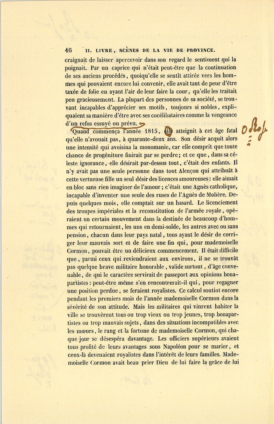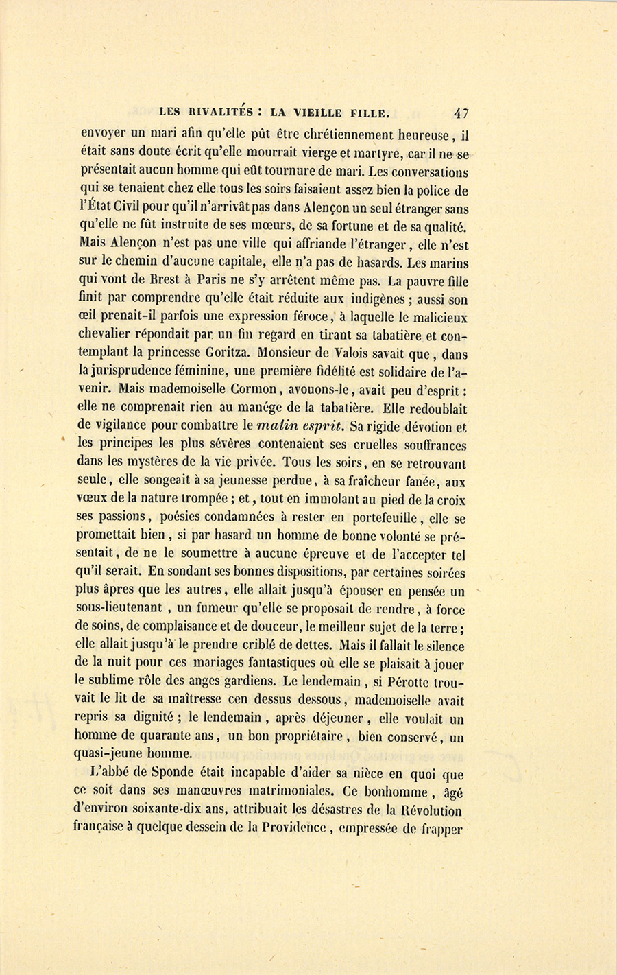 Le chevalier chassait alors les grains de tabac qui se fourraient dans les plis du pout-de-soie ou sur son gilet. Pour tout le monde, ce geste eût été fort naturel ; mais il donnait toujours des inquiétudes à la pauvre fille. La violence de cette passion sans objet était si grande que Rose n’osait plus regarder un homme en face, tant elle {p. 46} craignait de laisser apercevoir dans son regard le sentiment qui la poignait. Par un caprice qui n’était peut-être que la continuation de ses anciens procédés, quoiqu’elle se sentît attirée vers les hommes qui pouvaient encore lui convenir, elle avait tant de peur d’être taxée de folie en ayant l’air de leur faire la cour, qu’elle les traitait peu gracieusement. La plupart des personnes de sa société, se trouvant incapables d’apprécier ses motifs, toujours si nobles, expliquaient sa manière d’être avec ses cocélibataires comme la vengeance d’un refus essuyé ou prévu. Quand commença l’année 1815, Rose atteignit à cet âge fatal qu’elle n’avouait pas, à quarante-deux ans. Son désir acquit alors une intensité qui avoisina la monomanie, car elle comprit que toute chance de progéniture finirait par se perdre, et ce que, dans sa céleste ignorance, elle désirait par-dessus tout, c’était des enfants. Il n’y avait pas une seule personne dans tout Alençon qui attribuât à cette vertueuse fille un seul désir des licences amoureuses : elle aimait en bloc sans rien imaginer de l’amour ; c’était une Agnès catholique, incapable d’inventer une seule des ruses de l’Agnès de Molière. Depuis quelques mois, elle comptait sur un hasard. Le licenciement des troupes impériales et la reconstitution de l’armée royale, opéraient un certain mouvement dans la destinée de beaucoup d’hommes qui retournaient, les uns en demi-solde, les autres avec ou sans pension, chacun dans leur pays natal, tous ayant le désir de corriger leur mauvais sort et de faire une fin qui, pour mademoiselle Cormon, pouvait être un délicieux commencement. Il était difficile que, parmi ceux qui reviendraient aux environs, il ne se trouvât pas quelque brave militaire honorable, valide surtout, d’âge convenable, de qui le caractère servirait de passeport aux opinions bonapartistes : peut-être même s’en rencontrerait-il qui, pour regagner une position perdue, se feraient royalistes. Ce calcul soutint encore pendant les premiers mois de l’année mademoiselle Cormon dans la sévérité de son attitude. Mais les militaires qui vinrent habiter la ville se trouvèrent tous ou trop vieux ou trop jeunes, trop bonapartistes ou trop mauvais sujets, dans des situations incompatibles avec les mœurs, le rang et la fortune de mademoiselle Cormon, qui chaque jour se désespéra davantage. Les officiers supérieurs avaient tous profité de leurs avantages sous Napoléon pour se marier, et ceux-là devenaient royalistes dans l’intérêt de leurs familles. Mademoiselle Cormon avait beau prier Dieu de lui faire la grâce de lui {p. 47} envoyer un mari afin qu’elle pût être chrétiennement heureuse, il était sans doute écrit qu’elle mourrait vierge et martyre, car il ne se présentait aucun homme qui eût tournure de mari. Les conversations qui se tenaient chez elle tous les soirs faisaient assez bien la police de l’État Civil pour qu’il n’arrivât pas dans Alençon un seul étranger sans qu’elle ne fût instruite de ses mœurs, de sa fortune et de sa qualité. Mais Alençon n’est pas une ville qui affriande l’étranger, elle n’est sur le chemin d’aucune capitale, elle n’a pas de hasards. Les marins qui vont de Brest à Paris ne s’y arrêtent même pas. La pauvre fille finit par comprendre qu’elle était réduite aux indigènes ; aussi son œil prenait-il parfois une expression féroce, à laquelle le malicieux chevalier répondait par un fin regard en tirant sa tabatière et contemplant la princesse Goritza. Monsieur de Valois savait que, dans la jurisprudence féminine, une première fidélité est solidaire de l’avenir. Mais mademoiselle Cormon, avouons-le, avait peu d’esprit : elle ne comprenait rien au manége de la tabatière. Elle redoublait de vigilance pour combattre le malin esprit. Sa rigide dévotion et les principes les plus sévères contenaient ses cruelles souffrances dans les mystères de la vie privée. Tous les soirs, en se retrouvant seule, elle songeait à sa jeunesse perdue, à sa fraîcheur fanée, aux vœux de la nature trompée ; et, tout en immolant au pied de la croix ses passions, poésies condamnées à rester en portefeuille, elle se promettait bien, si par hasard un homme de bonne volonté se présentait, de ne le soumettre à aucune épreuve et de l’accepter tel qu’il serait. En sondant ses bonnes dispositions, par certaines soirées plus âpres que les autres, elle allait jusqu’à épouser en pensée un sous-lieutenant, un fumeur qu’elle se proposait de rendre, à force de soins, de complaisance et de douceur, le meilleur sujet de la terre ; elle allait jusqu’à le prendre criblé de dettes. Mais il fallait le silence de la nuit pour ces mariages fantastiques où elle se plaisait à jouer le sublime rôle des anges gardiens. Le lendemain, si Pérotte trouvait le lit de sa maîtresse cen dessus dessous, mademoiselle avait repris sa dignité ; le lendemain, après déjeuner, elle voulait un homme de quarante ans, un bon propriétaire, bien conservé, un quasi-jeune homme.