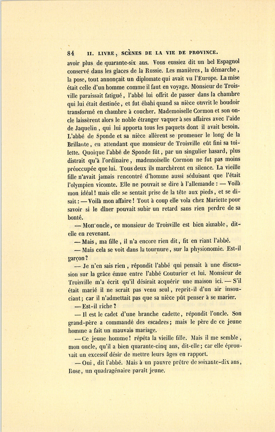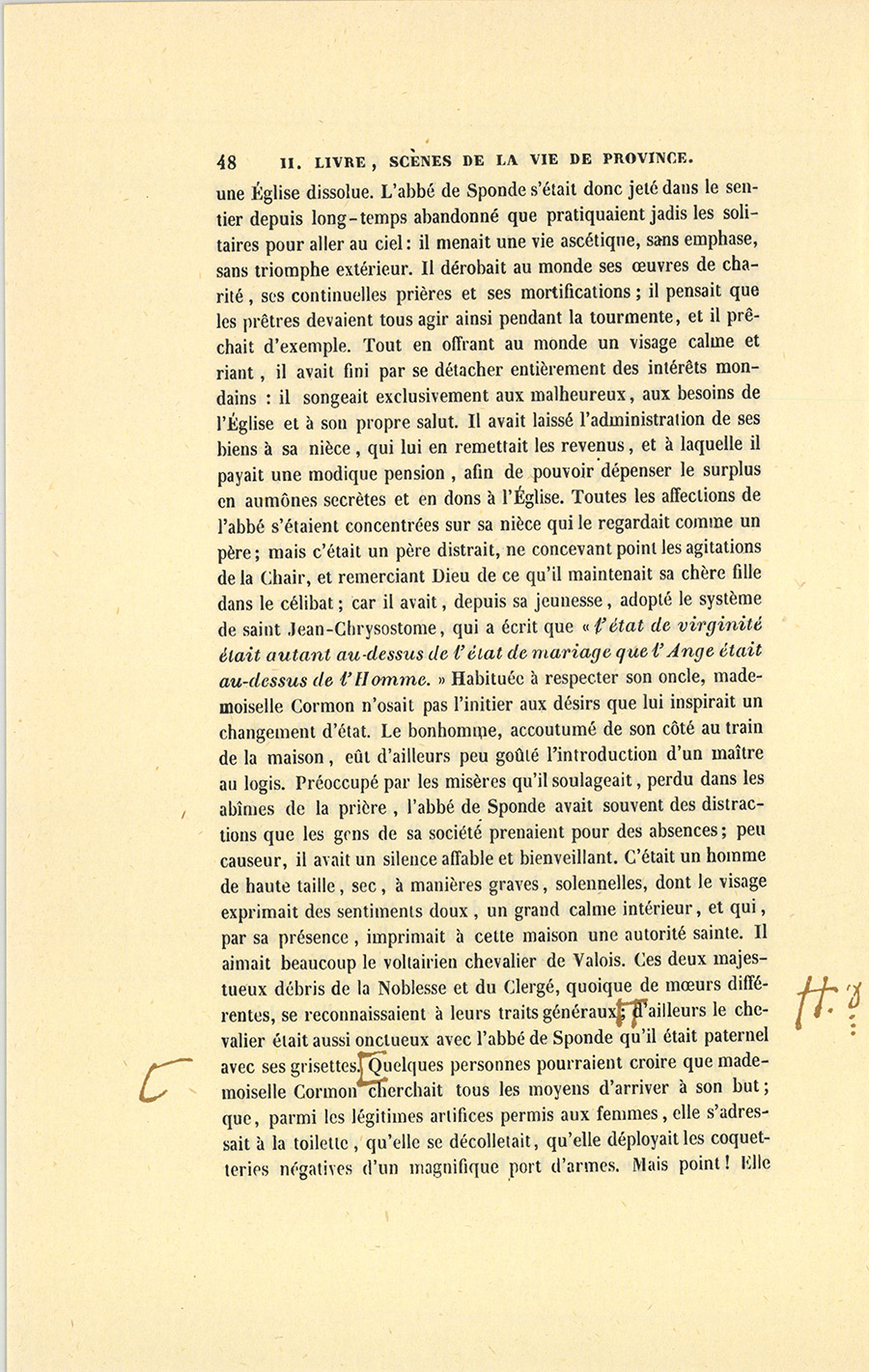 L’abbé de Sponde était incapable d’aider sa nièce en quoi que ce soit dans ses manœuvres matrimoniales. Ce bonhomme, âgé d’environ soixante-dix ans, attribuait les désastres de la Révolution française à quelque dessein de la Providence, empressée de frapper {p. 48} une Église dissolue. L’abbé de Sponde s’était donc jeté dans le sentier depuis long-temps abandonné que pratiquaient jadis les solitaires pour aller au ciel : il menait une vie ascétique, sans emphase, sans triomphe extérieur. Il dérobait au monde ses œuvres de charité, ses continuelles prières et ses mortifications ; il pensait que les prêtres devaient tous agir ainsi pendant la tourmente, et il prêchait d’exemple. Tout en offrant au monde un visage calme et riant, il avait fini par se détacher entièrement des intérêts mondains : il songeait exclusivement aux malheureux, aux besoins de l’Église et à son propre salut. Il avait laissé l’administration de ses biens à sa nièce, qui lui en remettait les revenus, et à laquelle il payait une modique pension, afin de pouvoir dépenser le surplus en aumônes secrètes et en dons à l’Église. Toutes les affections de l’abbé s’étaient concentrées sur sa nièce qui le regardait comme un père ; mais c’était un père distrait, ne concevant point les agitations de la Chair, et remerciant Dieu de ce qu’il maintenait sa chère fille dans le célibat ; car il avait, depuis sa jeunesse, adopté le système de saint Jean-Chrysostome, qui a écrit que « l’état de virginité était autant au-dessus de l’état de mariage que l’Ange était au-dessus de l’Homme. » Habituée à respecter son oncle, mademoiselle Cormon n’osait pas l’initier aux désirs que lui inspirait un changement d’état. Le bonhomme, accoutumé de son côté au train de la maison, eût d’ailleurs peu goûté l’introduction d’un maître au logis. Préoccupé par les misères qu’il soulageait, perdu dans les abîmes de la prière, l’abbé de Sponde avait souvent des distractions que les gens de sa société prenaient pour des absences ; peu causeur, il avait un silence affable et bienveillant. C’était un homme de haute taille, sec, à manières graves, solennelles, dont le visage exprimait des sentiments doux, un grand calme intérieur, et qui, par sa présence, imprimait à cette maison une autorité sainte. Il aimait beaucoup le voltairien chevalier de Valois. Ces deux majestueux débris de la Noblesse et du Clergé, quoique de mœurs différentes, se reconnaissaient à leurs traits généraux. D’ailleurs le chevalier était aussi onctueux avec l’abbé de Sponde qu’il était paternel avec ses grisettes.