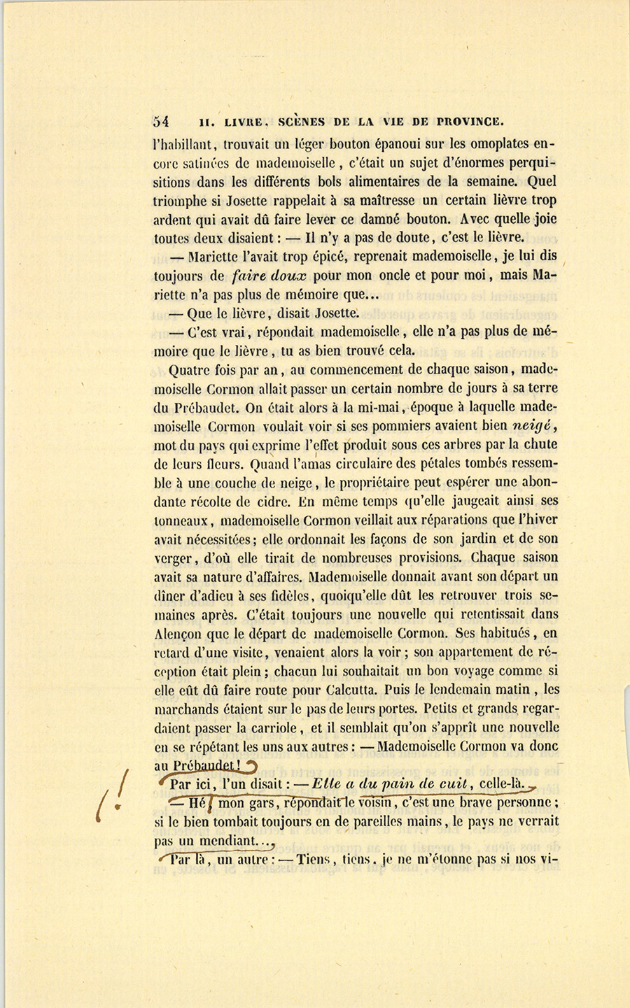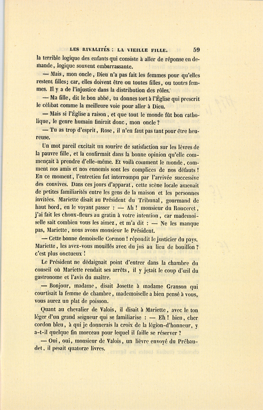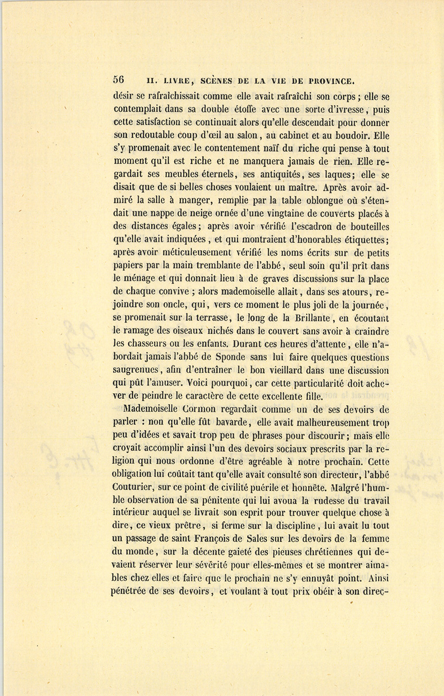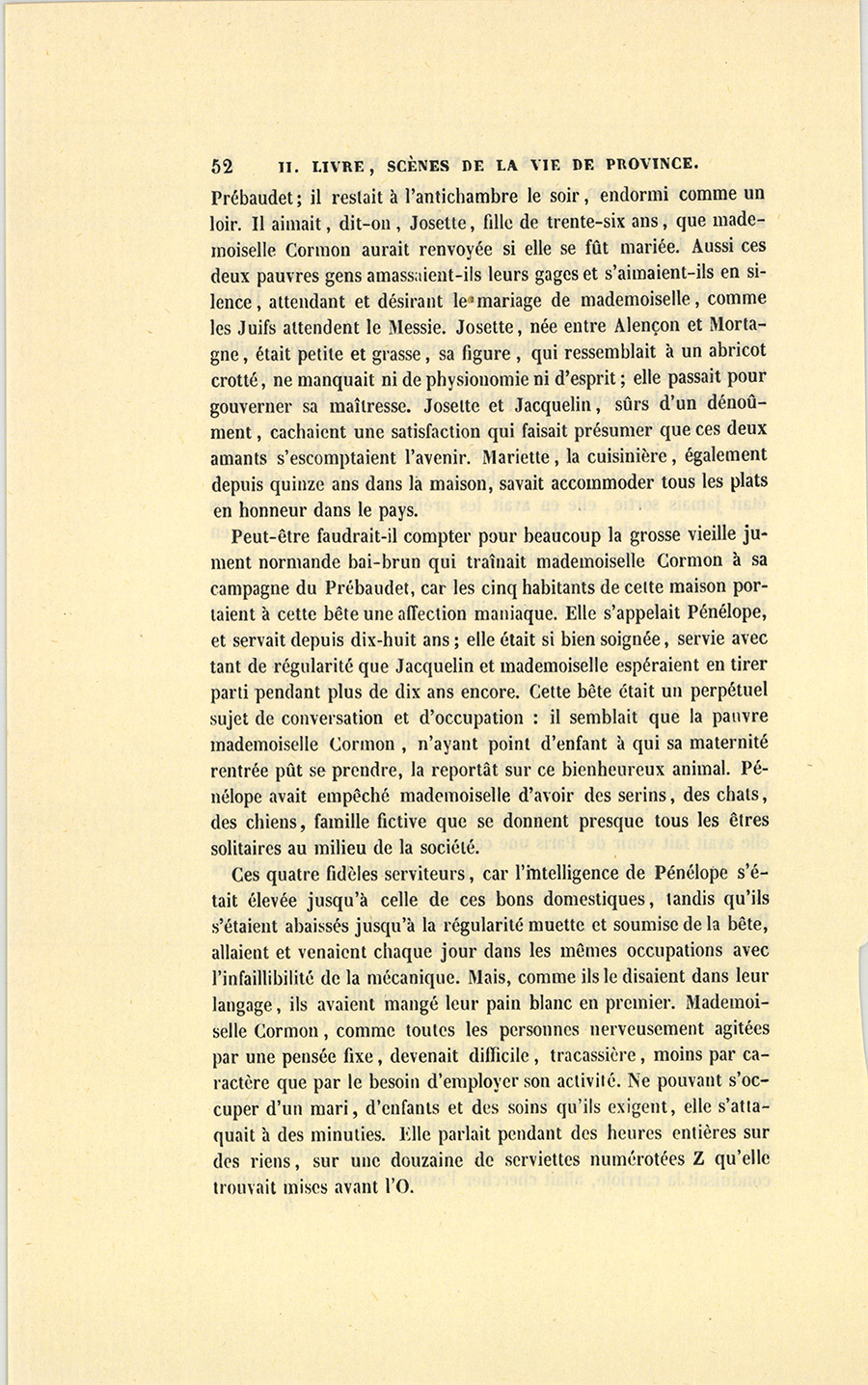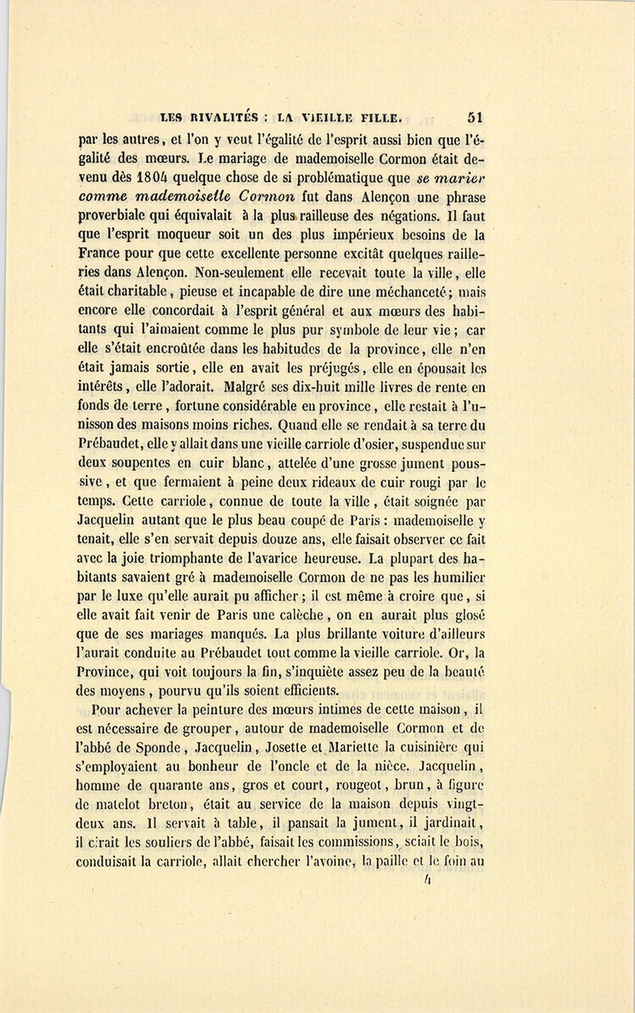 Pour achever la peinture des mœurs intimes de cette maison, il est nécessaire de grouper, autour de mademoiselle Cormon et de l’abbé de Sponde, Jacquelin, Josette et Mariette la cuisinière qui s’employaient au bonheur de l’oncle et de la nièce. Jacquelin, homme de quarante ans, gros et court, rougeot, brun, à figure de matelot breton, était au service de la maison depuis vingt-deux ans. Il servait à table, il pansait la jument, il jardinait, il cirait les souliers de l’abbé, faisait les commissions, sciait le bois, conduisait la carriole, allait chercher l’avoine, la paille et le foin au {p. 52} Prébaudet ; il restait à l’antichambre le soir, endormi comme un loir. Il aimait, dit-on, Josette, fille de trente-six ans, que mademoiselle Cormon aurait renvoyée si elle se fût mariée. Aussi ces deux pauvres gens amassaient-ils leurs gages et s’aimaient-ils en silence, attendant et désirant le mariage de mademoiselle, comme les Juifs attendent le Messie. Josette, née entre Alençon et Mortagne, était petite et grasse, sa figure, qui ressemblait à un abricot crotté, ne manquait ni de physionomie ni d’esprit ; elle passait pour gouverner sa maîtresse. Josette et Jacquelin, sûrs d’un dénoûment, cachaient une satisfaction qui faisait présumer que ces deux amants s’escomptaient l’avenir. Mariette, la cuisinière, également depuis quinze ans dans la maison, savait accommoder tous les plats en honneur dans le pays.