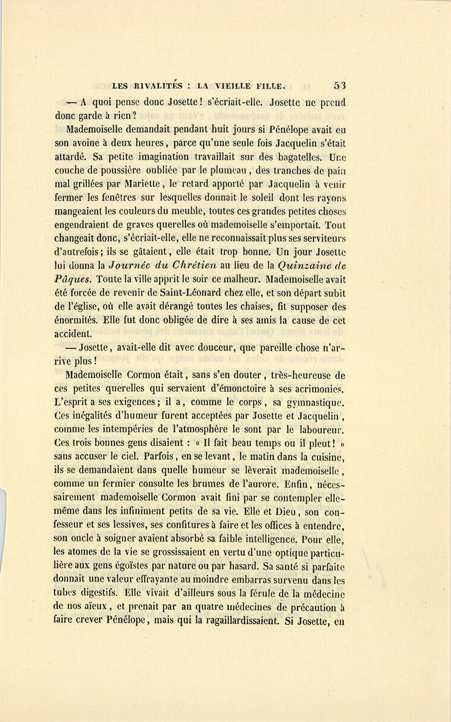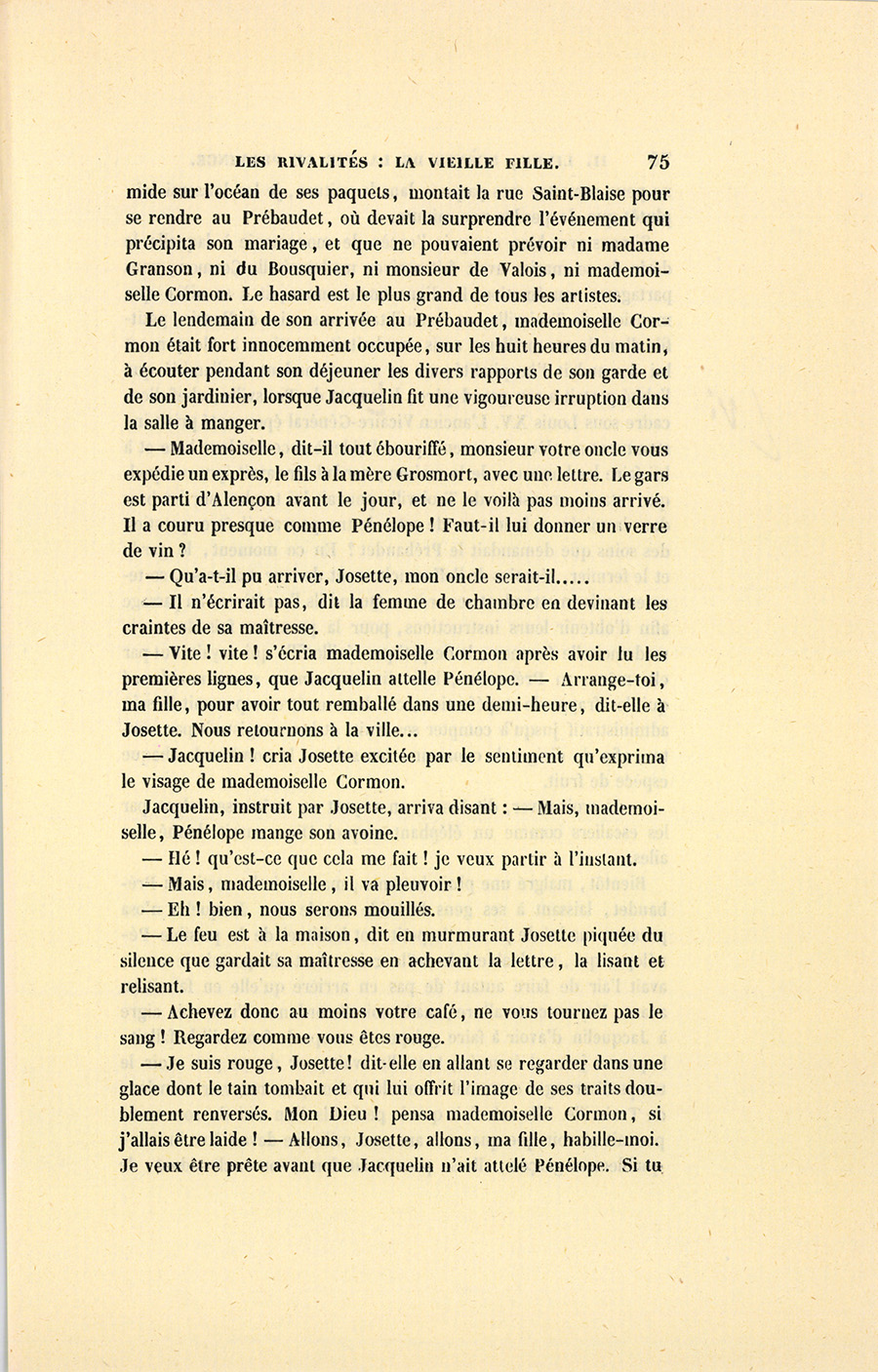 Peut-être faudrait-il compter pour beaucoup la grosse vieille jument normande bai-brun qui traînait mademoiselle Cormon à sa campagne du Prébaudet, car les cinq habitants de cette maison portaient à cette bête une affection maniaque. Elle s’appelait Pénélope, et servait depuis dix-huit ans ; elle était si bien soignée, servie avec tant de régularité que Jacquelin et mademoiselle espéraient en tirer parti pendant plus de dix ans encore. Cette bête était un perpétuel sujet de conversation et d’occupation : il semblait que la pauvre mademoiselle Cormon, n’ayant point d’enfant à qui sa maternité rentrée pût se prendre, la reportât sur ce bienheureux animal. Pénélope avait empêché mademoiselle d’avoir des serins, des chats, des chiens, famille fictive que se donnent presque tous les êtres solitaires au milieu de la société.