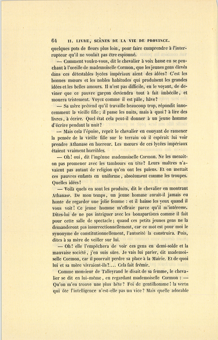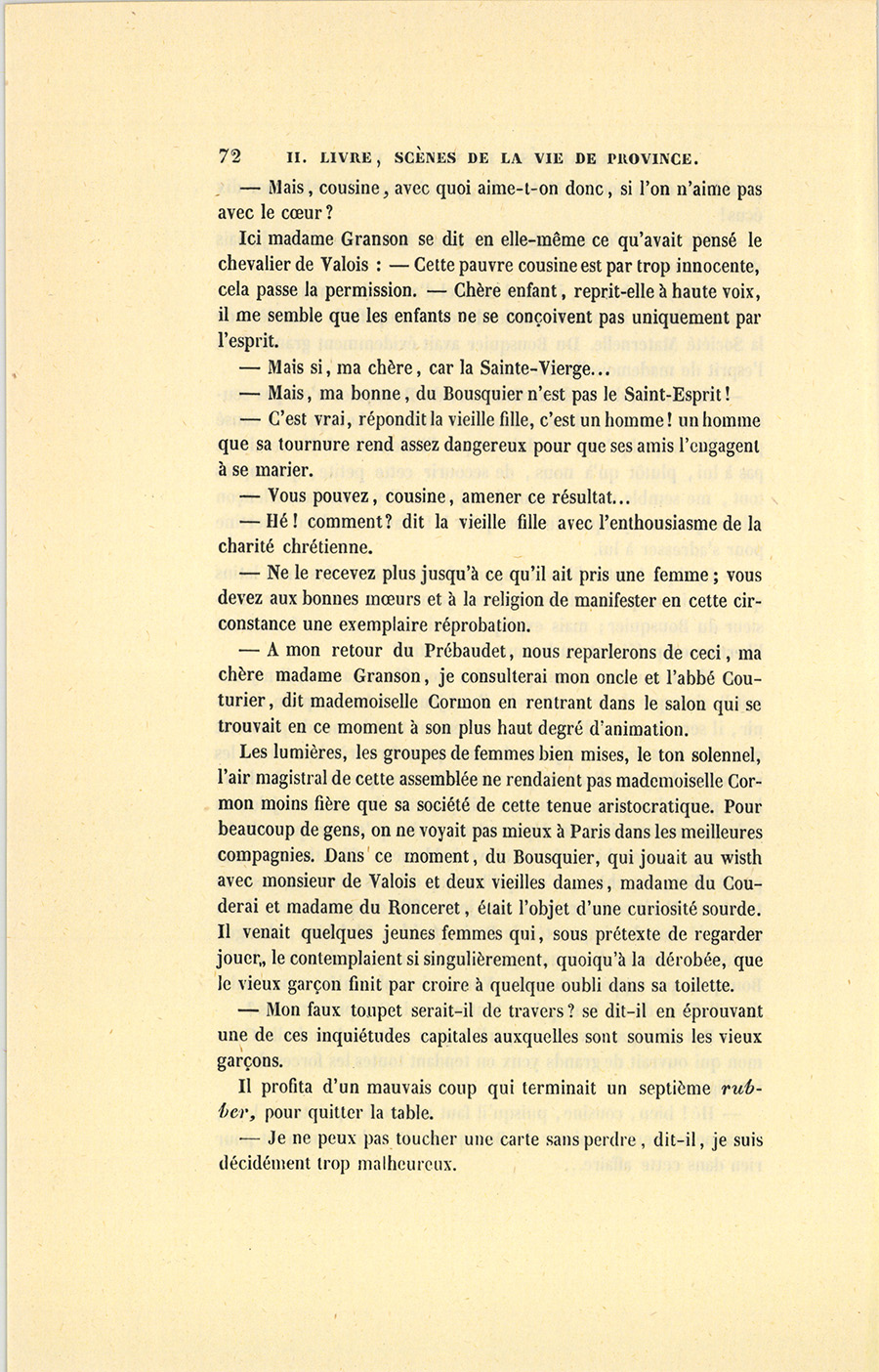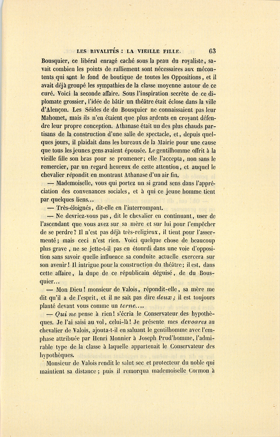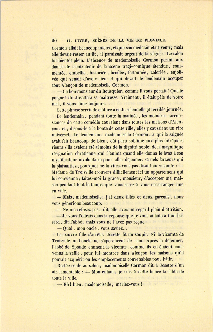 Du Bousquier sourit, et alla, comme futur maître du logis, prendre la table de piquet. Le chevalier de Valois, soit qu’il eût {p. 95} perdu la tête, soit qu’il voulût rester là pour étudier les causes de son désastre, et y remédier, se laissa faire comme un mouton qu’on mène à la boucherie. Il avait reçu le plus violent coup de massue qui puisse atteindre un homme, et un gentilhomme pouvait être étourdi à moins. Bientôt le digne abbé de Sponde et le vicomte de Troisville rentrèrent. Aussitôt mademoiselle Cormon se leva, courut dans l’antichambre, prit son oncle à part et lui dit sa résolution à l’oreille. En apprenant que la maison de la rue du Cygne convenait à monsieur de Troisville, elle pria son futur de lui rendre le service de dire que son oncle la savait à vendre. Elle n’osa pas confier ce mensonge à l’abbé, de peur d’une distraction. Le mensonge prospéra mieux que si c’eût été une action vertueuse. Dans la soirée, tout Alençon apprit la grande nouvelle. Depuis quatre jours, la ville était occupée comme aux jours néfastes de 1814 et de 1815. Les uns riaient, les autres admettaient le mariage, ceux-ci le blâmaient, ceux-là l’approuvaient. La classe moyenne d’Alençon en fut heureuse, elle y vit une conquête. Le lendemain, chez ses amis, le chevalier de Valois dit un mot cruel.