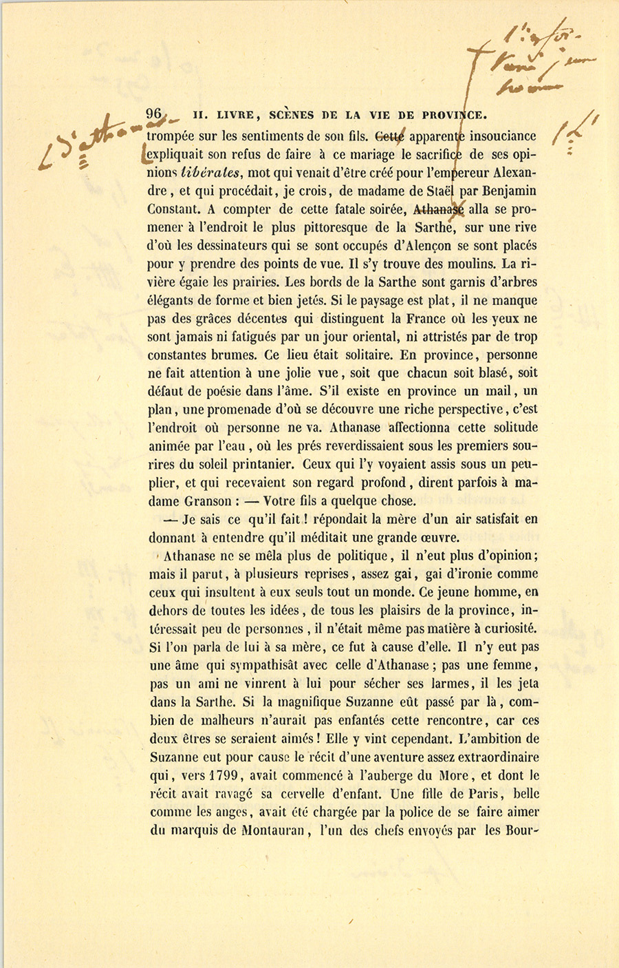 Athanase ne se mêla plus de politique, il n’eut plus d’opinion ; mais il parut, à plusieurs reprises, assez gai, gai d’ironie comme ceux qui insultent à eux seuls tout un monde. Ce jeune homme, en dehors de toutes les idées, de tous les plaisirs de la province, intéressait peu de personnes, il n’était même pas matière à curiosité. Si l’on parla de lui à sa mère, ce fut à cause d’elle. Il n’y eut pas une âme qui sympathisât avec celle d’Athanase ; pas une femme, pas un ami ne vinrent à lui pour sécher ses larmes, il les jeta dans la Sarthe. Si la magnifique Suzanne eût passé par là, combien de malheurs n’aurait pas enfantés cette rencontre, car ces deux êtres se seraient aimés ! Elle y vint cependant. L’ambition de Suzanne eut pour cause le récit d’une aventure assez extraordinaire qui, vers 1799, avait commencé à l’auberge du More, et dont le récit avait ravagé sa cervelle d’enfant. Une fille de Paris, belle comme les anges, avait été chargée par la police de se faire aimer du marquis de Montauran, l’un des chefs envoyés par les {p. 97} Bourbons pour commander les Chouans ; elle l’avait rencontré précisément à l’auberge du More au retour de son expédition de Mortagne : elle l’avait séduit et l’avait livré. Cette fantastique personne, ce pouvoir de la beauté sur l’homme, tout dans l’affaire de Marie de Verneuil et du marquis de Montauran, éblouit Suzanne ; elle éprouva dès l’âge de raison un désir de se jouer des hommes. Quelques mois après sa fuite, elle ne se refusa donc pas à traverser sa ville natale pour aller en Bretagne avec un artiste. Elle voulut voir Fougères où s’était dénouée l’aventure du marquis de Montauran, et parcourir le théâtre de cette guerre pittoresque dont les tragédies, encore peu connues, avaient bercé son jeune âge. Puis elle désirait traverser Alençon dans un si brillant entourage et si bien métamorphosée que personne ne la reconnût. Elle comptait en un seul moment mettre sa mère à l’abri du malheur, et délicatement envoyer au pauvre Athanase la somme qui, dans notre époque, est pour le génie ce qu’était, au Moyen-âge, le cheval de combat et l’armure que Rebecca procure à Ivanhoé.