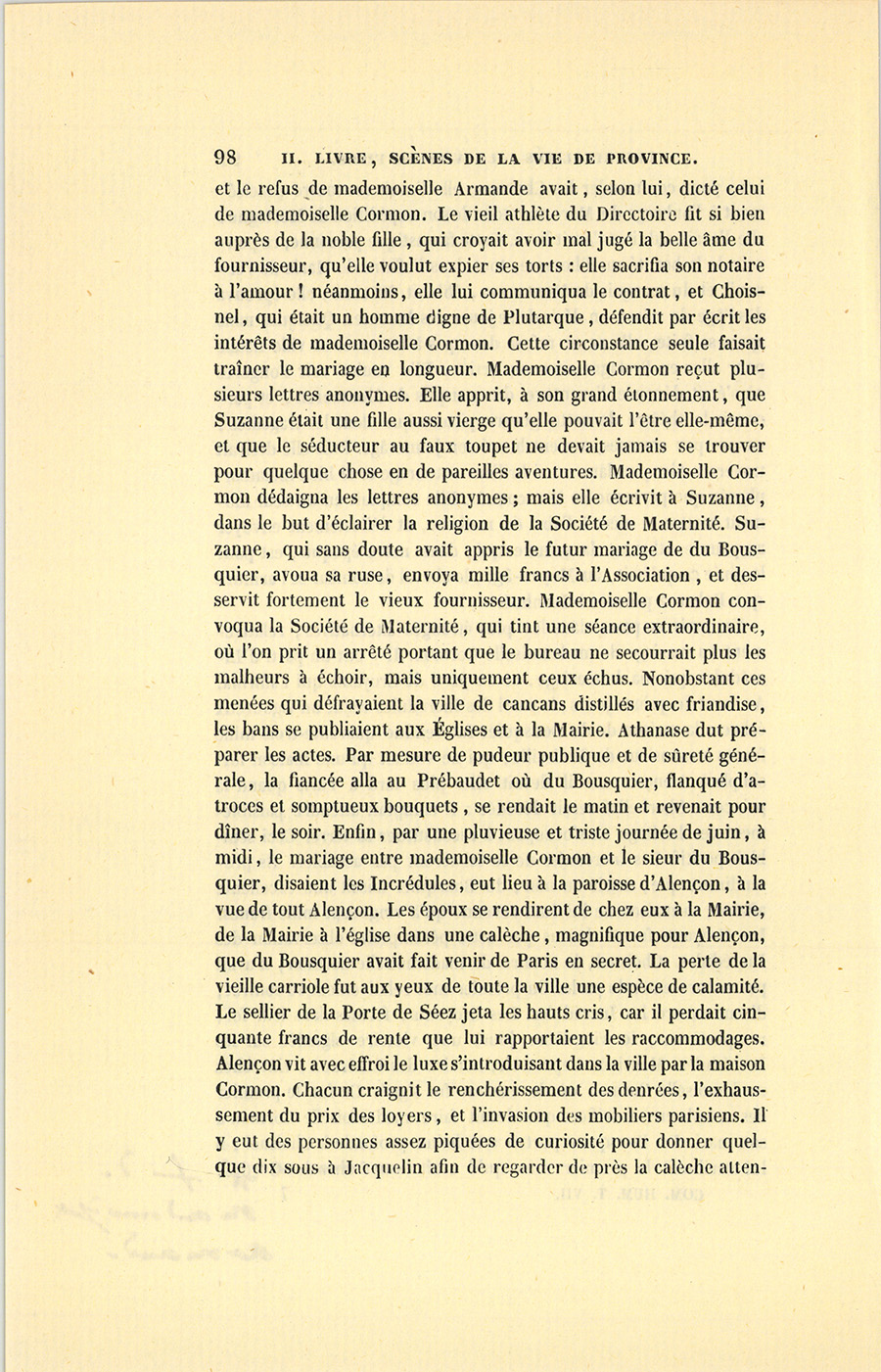 Un mois se passa dans les plus étranges alternatives, relativement au mariage de mademoiselle Cormon. Il y eut un parti d’Incrédules qui nia le mariage, et un parti de Croyants qui l’affirma. Au bout de quinze jours, le parti des Incrédules reçut un vigoureux échec : la maison de du Bousquier fut vendue quarante-trois mille francs à monsieur de Troisville, qui ne voulait qu’une maison fort simple à Alençon ; car il devait aller plus tard à Paris quand la princesse Sherbellof serait décédée : il comptait attendre paisiblement cet héritage en s’occupant à reconstituer sa terre. Ceci semblait positif. Les Incrédules ne se laissèrent pas accabler. Ils prétendirent que, marié ou non, du Bousquier faisait une excellente affaire ; sa maison ne lui était revenue qu’à vingt-sept mille francs. Les Croyants furent battus par cette péremptoire observation des Incrédules. Choisnel, le notaire de mademoiselle Cormon, n’avait pas encore entendu parler du premier mot relativement au contrat, dirent encore les Incrédules. Les Croyants, fermes dans leur foi, remportèrent, le vingtième jour, une victoire signalée sur les Incrédules. Monsieur Lepressoir, notaire des Libéraux, vint chez mademoiselle Cormon où le contrat fut signé. Ce fut le premier des nombreux sacrifices que devait faire mademoiselle Cormon à son mari. Du Bousquier portait une haine profonde à Choisnel ; il lui attribuait le premier refus qu’il avait essuyé de mademoiselle Armande, {p. 98} et le refus de mademoiselle Armande avait, selon lui, dicté celui de mademoiselle Cormon. Le vieil athlète du Directoire fit si bien auprès de la noble fille, qui croyait avoir mal jugé la belle âme du fournisseur, qu’elle voulut expier ses torts : elle sacrifia son notaire à l’amour ! néanmoins, elle lui communiqua le contrat, et Choisnel, qui était un homme digne de Plutarque, défendit par écrit les intérêts de mademoiselle Cormon. Cette circonstance seule faisait traîner le mariage en longueur. Mademoiselle Cormon reçut plusieurs lettres anonymes. Elle apprit, à son grand étonnement, que Suzanne était une fille aussi vierge qu’elle pouvait l’être elle-même, et que le séducteur au faux toupet ne devait jamais se trouver pour quelque chose en de pareilles aventures. Mademoiselle Cormon dédaigna les lettres anonymes ; mais elle écrivit à Suzanne, dans le but d’éclairer la religion de la Société de Maternité. Suzanne, qui sans doute avait appris le futur mariage de du Bousquier, avoua sa ruse, envoya mille francs à l’Association, et desservit fortement le vieux fournisseur. Mademoiselle Cormon convoqua la Société de Maternité, qui tint une séance extraordinaire, où l’on prit un arrêté portant que le bureau ne secourrait plus les malheurs à échoir, mais uniquement ceux échus. Nonobstant ces menées qui défrayaient la ville de cancans distillés avec friandise, les bans se publiaient aux Églises et à la Mairie. Athanase dut préparer les actes. Par mesure de pudeur publique et de sûreté générale, la fiancée alla au Prébaudet où du Bousquier, flanqué d’atroces et somptueux bouquets, se rendait le matin et revenait pour dîner, le soir. Enfin, par une pluvieuse et triste journée de juin, à midi, le mariage entre mademoiselle Cormon et le sieur du Bousquier, disaient les Incrédules, eut lieu à la paroisse d’Alençon, à la vue de tout Alençon. Les époux se rendirent de chez eux à la Mairie, de la Mairie à l’église dans une calèche, magnifique pour Alençon, que du Bousquier avait fait venir de Paris en secret. La perte de la vieille carriole fut aux yeux de toute la ville une espèce de calamité. Le sellier de la Porte de Séez jeta les hauts cris, car il perdait cinquante francs de rente que lui rapportaient les raccommodages. Alençon vit avec effroi le luxe s’introduisant dans la ville par la maison Cormon. Chacun craignit le renchérissement des denrées, l’exhaussement du prix des loyers, et l’invasion des mobiliers parisiens. Il y eut des personnes assez piquées de curiosité pour donner quelque dix sous à Jacquelin afin de regarder de près la calèche {p. 99} attentatoire à l’économie du pays. Les deux chevaux achetés en Normandie effrayèrent aussi beaucoup.