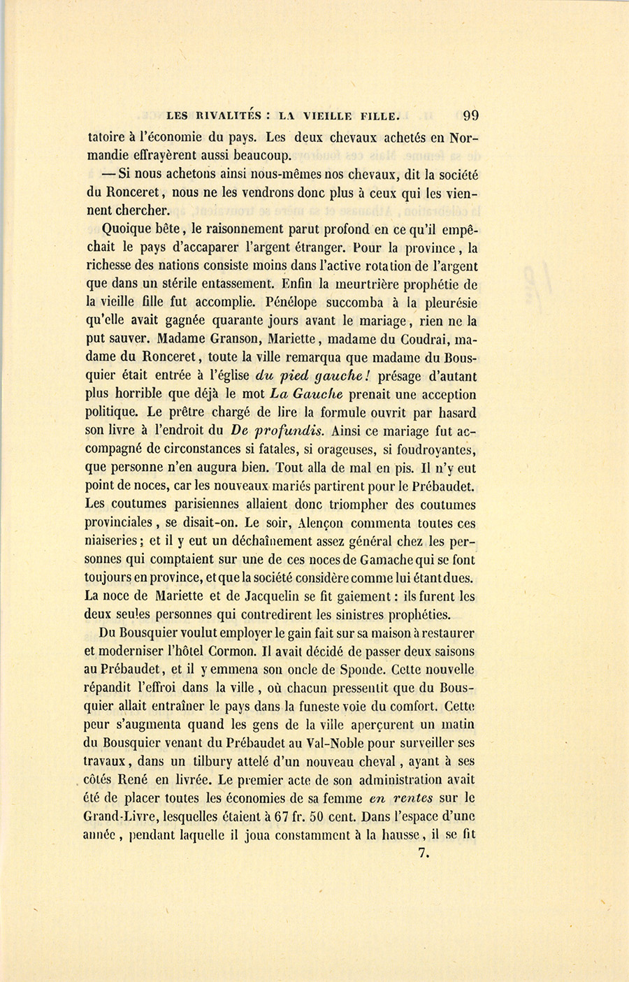 Quoique bête, le raisonnement parut profond en ce qu’il empêchait le pays d’accaparer l’argent étranger. Pour la province, la richesse des nations consiste moins dans l’active rotation de l’argent que dans un stérile entassement. Enfin la meurtrière prophétie de la vieille fille fut accomplie. Pénélope succomba à la pleurésie qu’elle avait gagnée quarante jours avant le mariage, rien ne la put sauver. Madame Granson, Mariette, madame du Coudrai, madame du Ronceret, toute la ville remarqua que madame du Bousquier était entrée à l’église du pied gauche ! présage d’autant plus horrible que déjà le mot La Gauche prenait une acception politique. Le prêtre chargé de lire la formule ouvrit par hasard son livre à l’endroit du De profundis. Ainsi ce mariage fut accompagné de circonstances si fatales, si orageuses, si foudroyantes, que personne n’en augura bien. Tout alla de mal en pis. Il n’y eut point de noces, car les nouveaux mariés partirent pour le Prébaudet. Les coutumes parisiennes allaient donc triompher des coutumes provinciales, se disait-on. Le soir, Alençon commenta toutes ces niaiseries ; et il y eut un déchaînement assez général chez les personnes qui comptaient sur une de ces noces de Gamache qui se font toujours en province, et que la société considère comme lui étant dues. La noce de Mariette et de Jacquelin se fit gaiement : ils furent les deux seules personnes qui contredirent les sinistres prophéties.