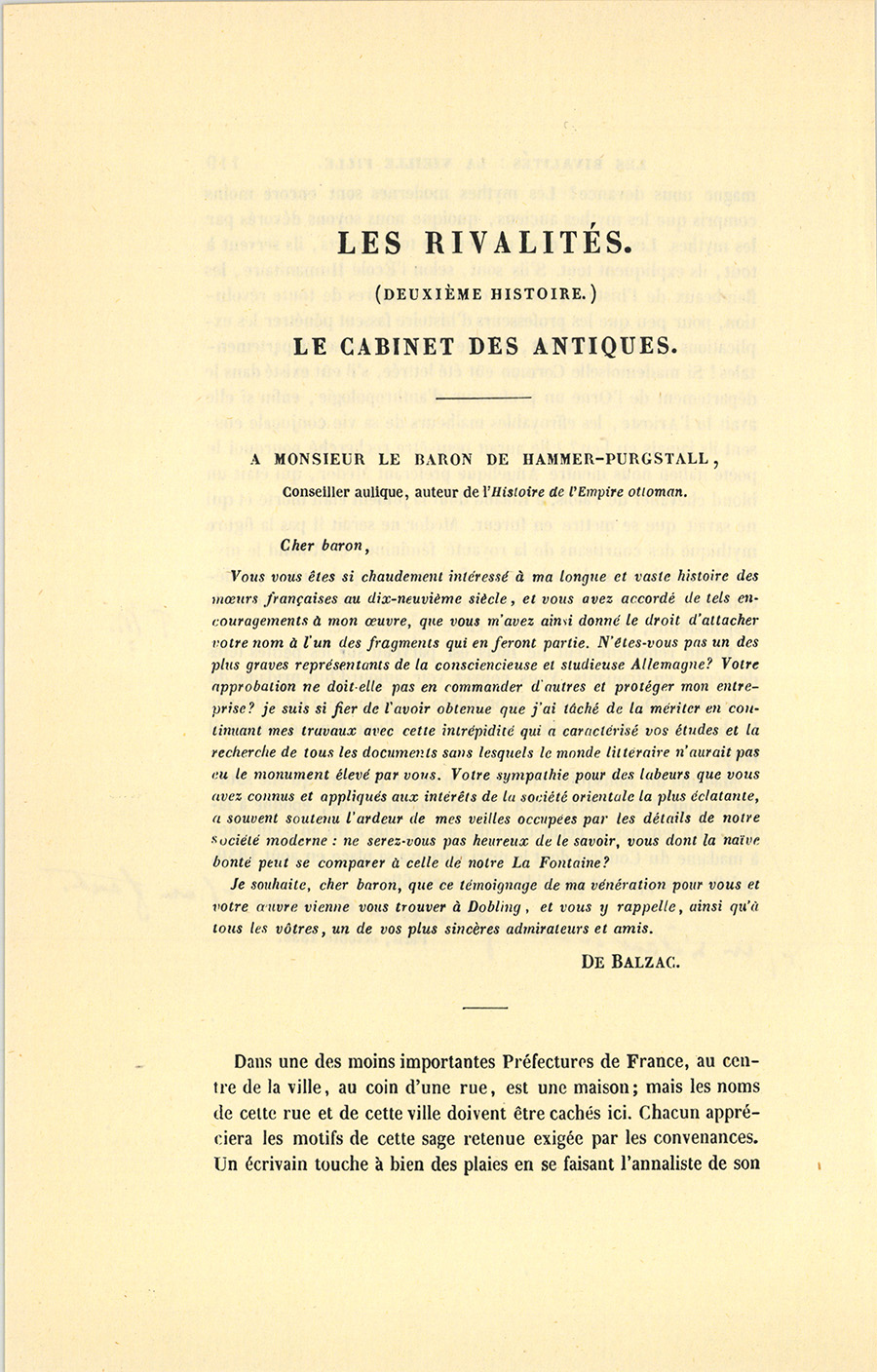 Vous vous êtes si chaudement intéressé à ma longue et vaste histoire des mœurs françaises au dix-neuvième siècle, et vous avez accordé de tels encouragements à mon œuvre, que vous m’avez ainsi donné le droit d’attacher votre nom à l’un des fragments qui en feront partie. N’êtes-vous pas un des plus graves représentants de la consciencieuse et studieuse Allemagne ? Votre approbation ne doit-elle pas en commander d’autres et protéger mon entreprise ? je suis si fier de l’avoir obtenue que j’ai tâché de la mériter en continuant mes travaux avec cette intrépidité qui a caractérisé vos études et la recherche de tous les documents sans lesquels le monde littéraire n’aurait pas eu le monument élevé par vous. Votre sympathie pour des labeurs que vous avez connus et appliqués aux intérêts de la société orientale la plus éclatante, a souvent soutenu l’ardeur de mes veilles occupées par les détails de notre société moderne : ne serez-vous pas heureux de le savoir, vous dont la naïve bonté peut se comparer à celle de notre La Fontaine ?
