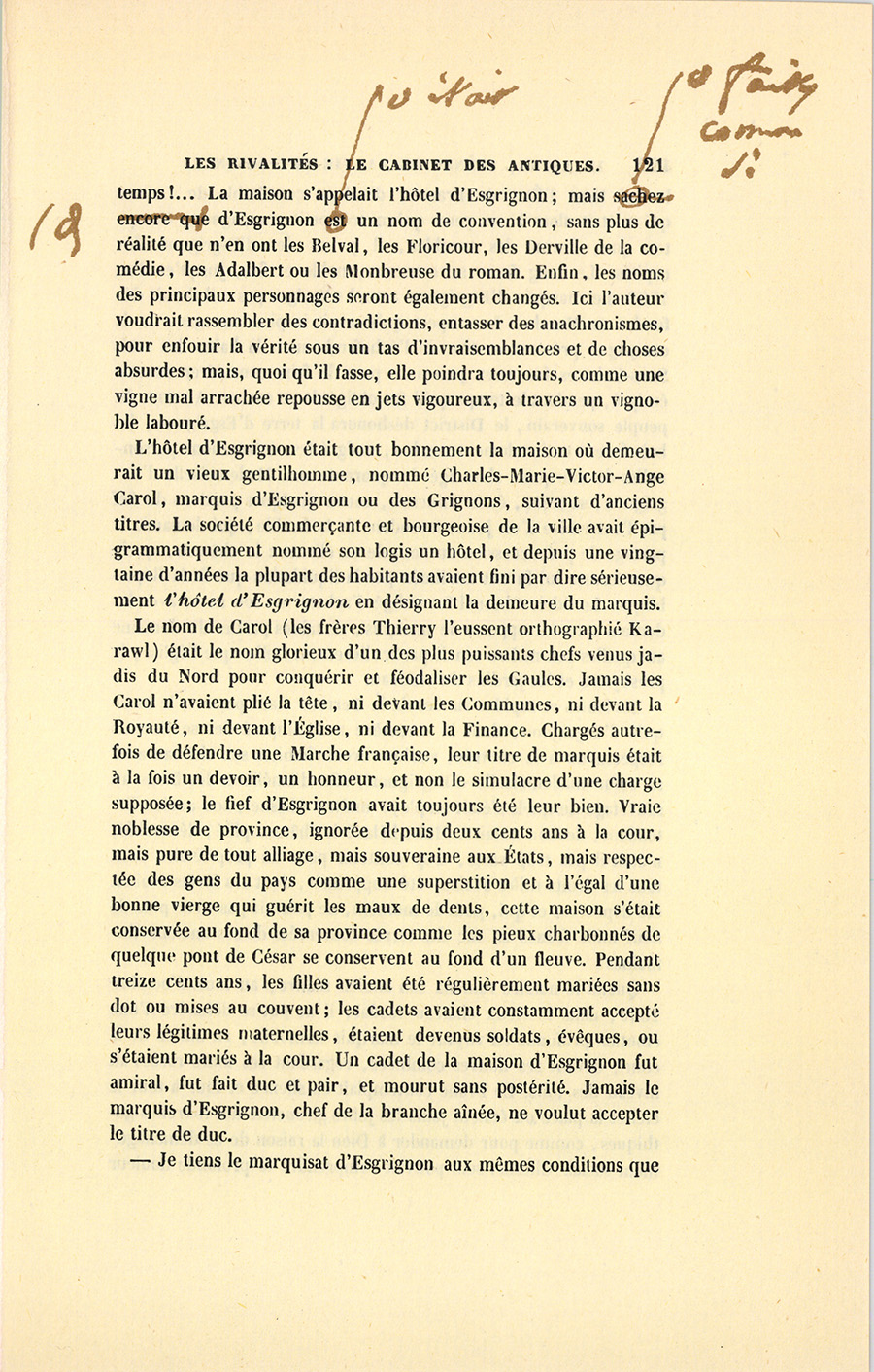 Dans une des moins importantes Préfectures de France, au centre de la ville, au coin d’une rue, est une maison ; mais les noms de cette rue et de cette ville doivent être cachés ici. Chacun appréciera les motifs de cette sage retenue exigée par les convenances. Un écrivain touche à bien des plaies en se faisant l’annaliste de son {p. 121} temps !… La maison s’appelait l’hôtel d’Esgrignon ; mais faites comme si d’Esgrignon était un nom de convention, sans plus de réalité que n’en ont les Belval, les Floricour, les Derville de la comédie, les Adalbert ou les Monbreuse du roman. Enfin, les noms des principaux personnages seront également changés. Ici l’auteur voudrait rassembler des contradictions, entasser des anachronismes, pour enfouir la vérité sous un tas d’invraisemblances et de choses absurdes ; mais, quoi qu’il fasse, elle poindra toujours, comme une vigne mal arrachée repousse en jets vigoureux, à travers un vignoble labouré.