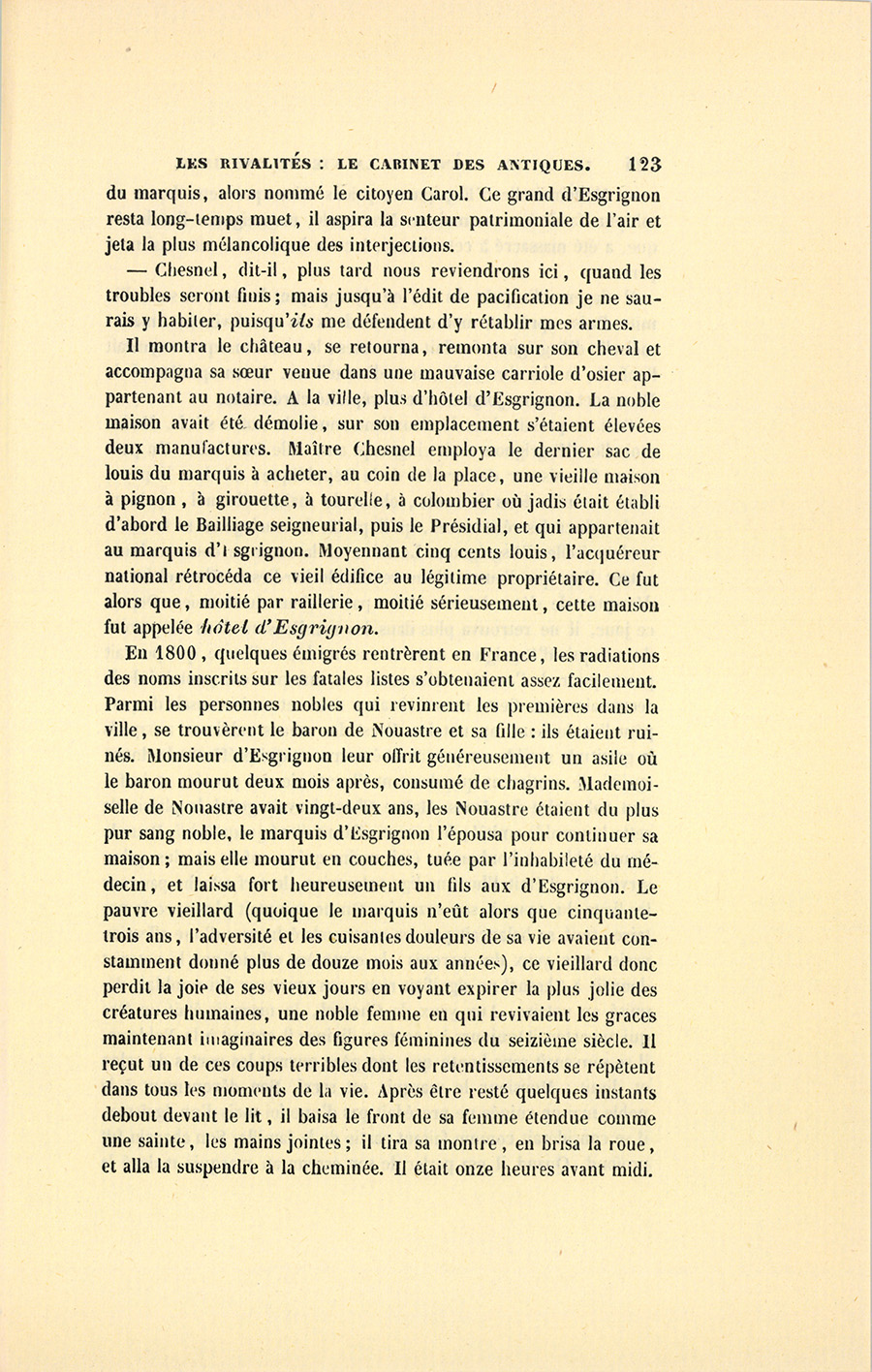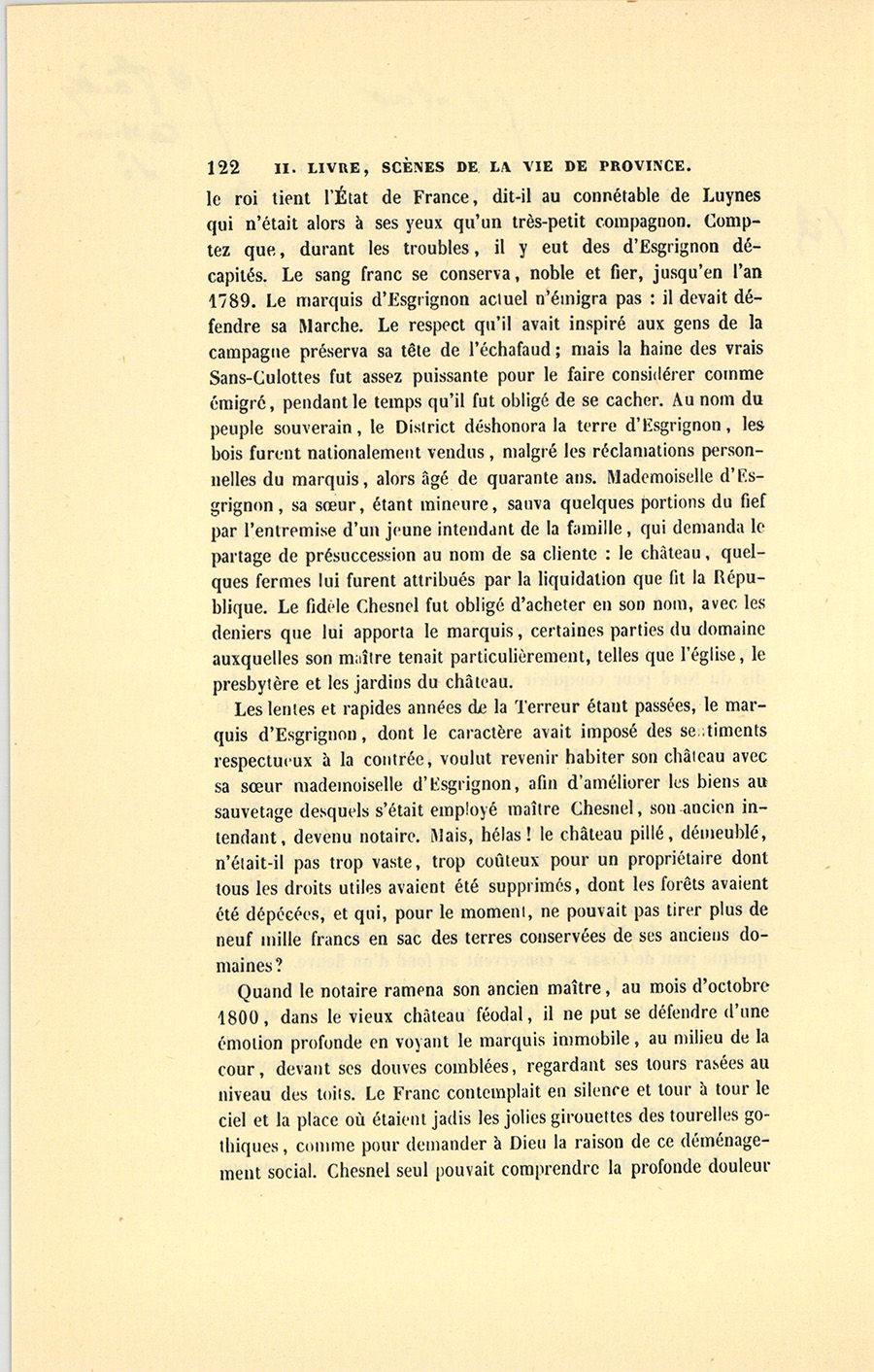Quand le notaire ramena son ancien maître, au mois d’octobre 1800, dans le vieux château féodal, il ne put se défendre d’une émotion profonde en voyant le marquis immobile, au milieu de la cour, devant ses douves comblées, regardant ses tours rasées au niveau des toits. Le Franc contemplait en silence et tour à tour le ciel et la place où étaient jadis les jolies girouettes des tourelles gothiques, comme pour demander à Dieu la raison de ce déménagement social. Chesnel seul pouvait comprendre la profonde douleur {p. 123} du marquis, alors nommé le citoyen Carol. Ce grand d’Esgrignon resta long-temps muet, il aspira la senteur patrimoniale de l’air et jeta la plus mélancolique des interjections.