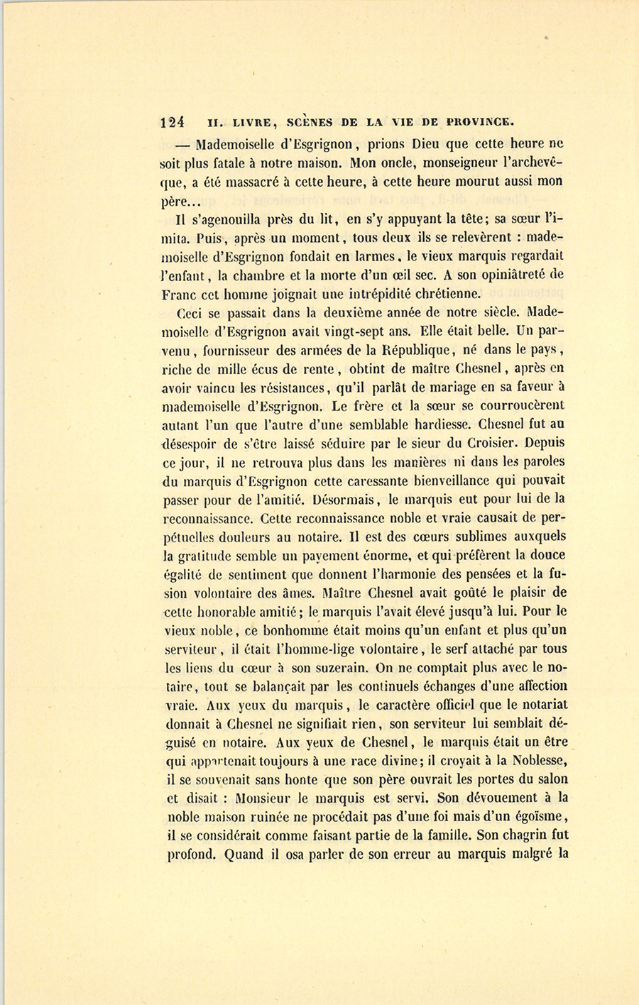 {p. 124} – Mademoiselle d’Esgrignon, prions Dieu que cette heure ne soit plus fatale à notre maison. Mon oncle, monseigneur l’archevêque, a été massacré à cette heure, à cette heure mourut aussi mon père…