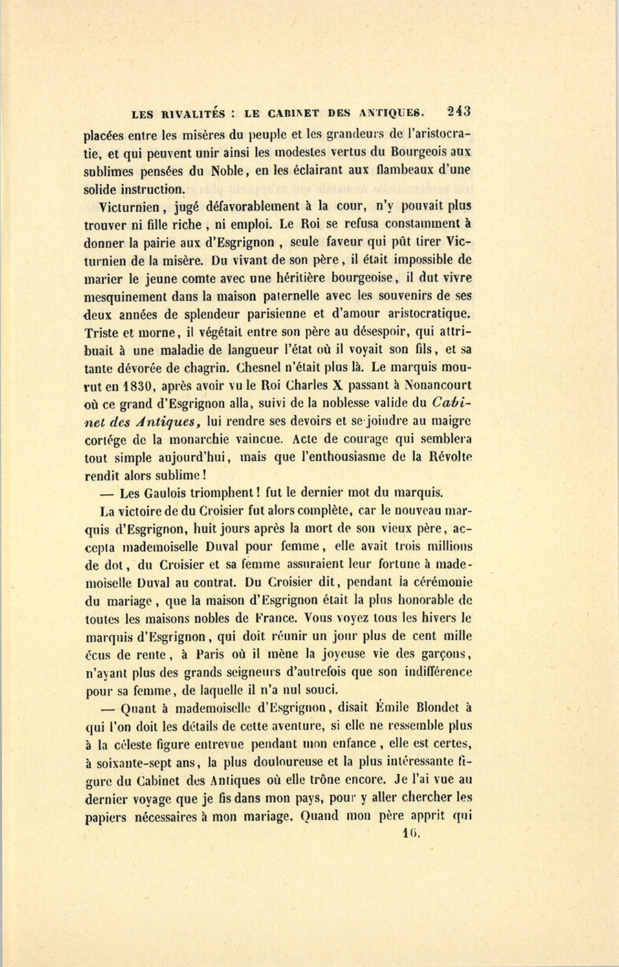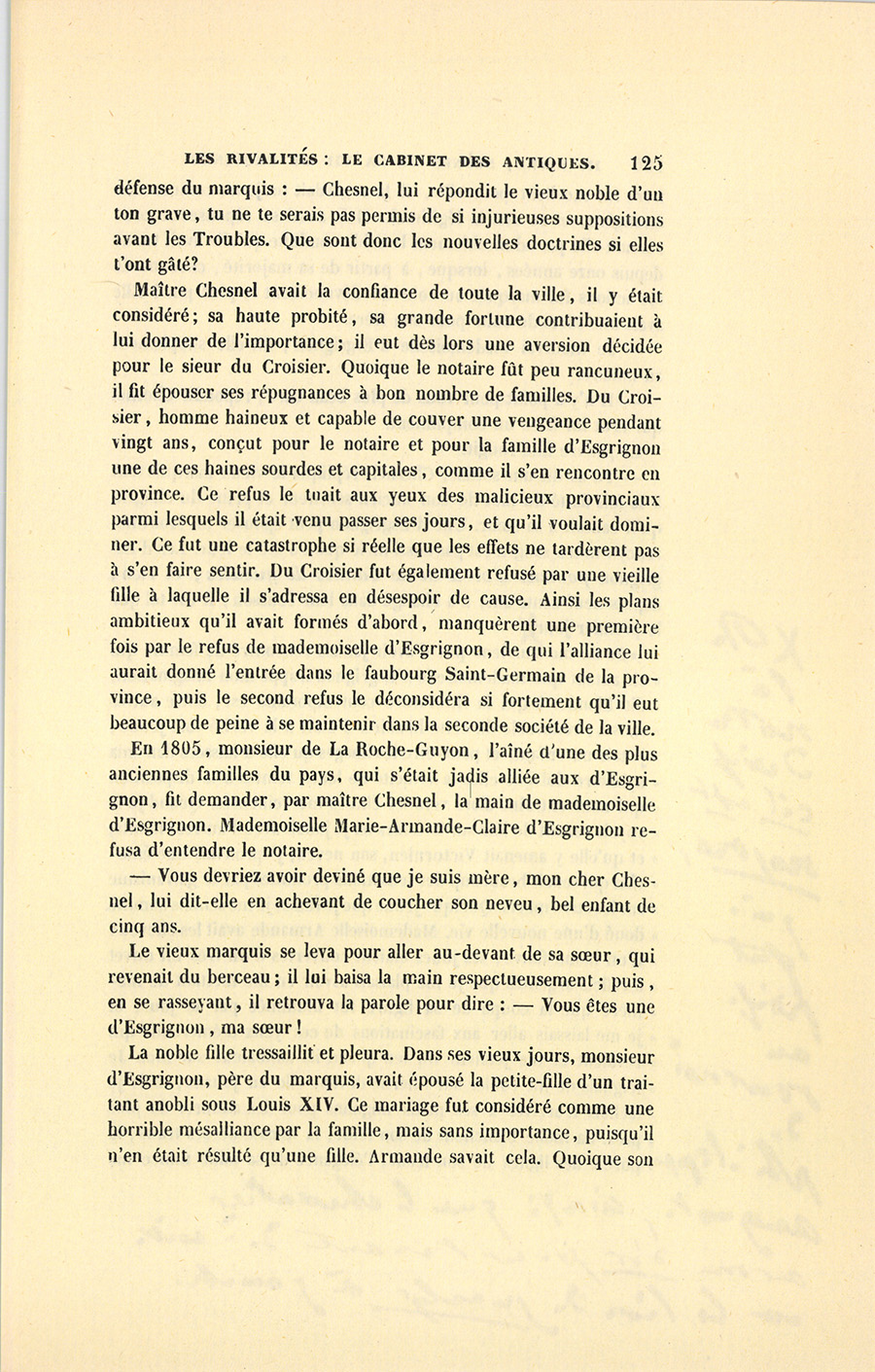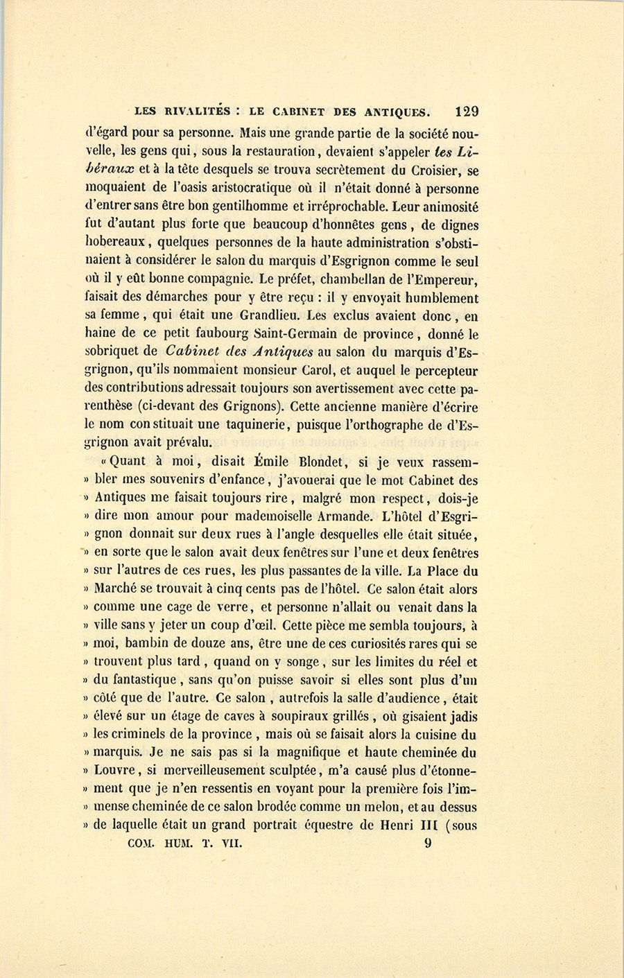 Pendant les années 1804 et 1805 les deux tiers des familles émigrées revinrent en France, et presque toutes celles de la province où demeurait monsieur le marquis d’Esgrignon se replantèrent dans le sol paternel. Mais il y eut alors des défections. Quelques gentilshommes prirent du service, soit dans les armées de Napoléon, soit à sa cour ; d’autres firent des alliances avec certains parvenus. Tous ceux qui entrèrent dans le mouvement impérial reconstituèrent leurs fortunes et retrouvèrent leurs bois par la munificence de l’empereur, beaucoup d’entre eux restèrent à Paris ; mais il y eut huit ou neuf familles nobles qui demeurèrent fidèles à la noblesse proscrite et à leurs idées sur la monarchie écroulée : les Roche-Guyon, les Nouâtre, les Verneuil, les Castéran1, les Troisville, etc., ceux-ci pauvres, ceux-là riches ; mais le plus ou le moins d’or ne se comptait pas ; l’antiquité, la conservation de la race étaient tout pour elles, absolument comme pour un antiquaire le poids de la médaille est peu de chose en comparaison et de la pureté des lettres et de la tête et de l’ancienneté du coin. Ces familles prirent pour chef le marquis d’Esgrignon : sa maison devint leur cénacle. Là l’Empereur et Roi ne fut jamais que monsieur de Buonaparte ; là le souverain était Louis XVIII, alors à Mittau ; là le Département fut toujours la Province et la Préfecture une Intendance. L’admirable conduite, la loyauté de gentilhomme, l’intrépidité du marquis d’Esgrignon lui valaient de sincères hommages ; de même que ses malheurs, sa constance, son inaltérable attachement à ses opinions, lui méritaient en ville un respect universel. Cette admirable ruine avait toute la majesté des grandes choses détruites. Sa délicatesse chevaleresque était si bien connue qu’en plusieurs circonstances il fut pris par des plaideurs pour unique arbitre. Tous les gens bien élevés qui appartenaient au système impérial, et même les autorités, avaient pour ses préjugés autant de complaisance qu’ils montraient {p. 129} d’égard pour sa personne. Mais une grande partie de la société nouvelle, les gens qui, sous la restauration, devaient s’appeler les Libéraux et à la tête desquels se trouva secrètement du Croisier, se moquaient de l’oasis aristocratique où il n’était donné à personne d’entrer sans être bon gentilhomme et irréprochable. Leur animosité fut d’autant plus forte que beaucoup d’honnêtes gens, de dignes hobereaux, quelques personnes de la haute administration s’obstinaient à considérer le salon du marquis d’Esgrignon comme le seul où il y eût bonne compagnie. Le préfet, chambellan de l’Empereur, faisait des démarches pour y être reçu : il y envoyait humblement sa femme, qui était une Grandlieu. Les exclus avaient donc, en haine de ce petit faubourg Saint-Germain de province, donné le sobriquet de Cabinet des Antiques au salon du marquis d’Esgrignon, qu’ils nommaient monsieur Carol, et auquel le percepteur des contributions adressait toujours son avertissement avec cette parenthèse (ci-devant des Grignons). Cette ancienne manière d’écrire le nom constituait une taquinerie, puisque l’orthographe de d’Esgrignon avait prévalu.