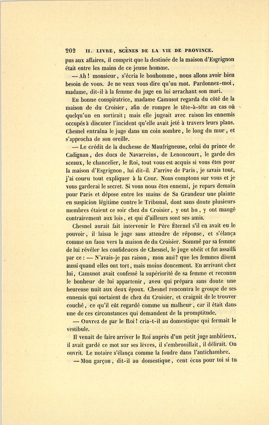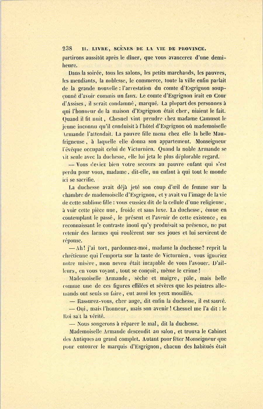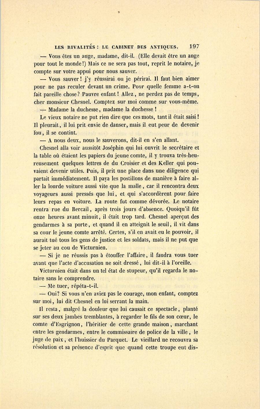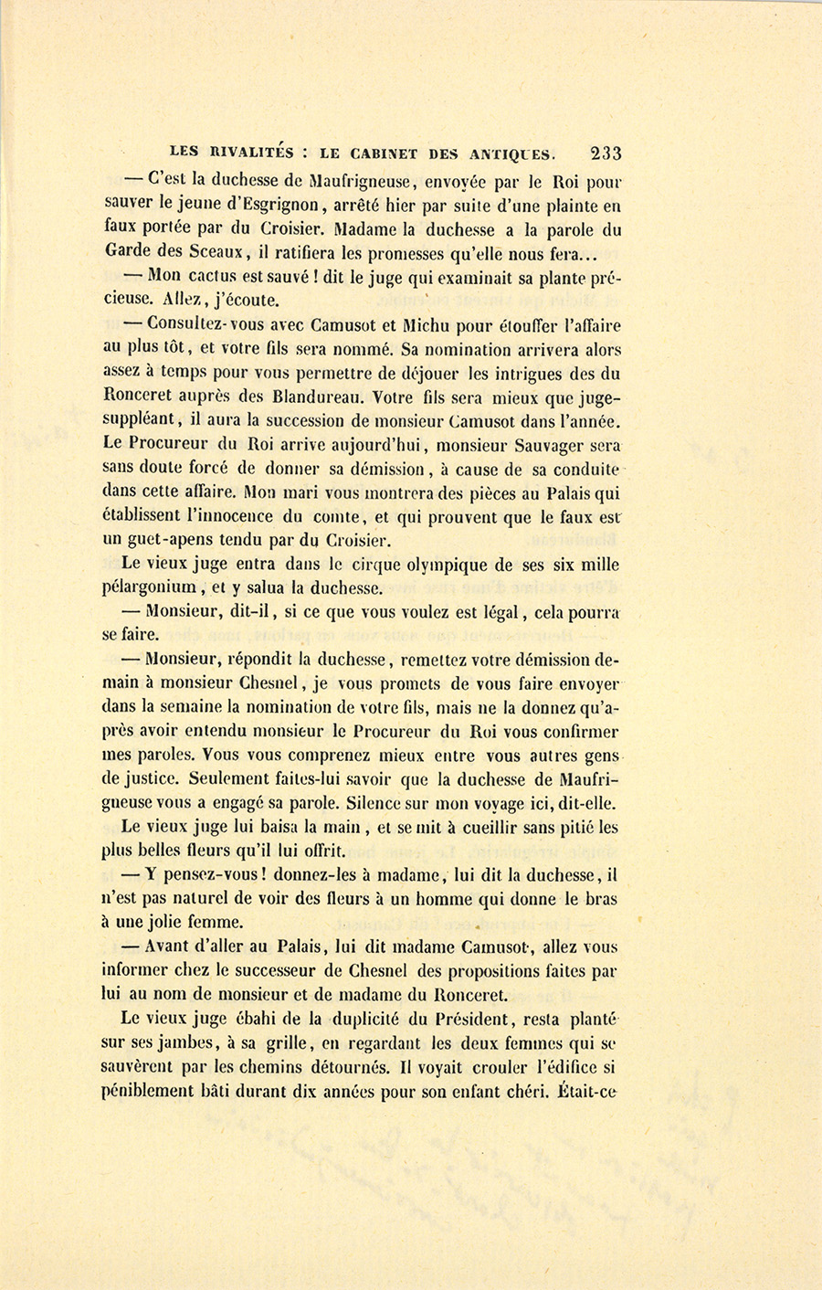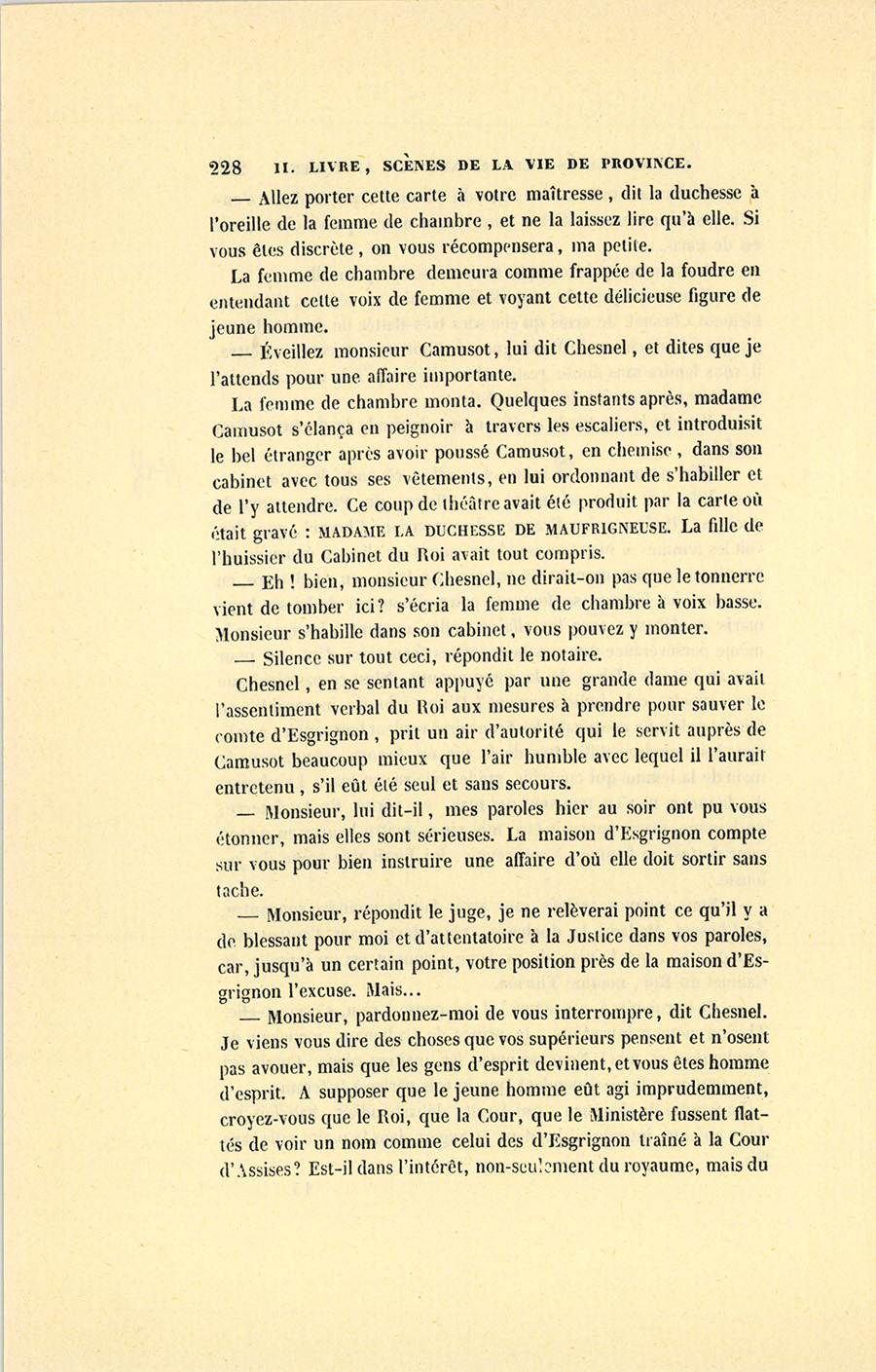 {p. 233} – C’est la duchesse de Maufrigneuse, envoyée par le Roi pour sauver le jeune d’Esgrignon, arrêté hier par suite d’une plainte en faux portée par du Croisier. Madame la duchesse a la parole du Garde des Sceaux, il ratifiera les promesses qu’elle nous fera…