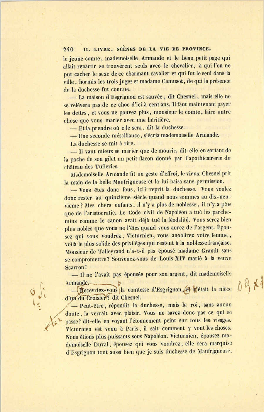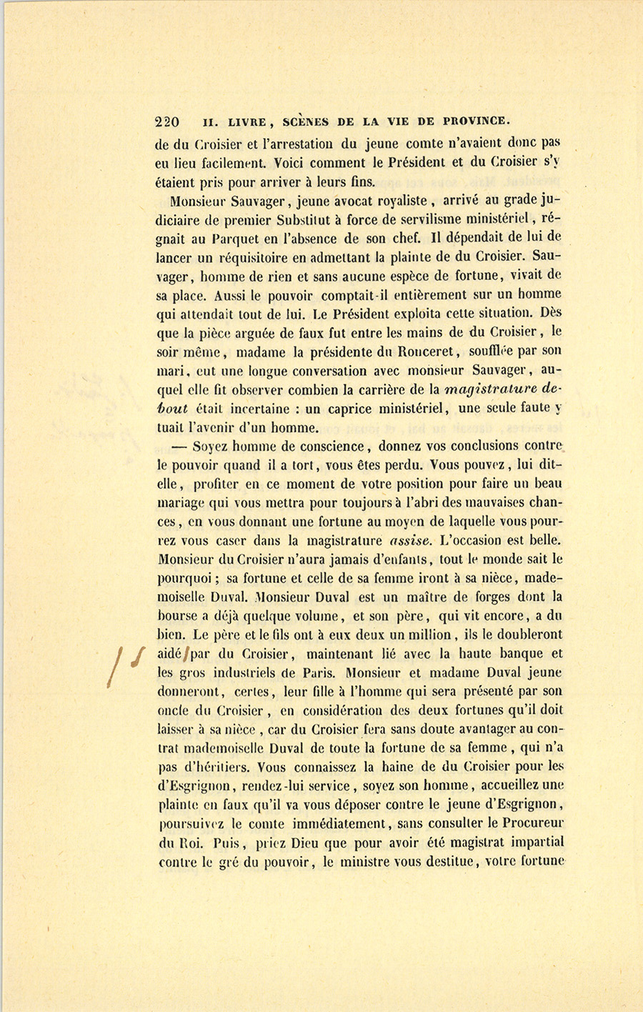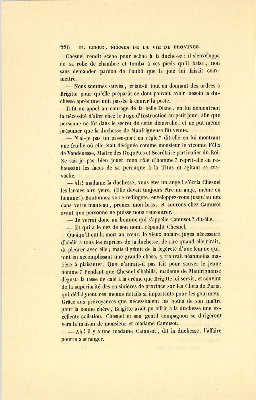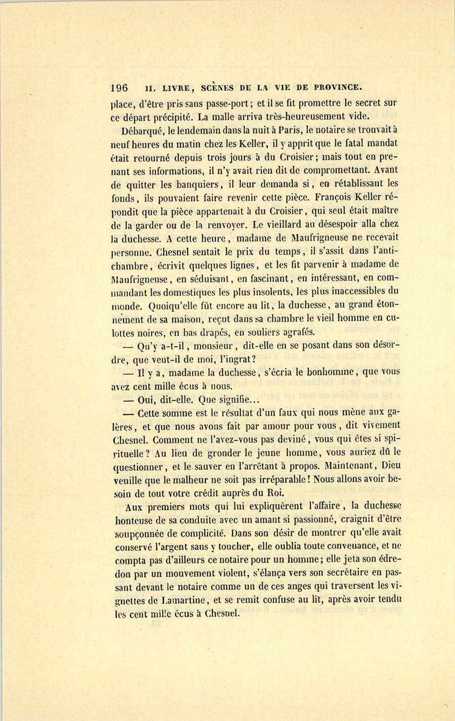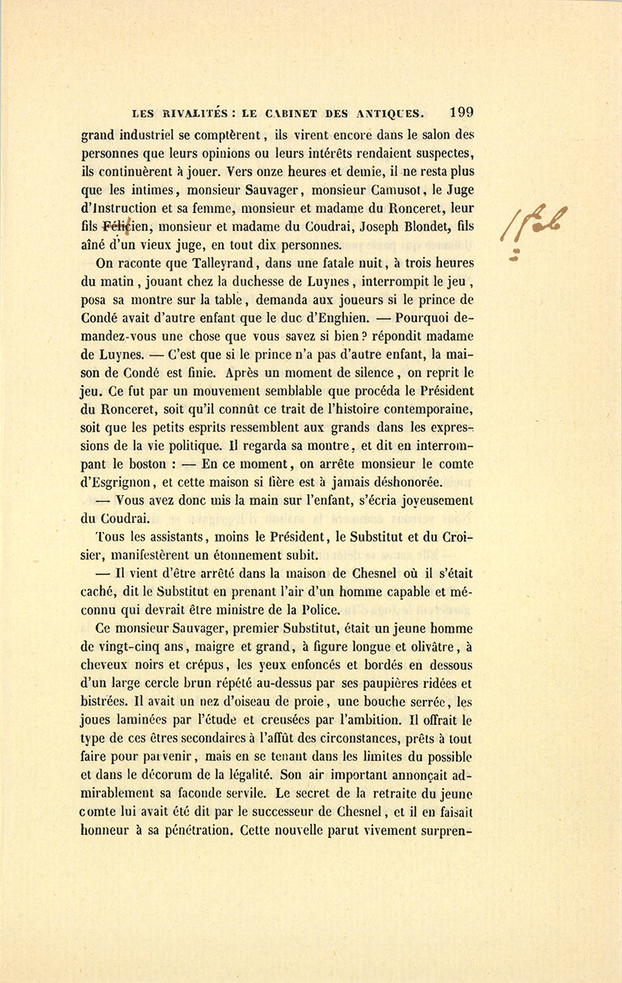 {p. 233} – C’est la duchesse de Maufrigneuse, envoyée par le Roi pour sauver le jeune d’Esgrignon, arrêté hier par suite d’une plainte en faux portée par du Croisier. Madame la duchesse a la parole du Garde des Sceaux, il ratifiera les promesses qu’elle nous fera…