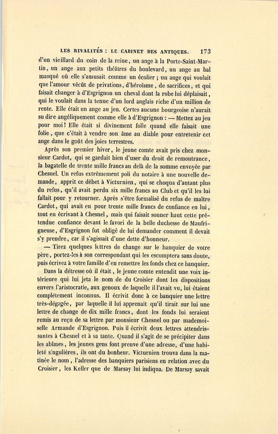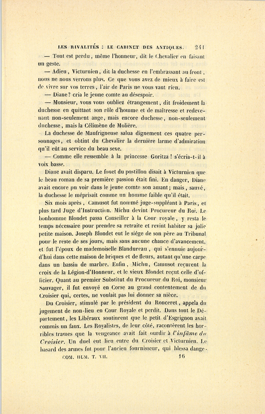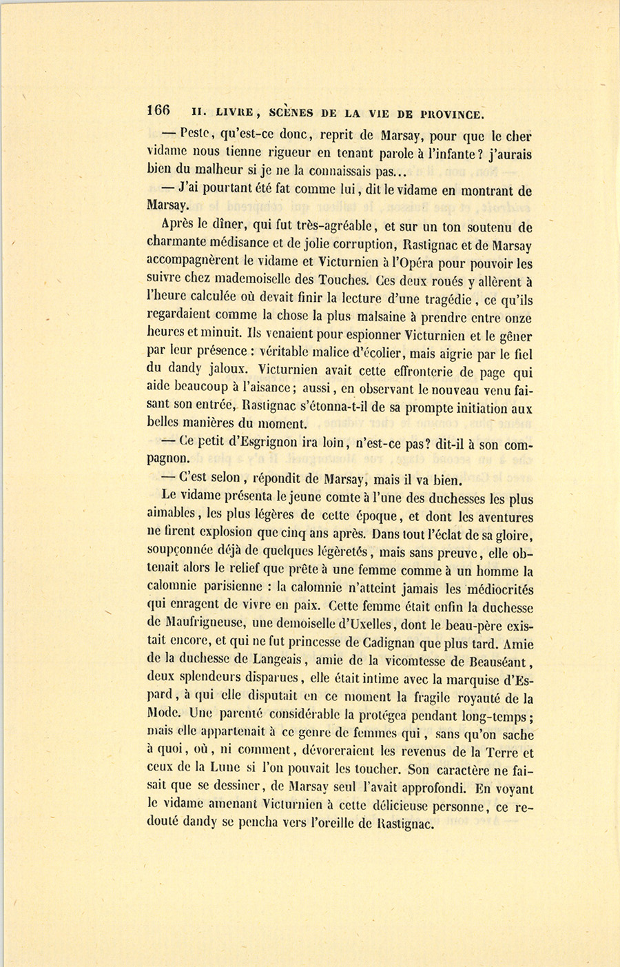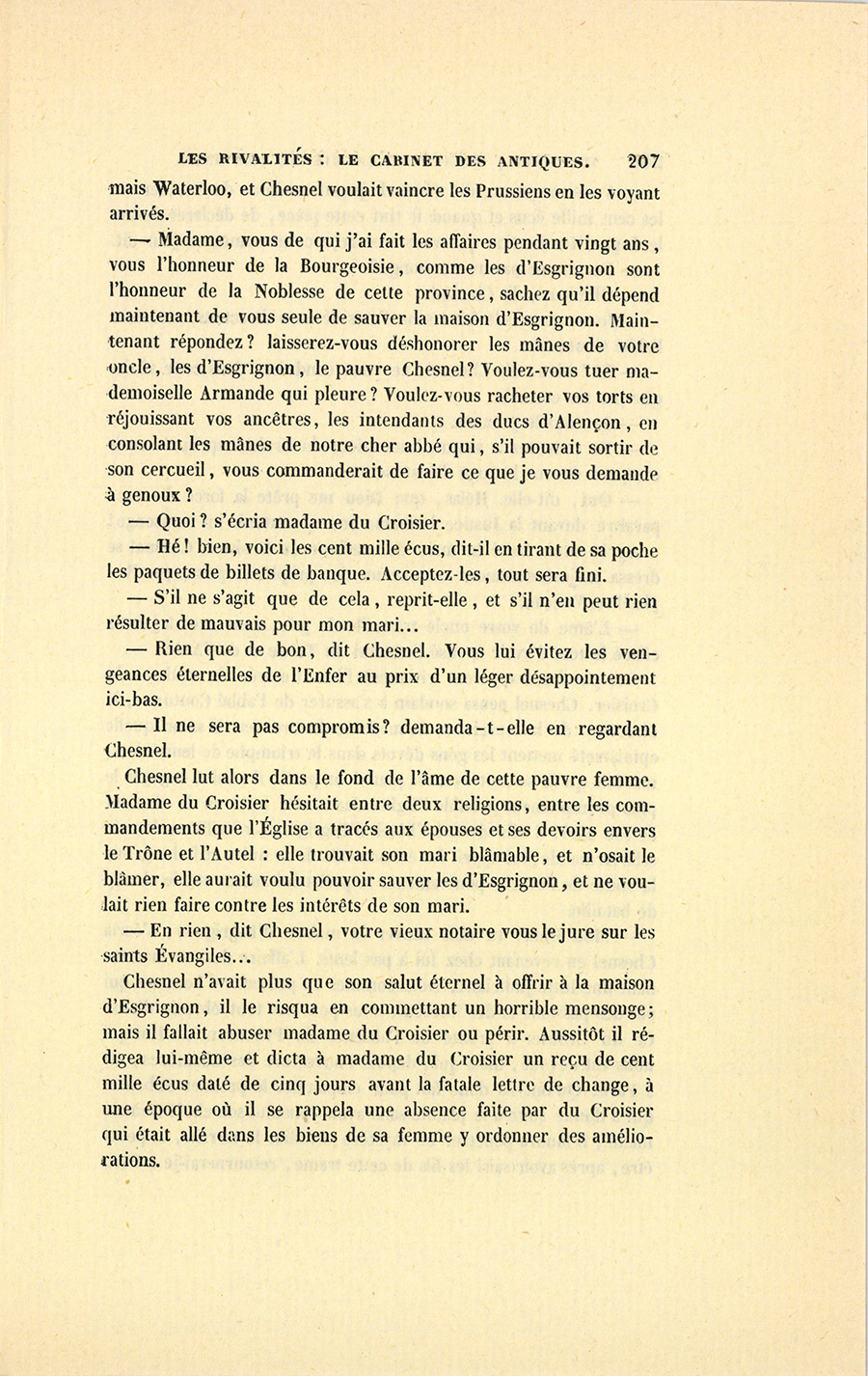 {p. 233} – C’est la duchesse de Maufrigneuse, envoyée par le Roi pour sauver le jeune d’Esgrignon, arrêté hier par suite d’une plainte en faux portée par du Croisier. Madame la duchesse a la parole du Garde des Sceaux, il ratifiera les promesses qu’elle nous fera…