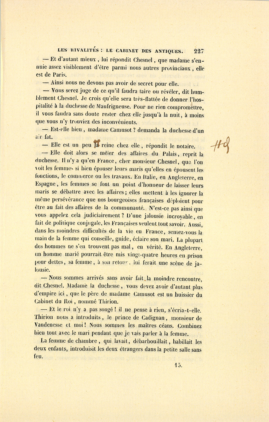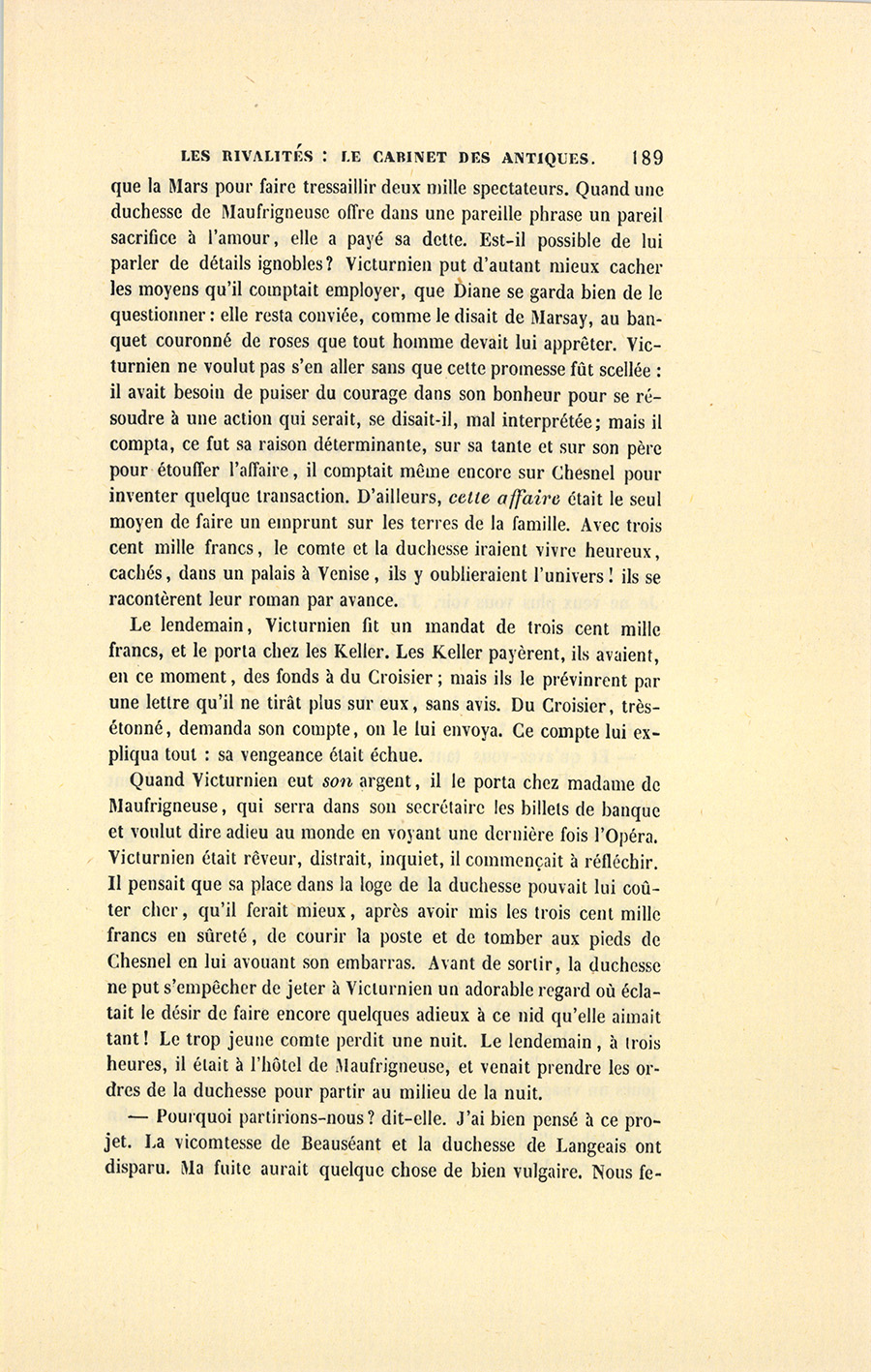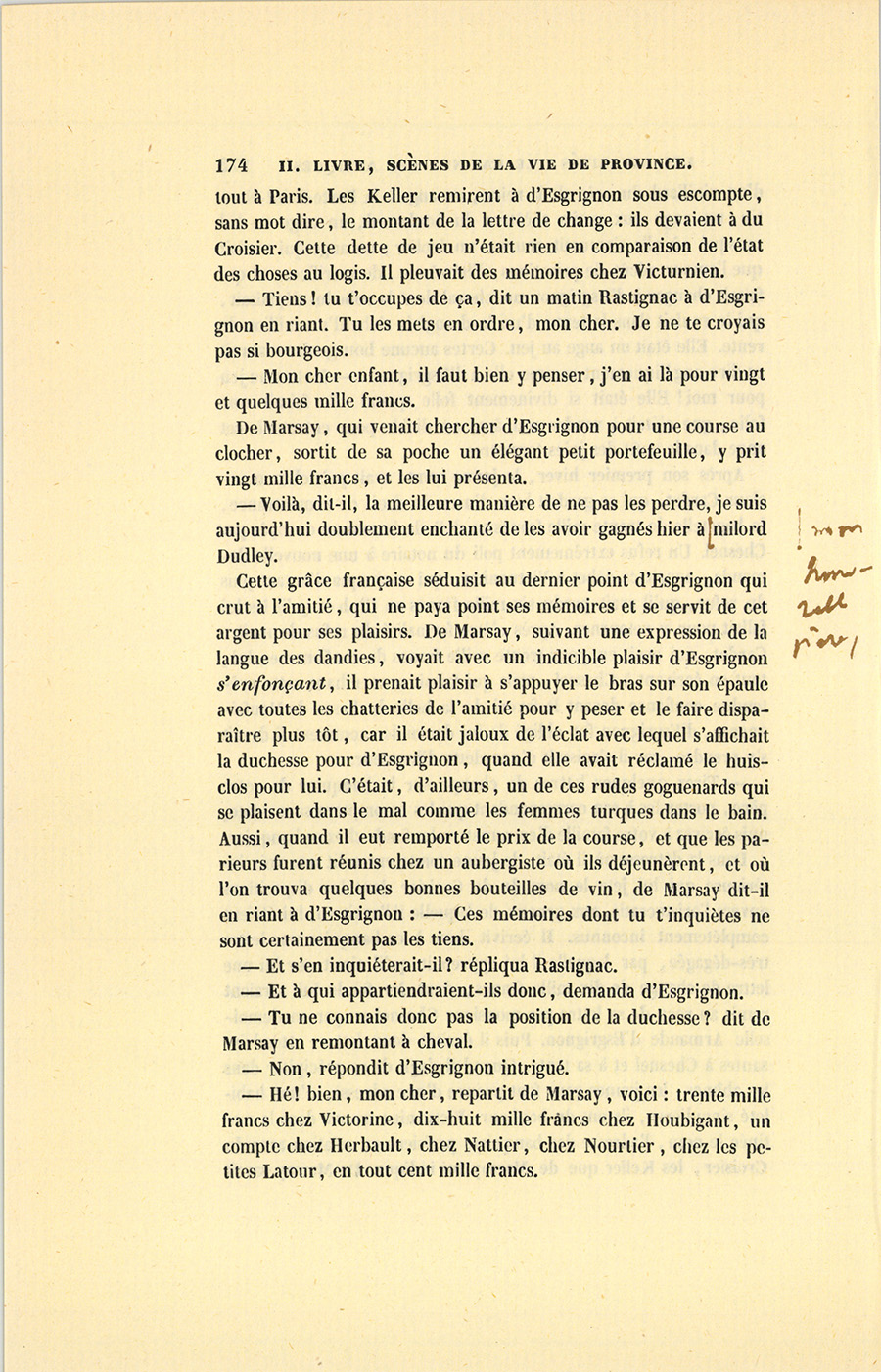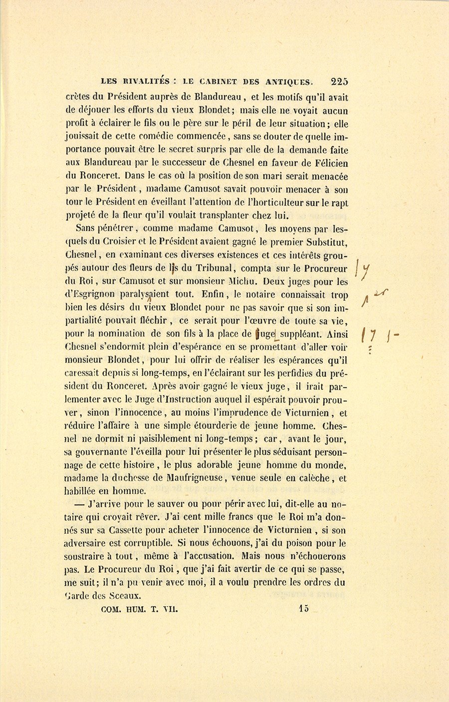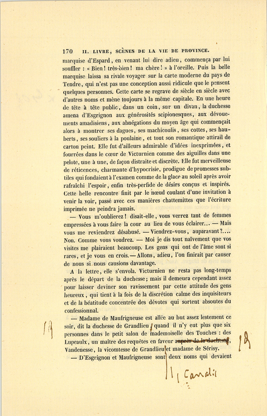 {p. 233} – C’est la duchesse de Maufrigneuse, envoyée par le Roi pour sauver le jeune d’Esgrignon, arrêté hier par suite d’une plainte en faux portée par du Croisier. Madame la duchesse a la parole du Garde des Sceaux, il ratifiera les promesses qu’elle nous fera…