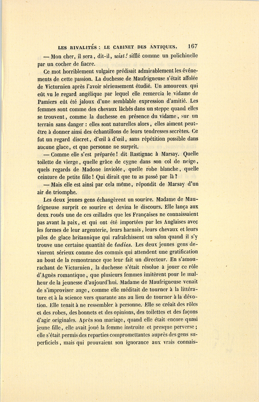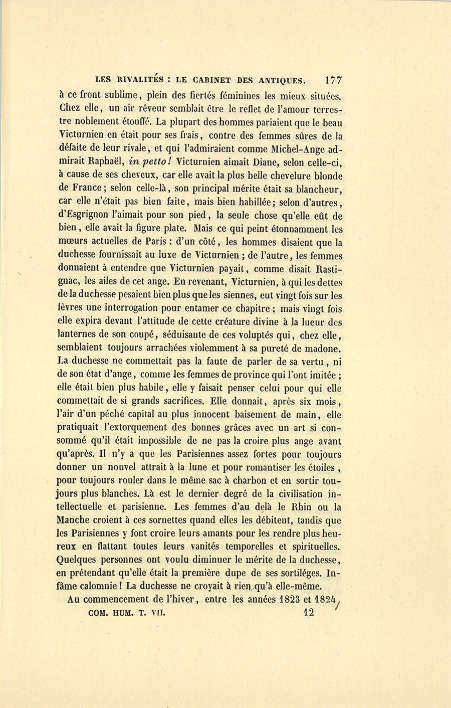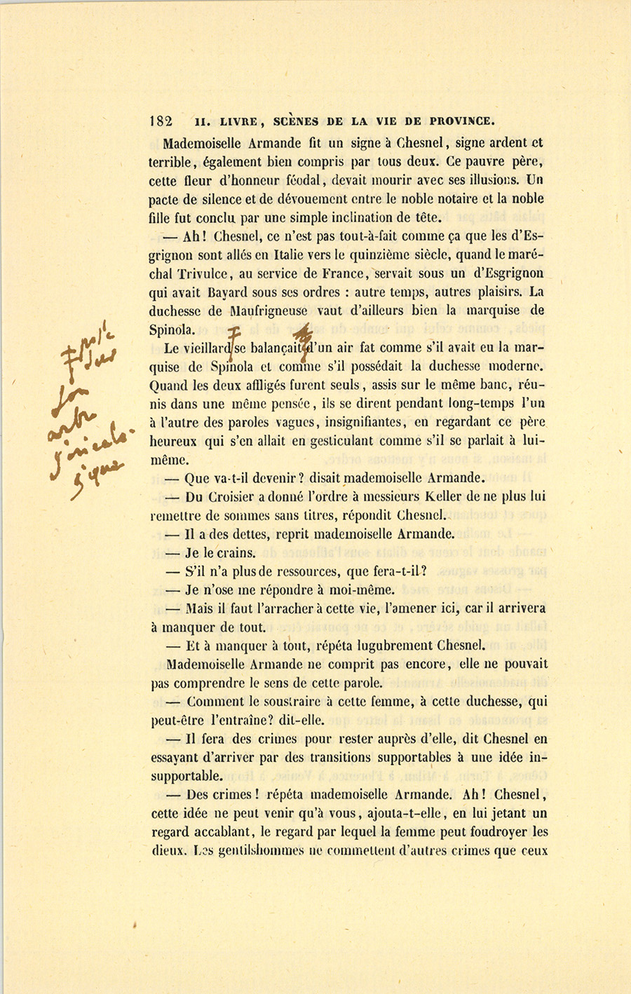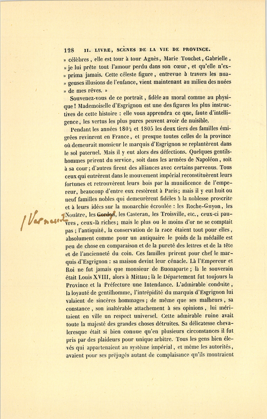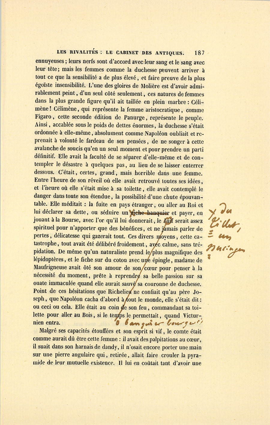 {p. 233} – C’est la duchesse de Maufrigneuse, envoyée par le Roi pour sauver le jeune d’Esgrignon, arrêté hier par suite d’une plainte en faux portée par du Croisier. Madame la duchesse a la parole du Garde des Sceaux, il ratifiera les promesses qu’elle nous fera…