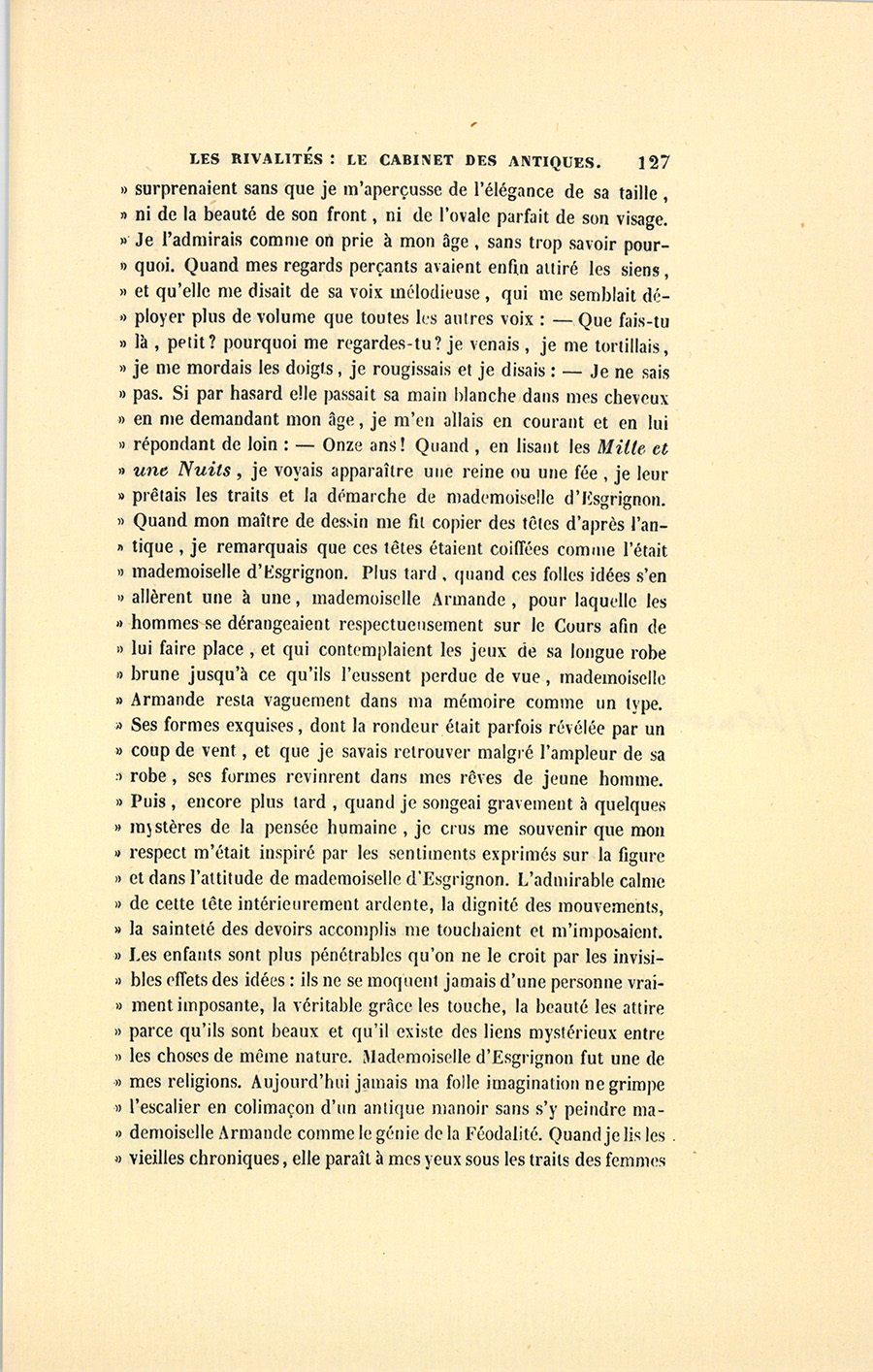 « Je ne me souviens pas d’avoir jamais rencontré de femme qui ait autant que mademoiselle d’Esgrignon frappé mon imagination, dit Blondet à qui la littérature contemporaine est, entre autres choses, redevable de cette histoire. J’étais à la vérité fort jeune, j’étais un enfant, et peut-être les images qu’elle a laissées dans ma mémoire doivent-elles la vivacité de leurs teintes à la disposition qui nous entraîne alors vers les choses merveilleuses. Quand je la voyais venant de loin sur le Cours où je jouais avec d’autres enfants, et qu’elle y amenait Victurnien, son neveu, j’éprouvais une émotion qui tenait beaucoup des sensations produites par le galvanisme sur les êtres morts. Quelque jeune que je fusse, je me sentais comme doué d’une nouvelle vie. Mademoiselle Armande avait les cheveux d’un blond fauve, ses joues étaient couvertes d’un très-fin duvet à reflets argentés que je me plaisais à voir en me mettant de manière que la coupe de sa figure fût illuminée par le jour, et je me laissais aller aux fascinations de ces yeux d’émeraude qui rêvaient et me jetaient du feu quand ils tombaient sur moi. Je feignais de me rouler sur l’herbe devant elle en jouant, mais je tâchais d’arriver à ses pieds mignons pour les admirer de plus près. La molle blancheur de son teint, la finesse de ses traits, la pureté des lignes de son front, l’élégance de sa taille mince me {p. 127} surprenaient sans que je m’aperçusse de l’élégance de sa taille, ni de la beauté de son front, ni de l’ovale parfait de son visage. Je l’admirais comme on prie à mon âge, sans trop savoir pourquoi. Quand mes regards perçants avaient enfin attiré les siens, et qu’elle me disait de sa voix mélodieuse, qui me semblait déployer plus de volume que toutes les autres voix : – Que fais-tu là, petit ? pourquoi me regardes-tu ? je venais, je me tortillais, je me mordais les doigts, je rougissais et je disais : – Je ne sais pas. Si par hasard elle passait sa main blanche dans mes cheveux en me demandant mon âge, je m’en allais en courant et en lui répondant de loin : – Onze ans ! Quand, en lisant les Mille et une Nuits, je voyais apparaître une reine ou une fée, je leur prêtais les traits et la démarche de mademoiselle d’Esgrignon. Quand mon maître de dessin me fit copier des têtes d’après l’antique, je remarquais que ces têtes étaient coiffées comme l’était mademoiselle d’Esgrignon. Plus tard, quand ces folles idées s’en allèrent une à une, mademoiselle Armande, pour laquelle les hommes se dérangeaient respectueusement sur le Cours afin de lui faire place, et qui contemplaient les jeux de sa longue robe brune jusqu’à ce qu’ils l’eussent perdue de vue, mademoiselle Armande resta vaguement dans ma mémoire comme un type. Ses formes exquises, dont la rondeur était parfois révélée par un coup de vent, et que je savais retrouver malgré l’ampleur de sa robe, ses formes revinrent dans mes rêves de jeune homme. Puis, encore plus tard, quand je songeai gravement à quelques mystères de la pensée humaine, je crus me souvenir que mon respect m’était inspiré par les sentiments exprimés sur la figure et dans l’attitude de mademoiselle d’Esgrignon. L’admirable calme de cette tête intérieurement ardente, la dignité des mouvements, la sainteté des devoirs accomplis me touchaient et m’imposaient. Les enfants sont plus pénétrables qu’on ne le croit par les invisibles effets des idées : ils ne se moquent jamais d’une personne vraiment imposante, la véritable grâce les touche, la beauté les attire parce qu’ils sont beaux et qu’il existe des liens mystérieux entre les choses de même nature. Mademoiselle d’Esgrignon fut une de mes religions. Aujourd’hui jamais ma folle imagination ne grimpe l’escalier en colimaçon d’un antique manoir sans s’y peindre mademoiselle Armande comme le génie de la Féodalité. Quand je lis les vieilles chroniques, elle paraît à mes yeux sous les traits des femmes {p. 128} célèbres, elle est tour à tour Agnès, Marie Touchet, Gabrielle, je lui prête tout l’amour perdu dans son cœur, et qu’elle n’exprima jamais. Cette céleste figure, entrevue à travers les nuageuses illusions de l’enfance, vient maintenant au milieu des nuées de mes rêves. »